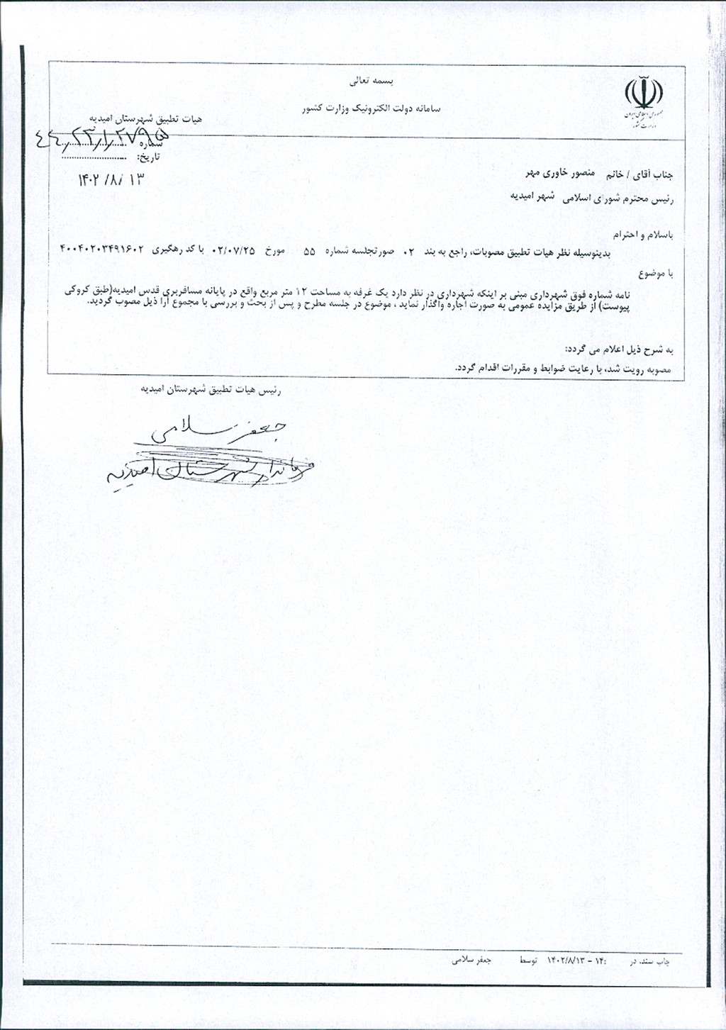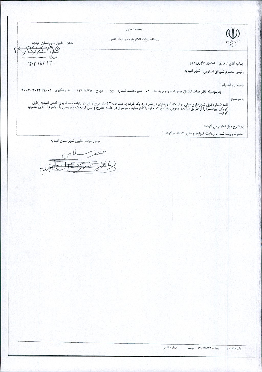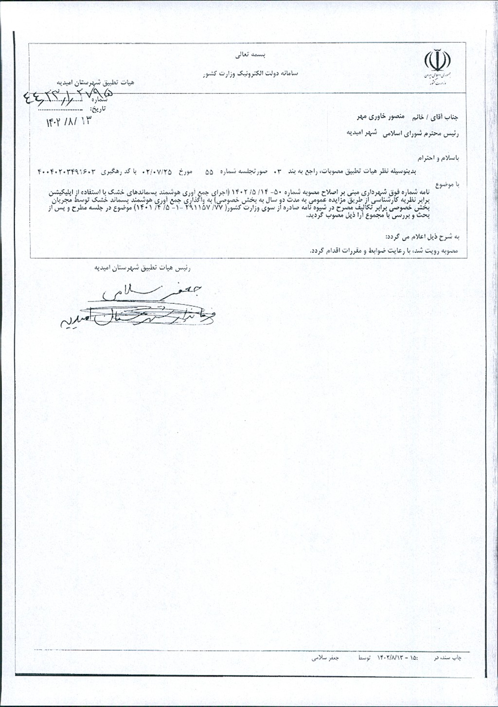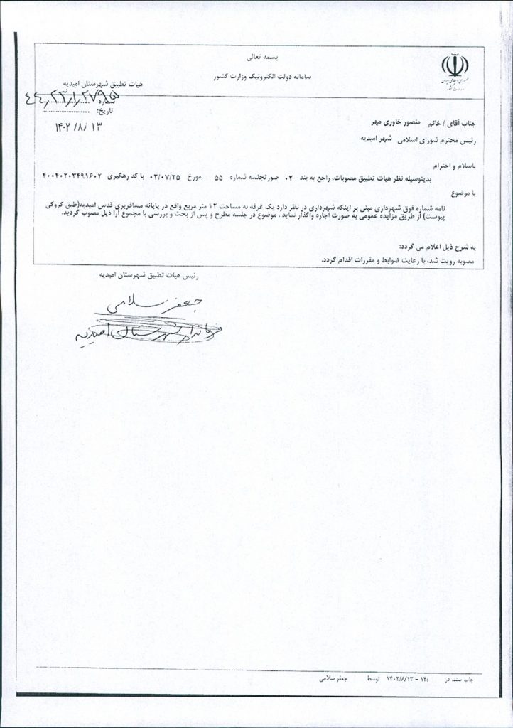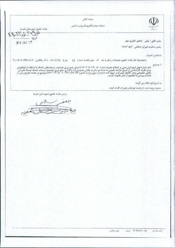 نظریه هیأت تطبیق جلسه شماره ۵۵ مورخ ۱۴۰۲/۰۷/۲۵ شورای اسلامی شهر امیدیه