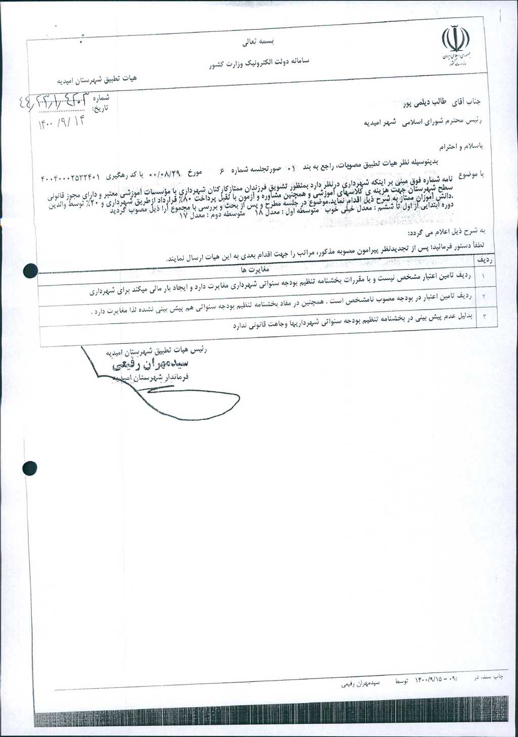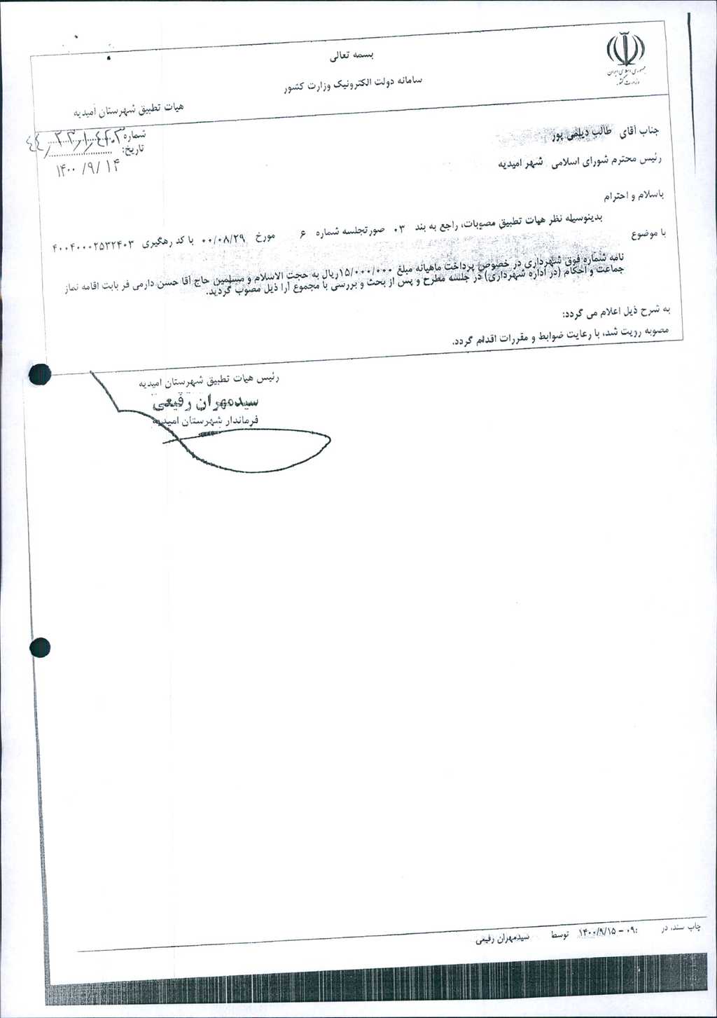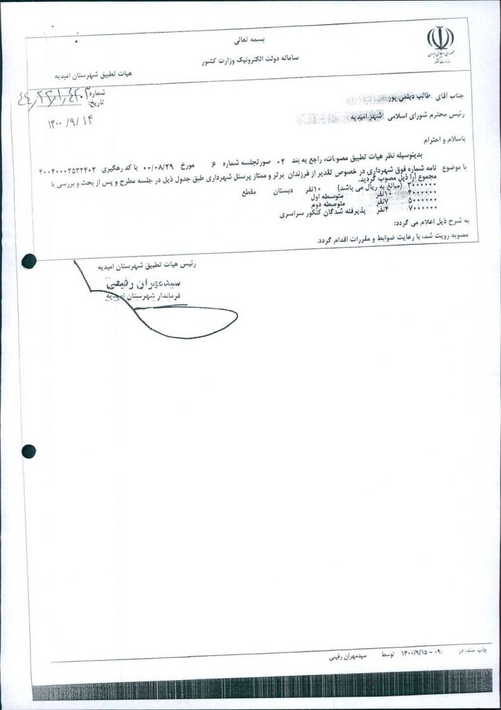 نظریه هیأت تطبیق جلسه شماره ۶ مورخ ۱۴۰۰/۸/۲۹ شورای اسلامی شهر امیدیه