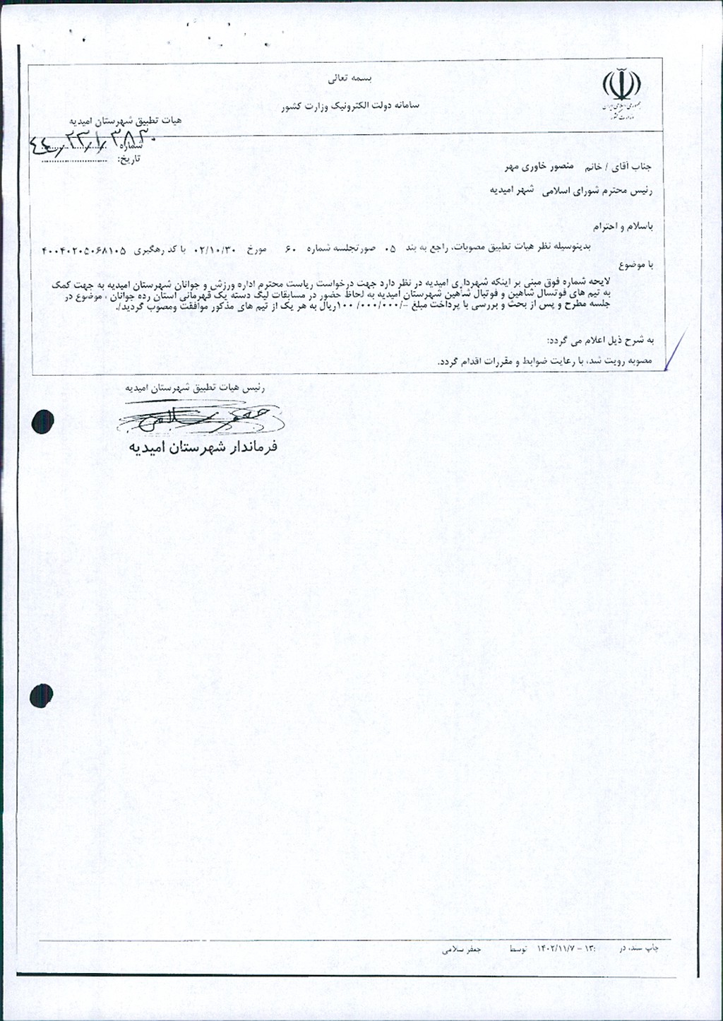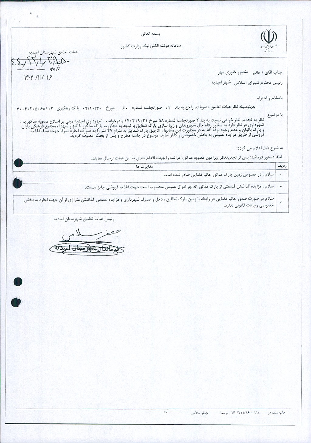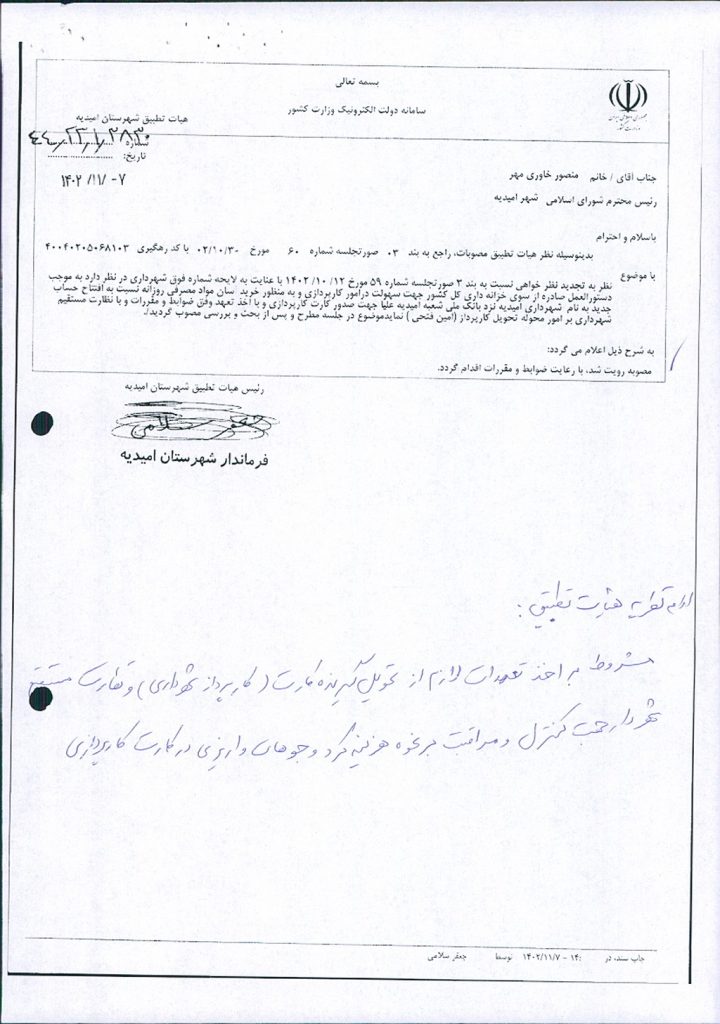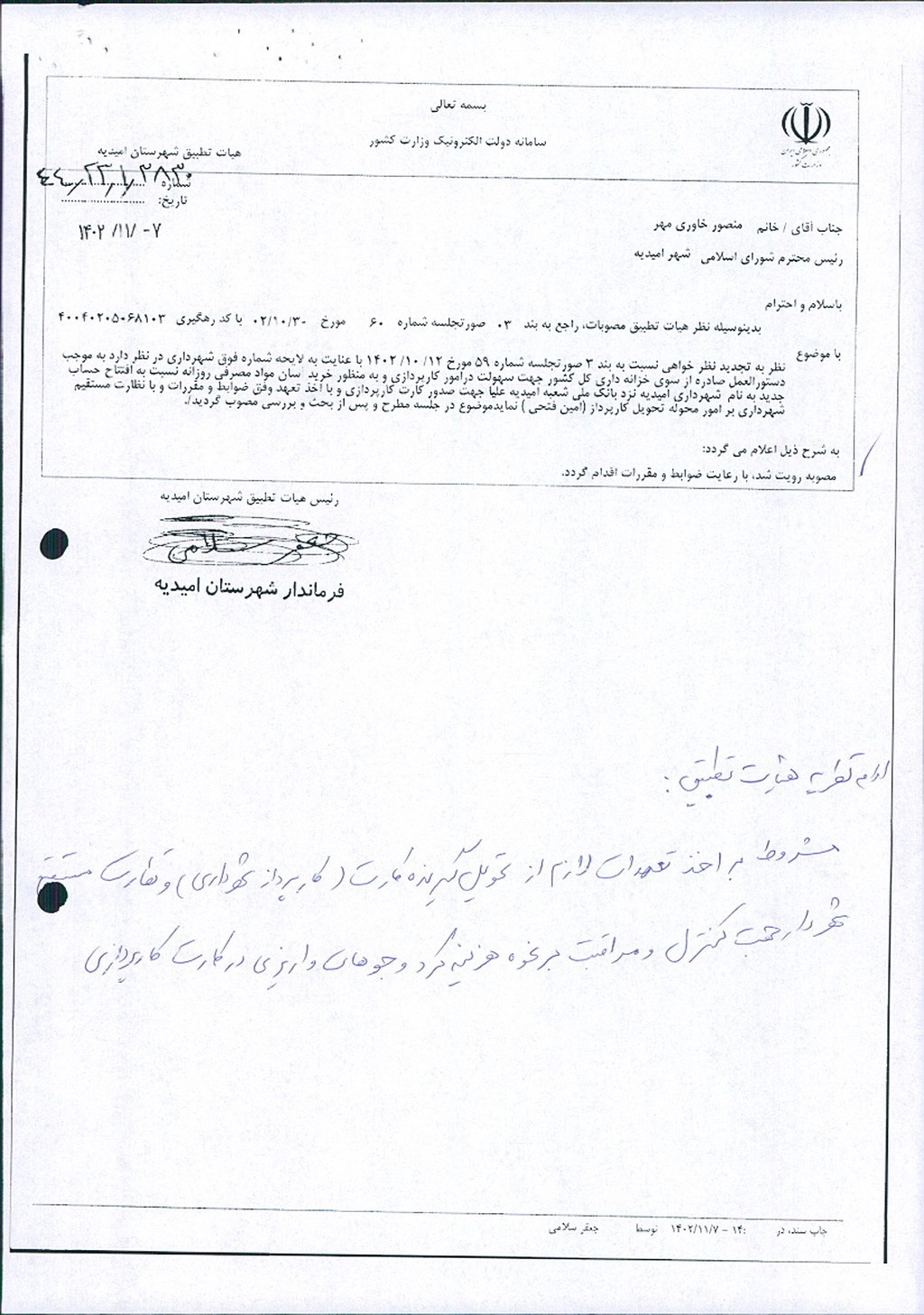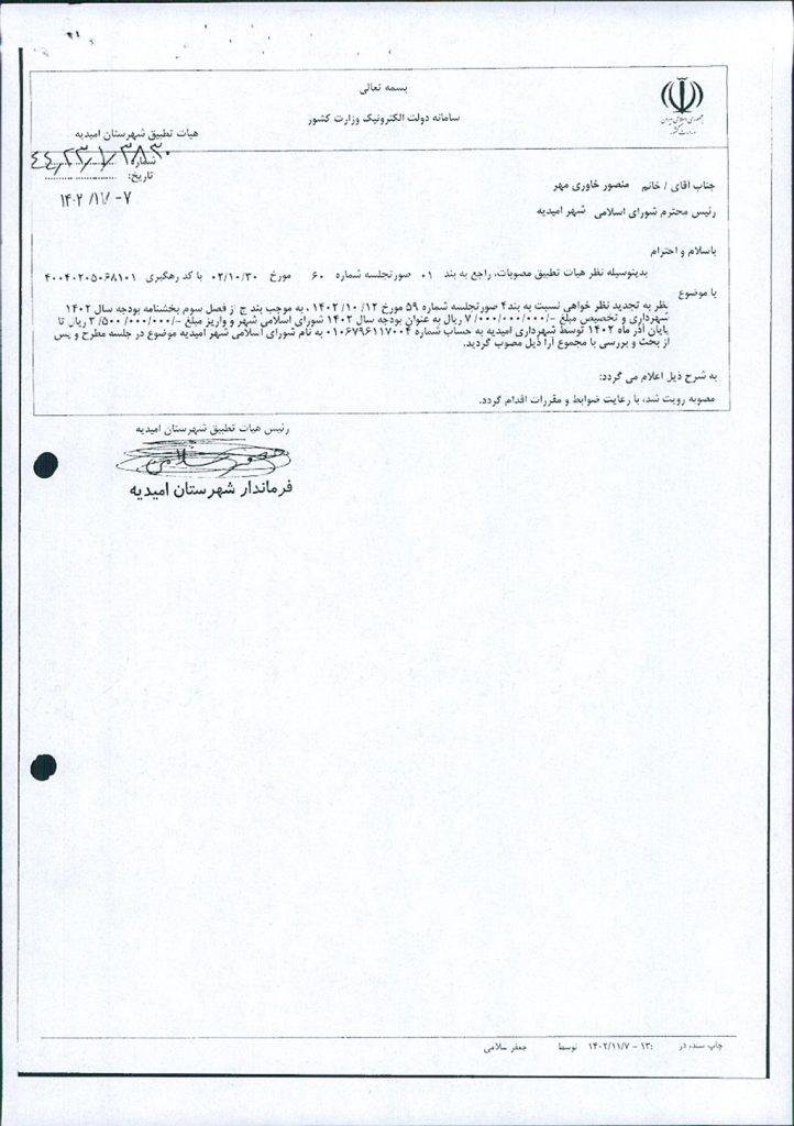 نظریه هیأت تطبیق جلسه شماره ۶۰ مورخ ۱۴۰۲/۱۰/۳۰ شورای اسلامی شهر امیدیه