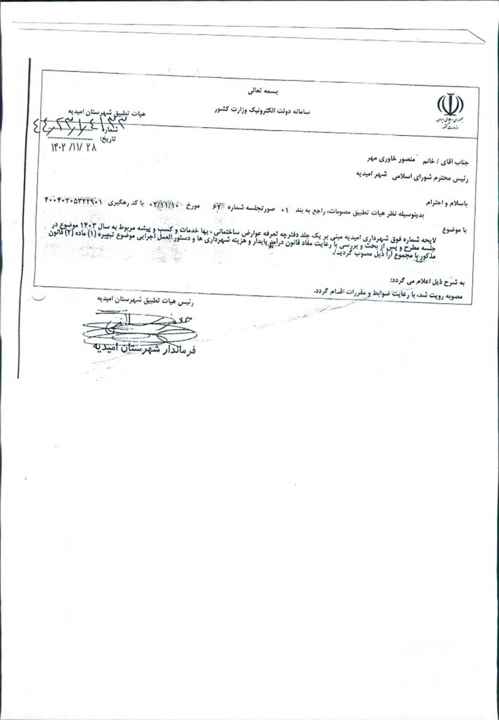 نظریه هیأت تطبیق جلسه شماره ۶۲ مورخ ۱۴۰۲/۱۱/۱۰ شورای اسلامی شهر امیدیه