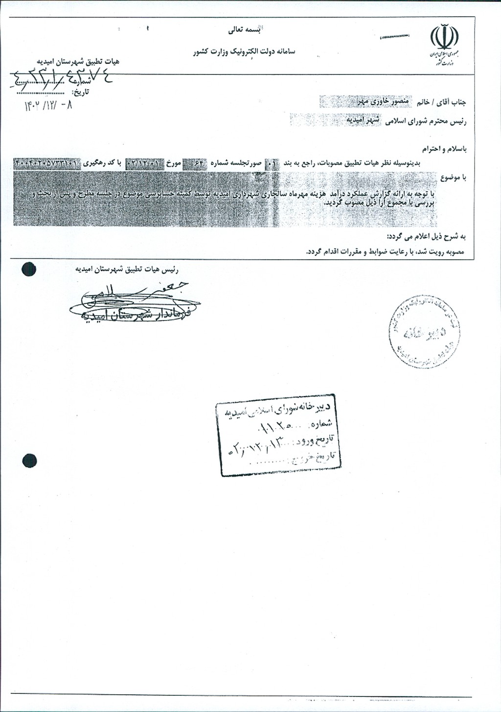نظریه هیأت تطبیق جلسه شماره ۶۴ مورخ ۱۴۰۲/۱۲/۱ شورای اسلامی شهر امیدیه