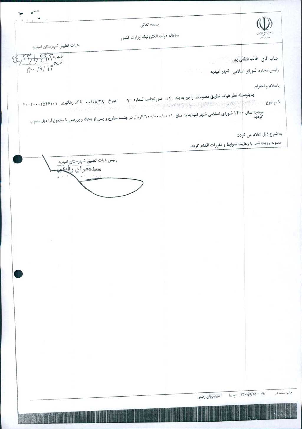 نظریه هیأت تطبیق جلسه شماره ۷ مورخ ۱۴۰۰/۸/۲۹ شورای اسلامی شهر امیدیه