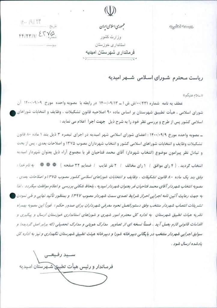 نظریه هیأت تطبیق جلسه شماره ۸ مورخ ۱۴۰۰/۹/۹ شورای اسلامی شهر امیدیه