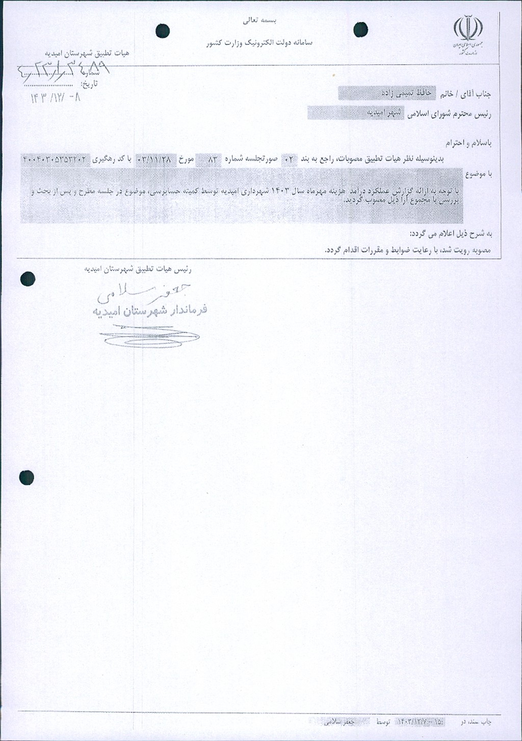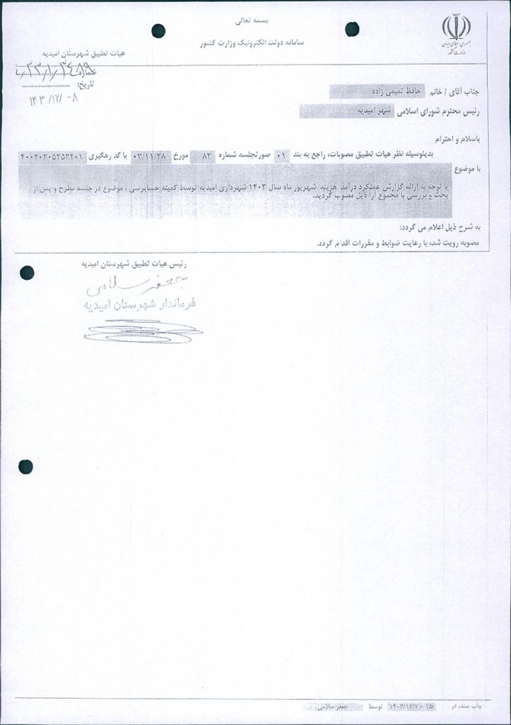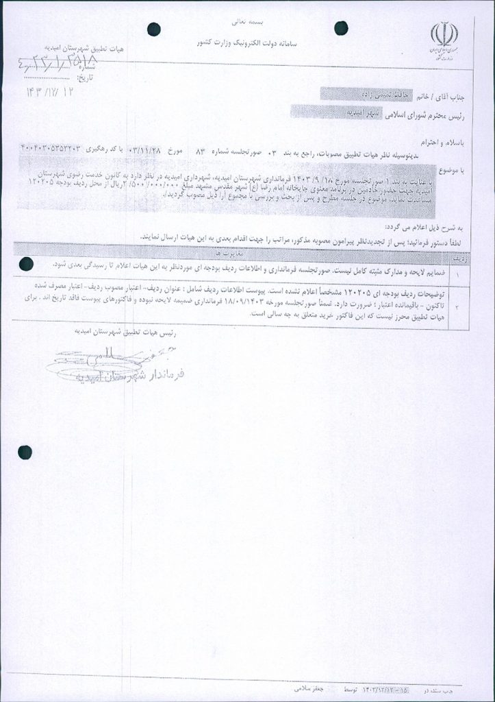 نظریه هیأت تطبیق جلسه شماره ۸۳ مورخ ۱۴۰۳/۱۱/۲۸ شورای اسلامی شهر امیدیه