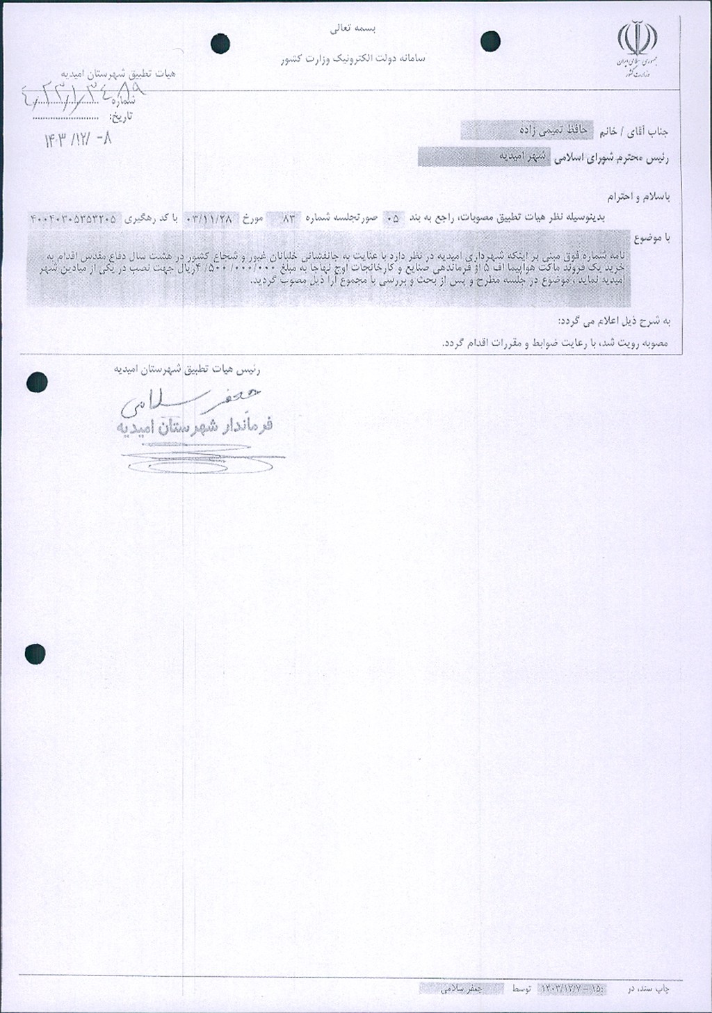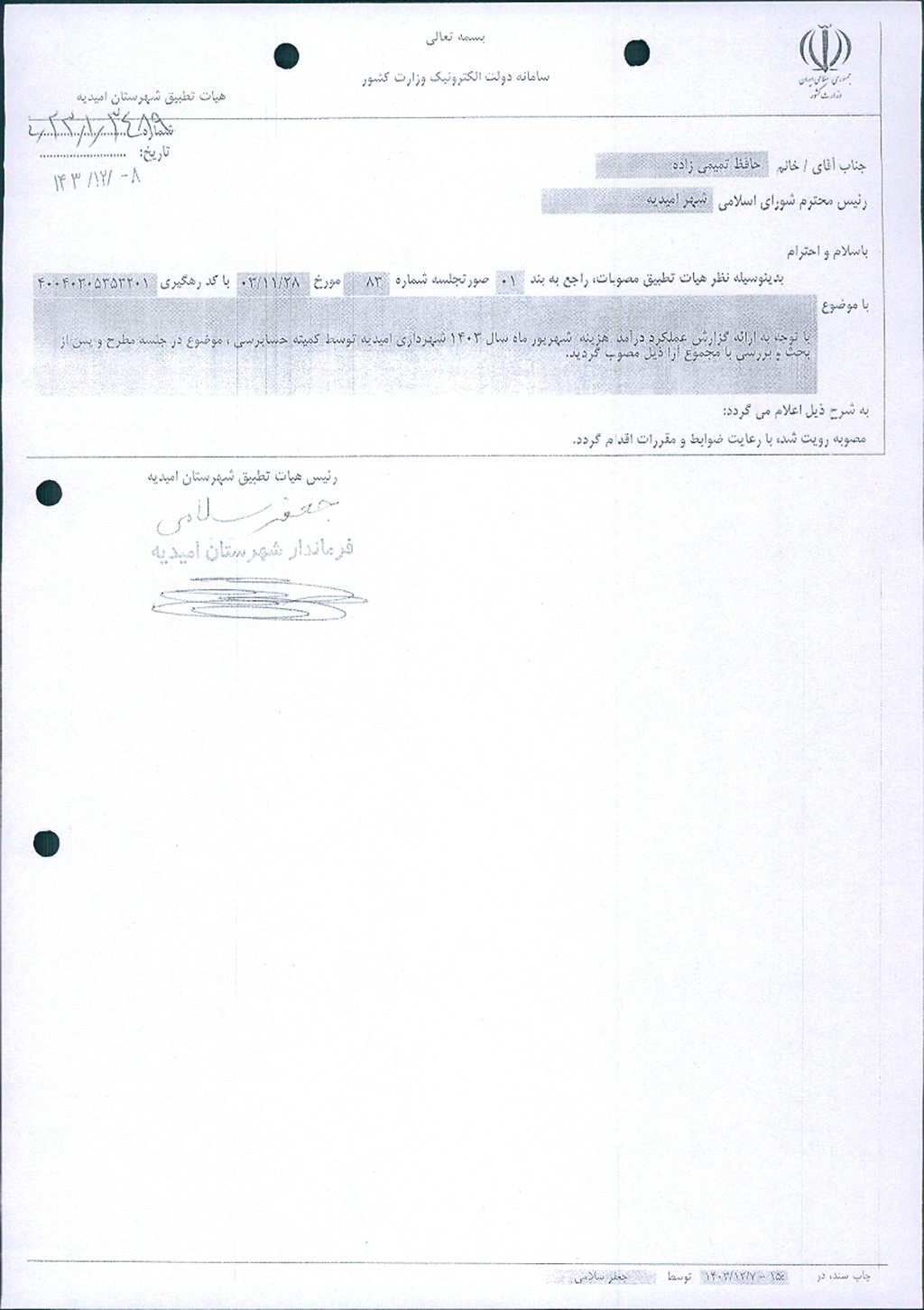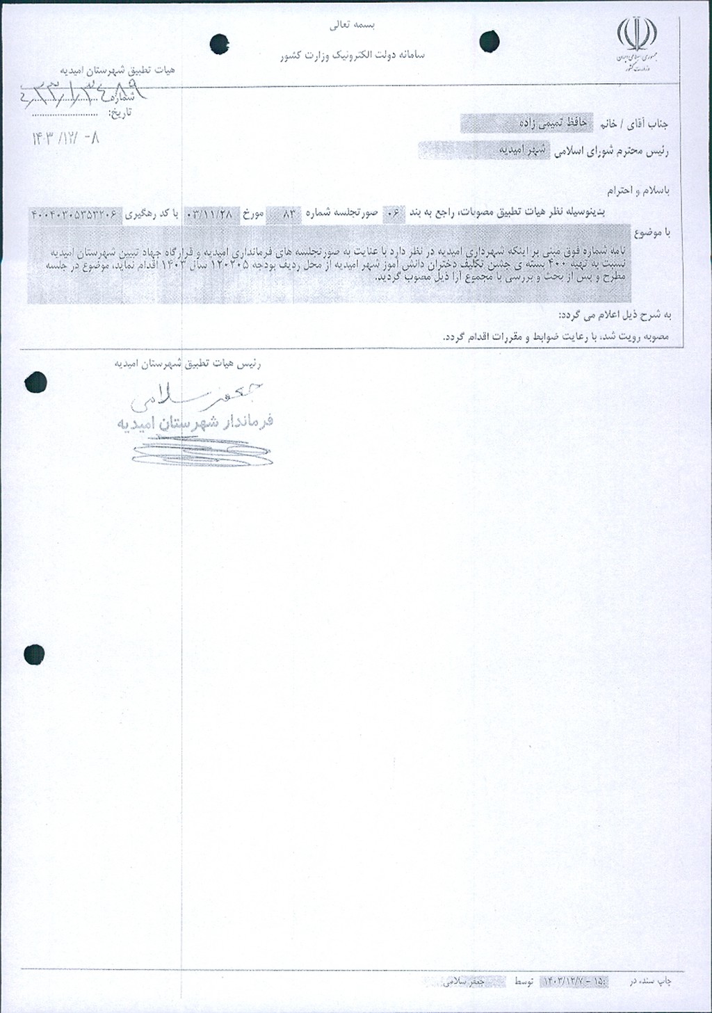 نظریه هیأت تطبیق جلسه شماره ۸۳ مورخ ۱۴۰۳/۱۱/۲۸ شورای اسلامی شهر امیدیه