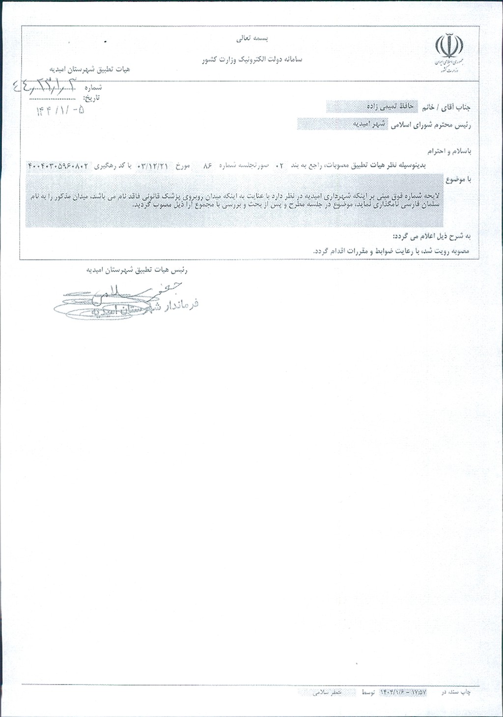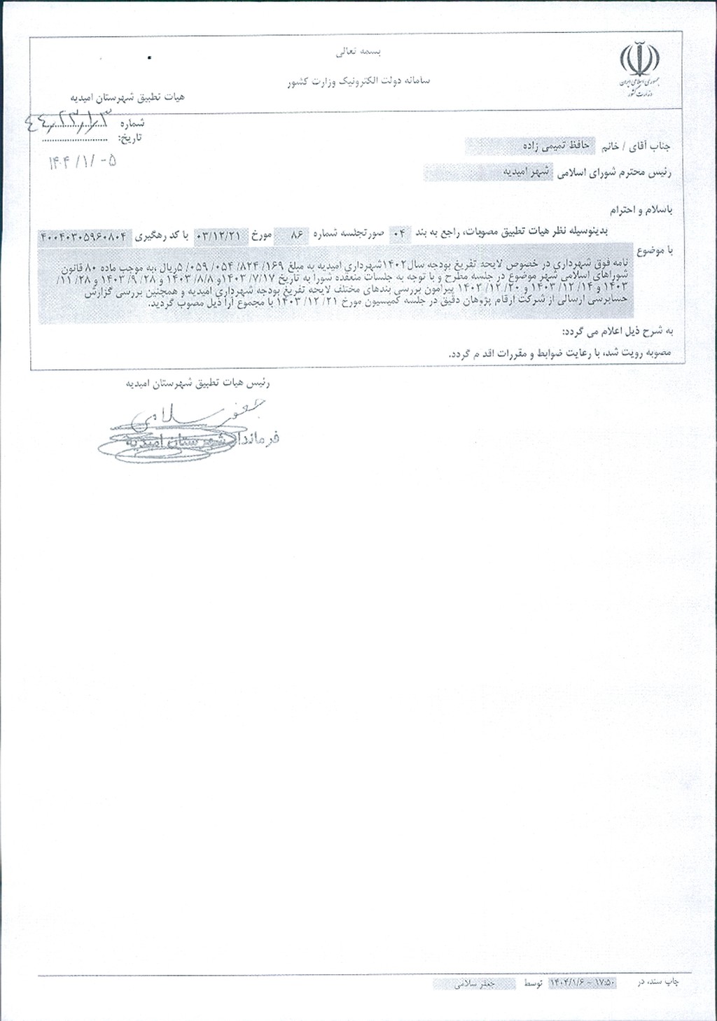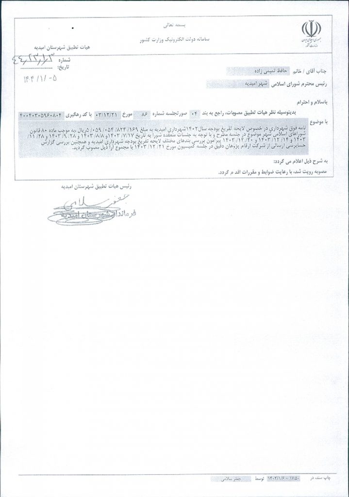 نظریه هیأت تطبیق جلسه شماره ۸۶ مورخ ۱۴۰۳/۱۲/۲۱ شورای اسلامی شهر امیدیه
