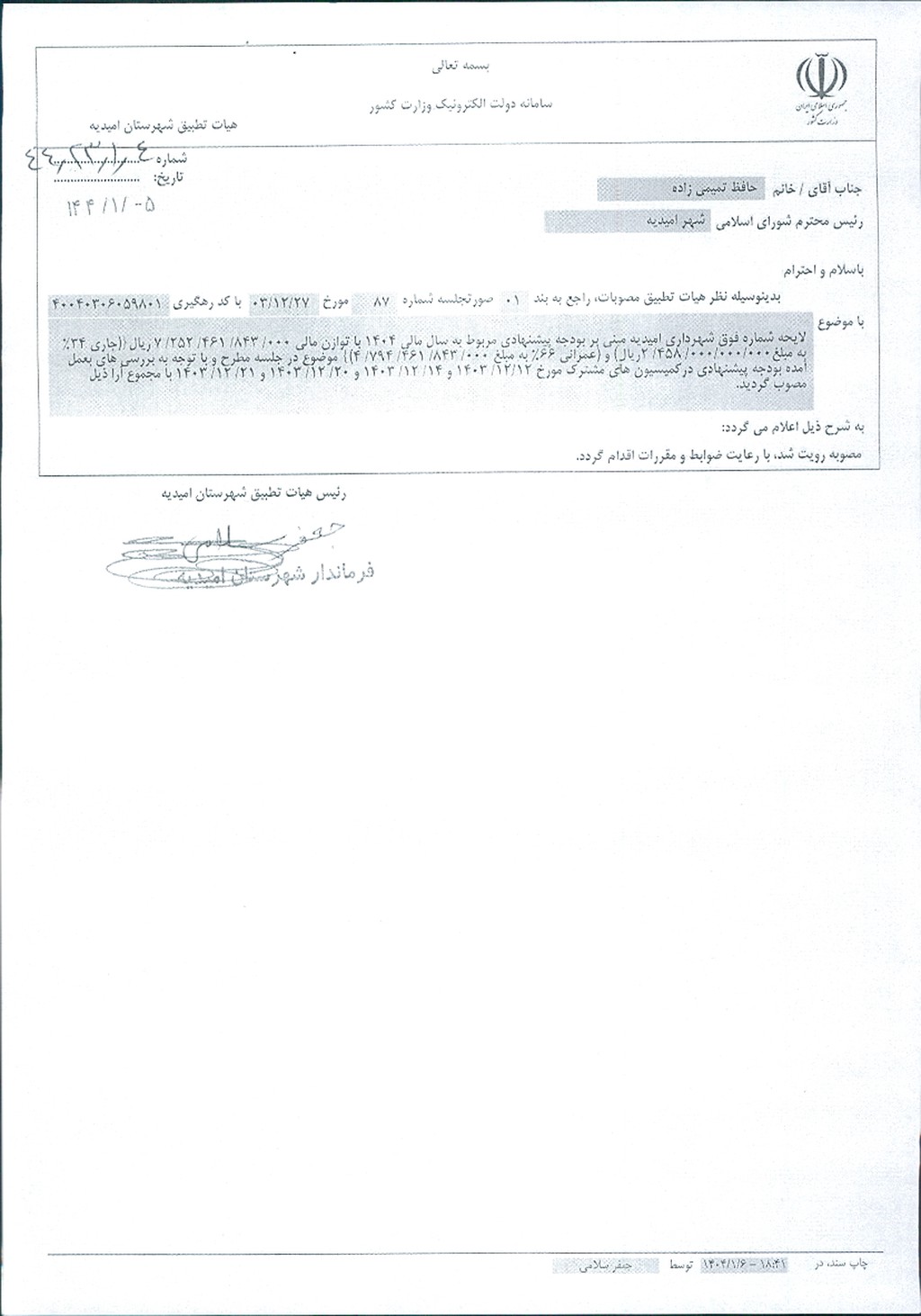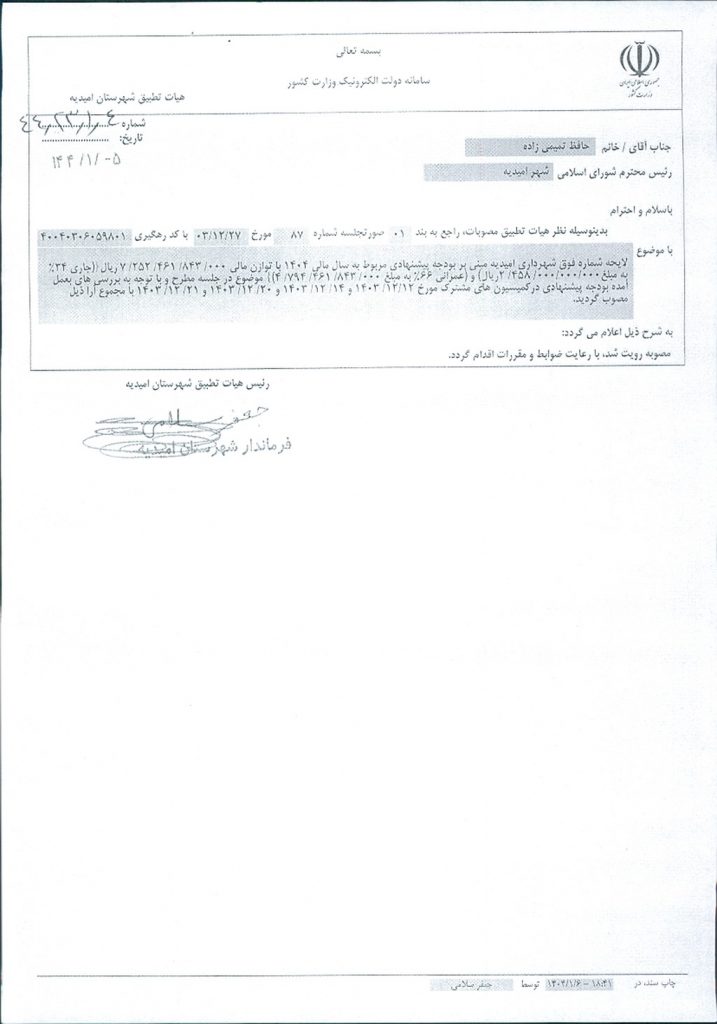 نظریه هیأت تطبیق جلسه شماره ۸۷ مورخ ۱۴۰۳/۱۲/۲۷ شورای اسلامی شهر امیدیه