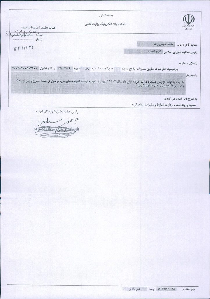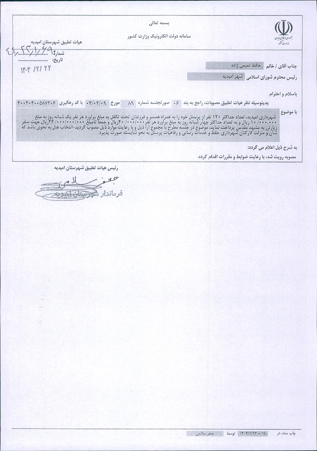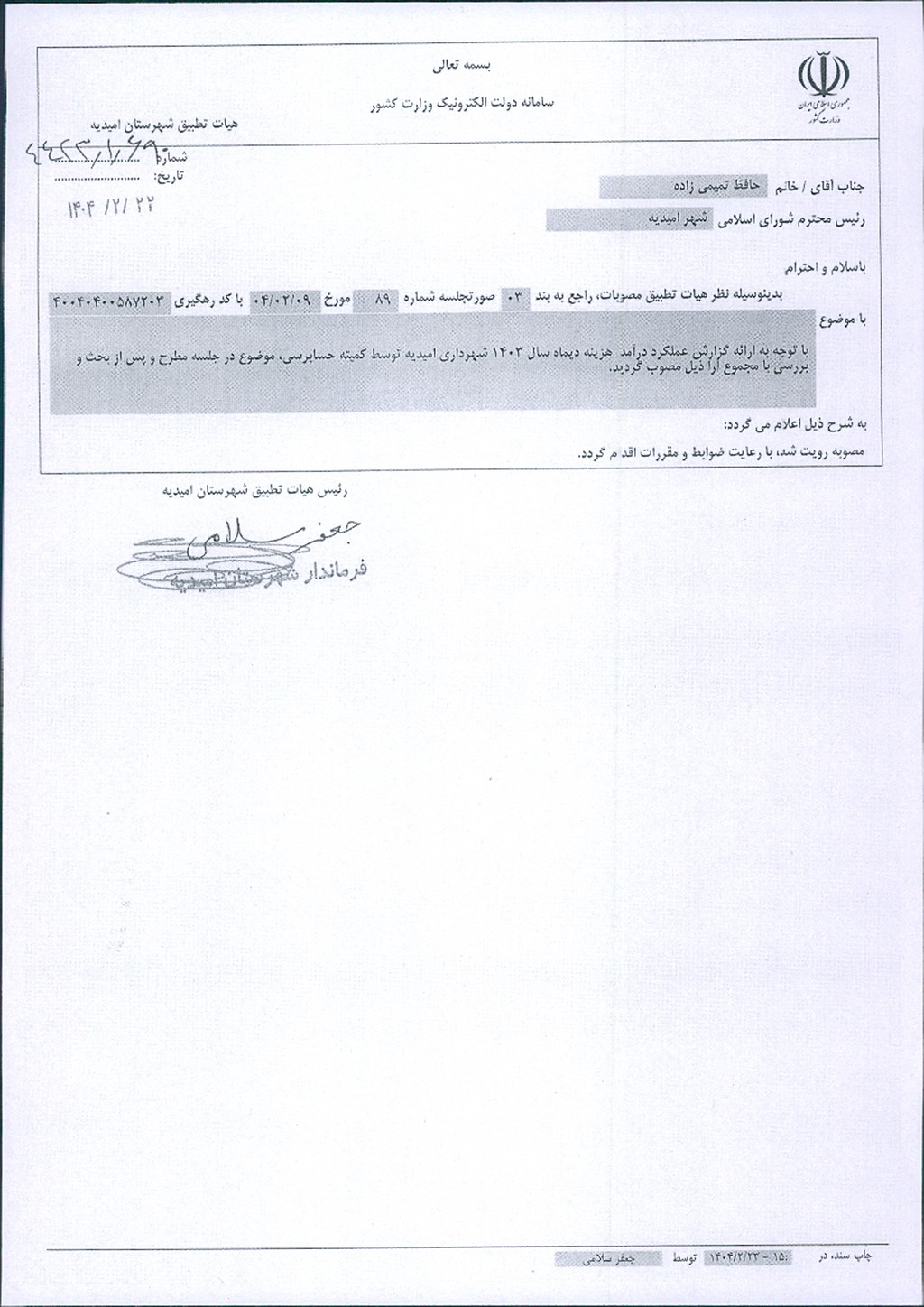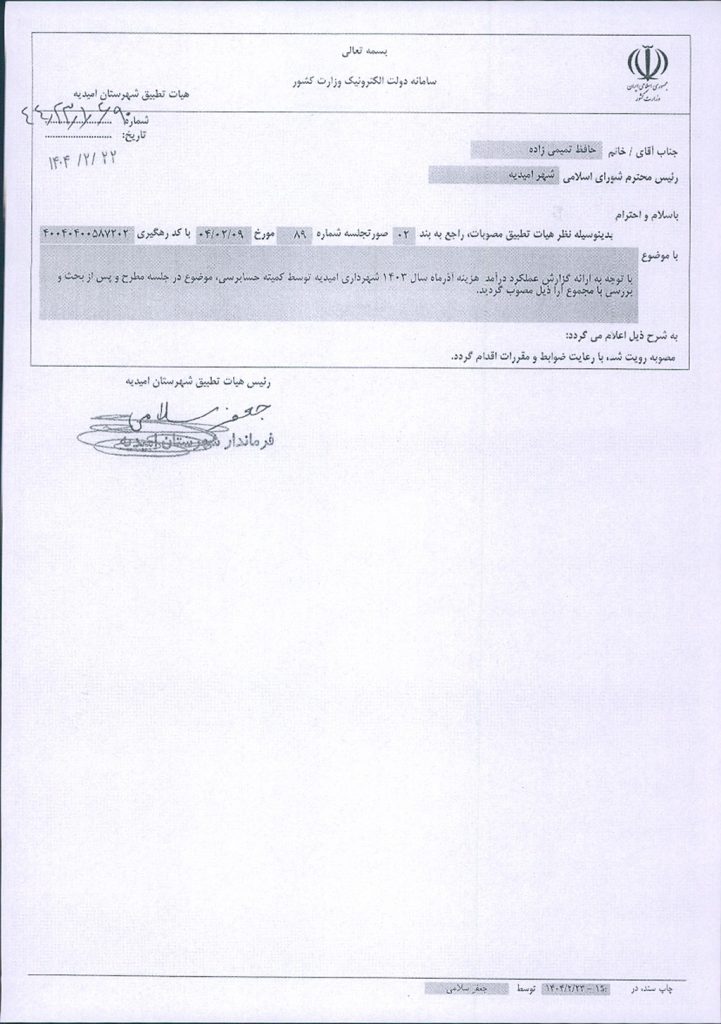 نظریه هیأت تطبیق جلسه شماره ۸۹ مورخ ۱۴۰۴/۲/۹ شورای اسلامی شهر امیدیه