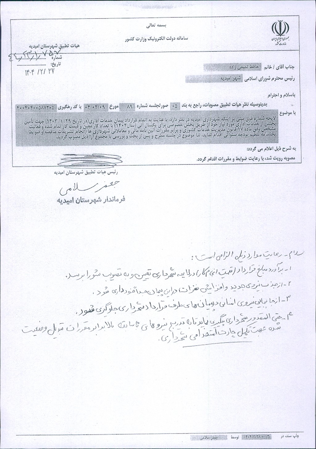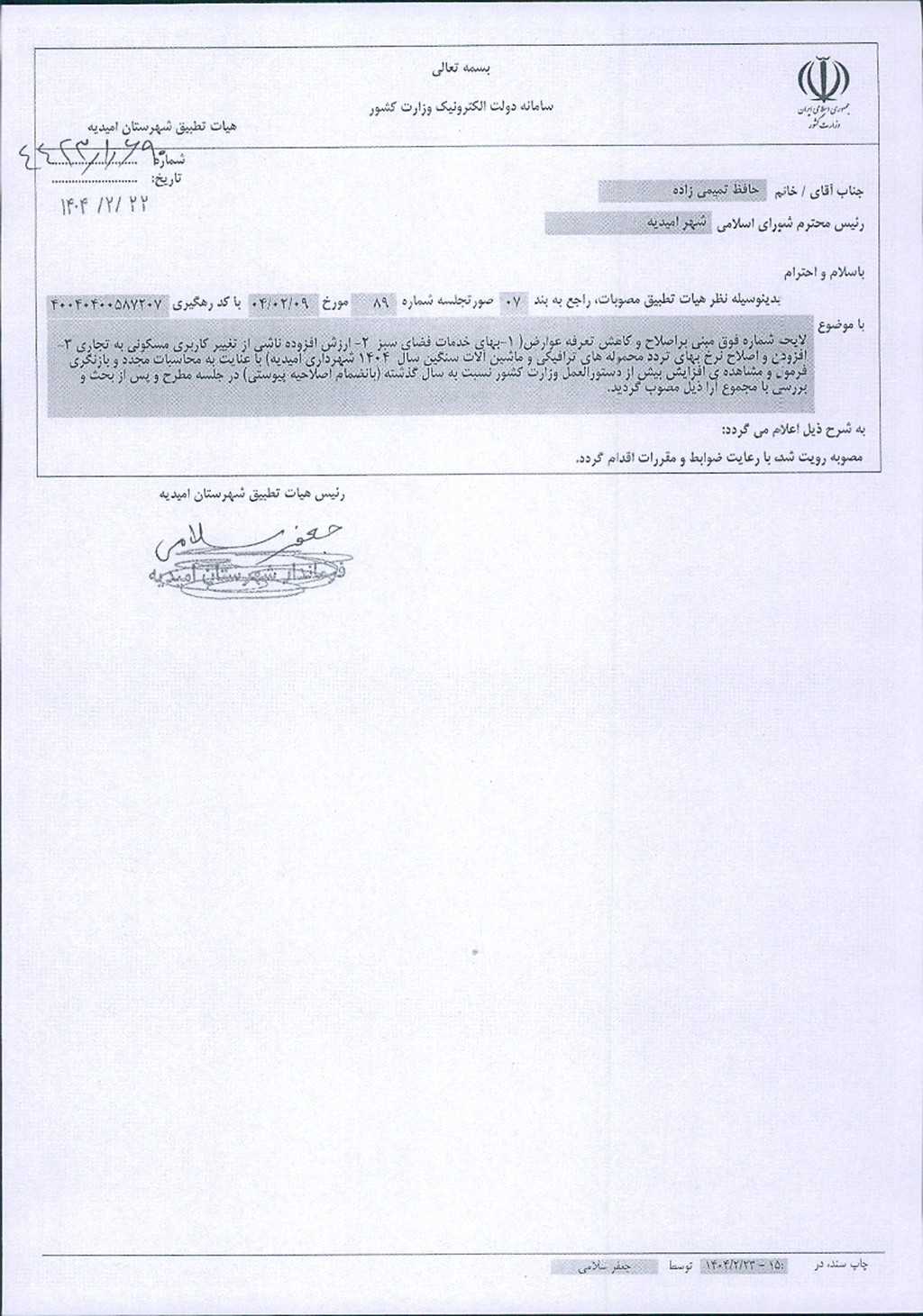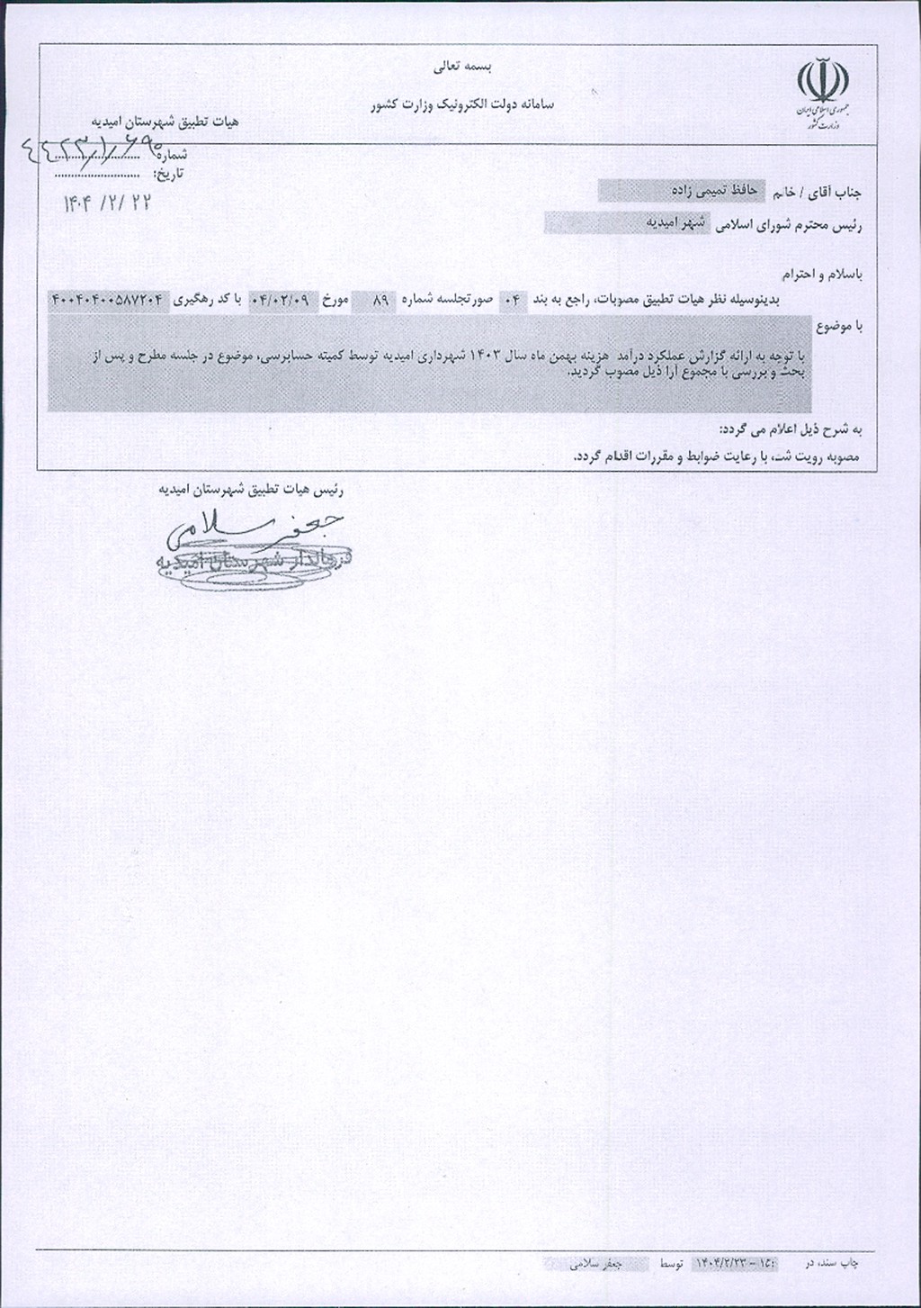 نظریه هیأت تطبیق جلسه شماره ۸۹ مورخ ۱۴۰۴/۲/۹ شورای اسلامی شهر امیدیه