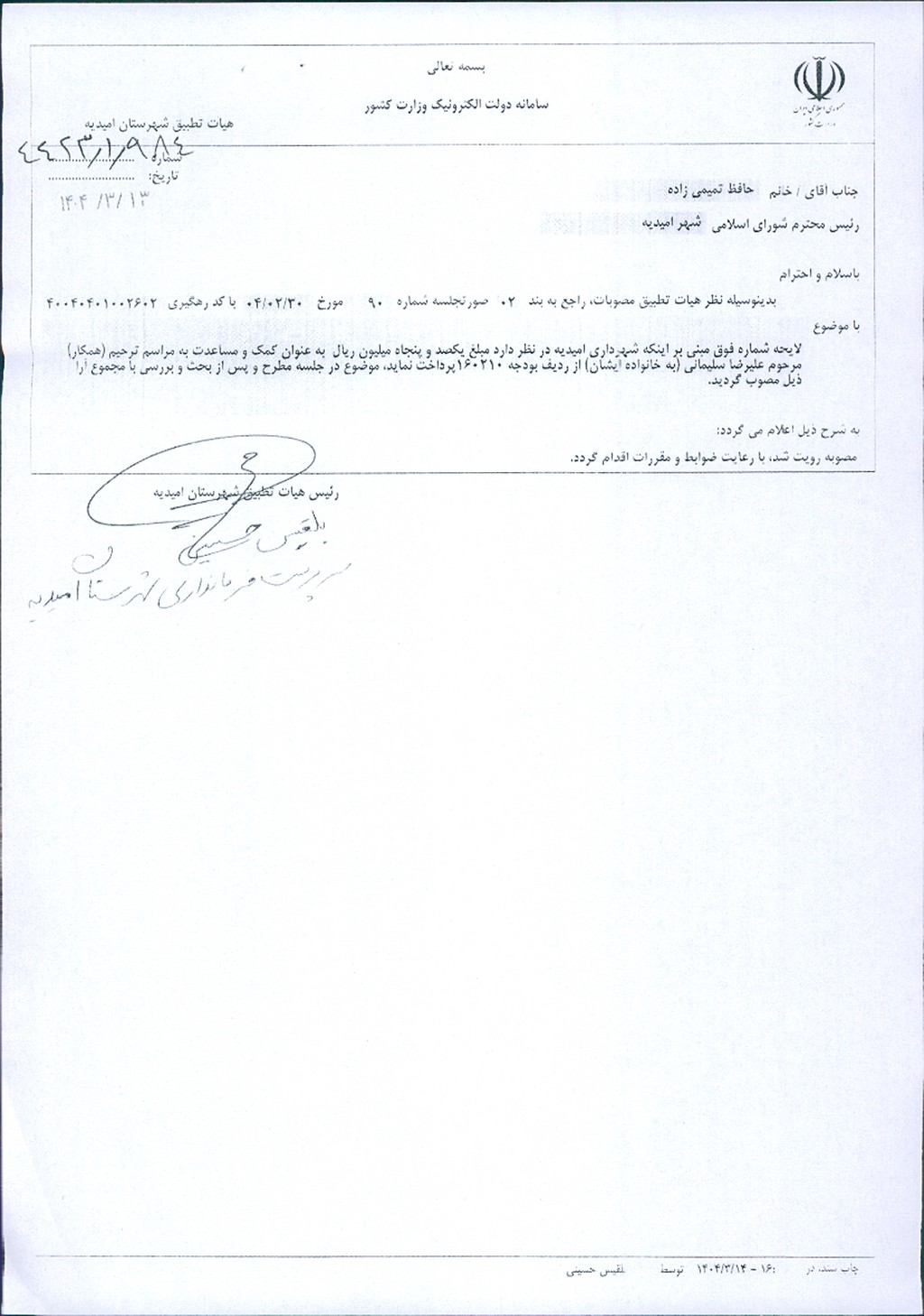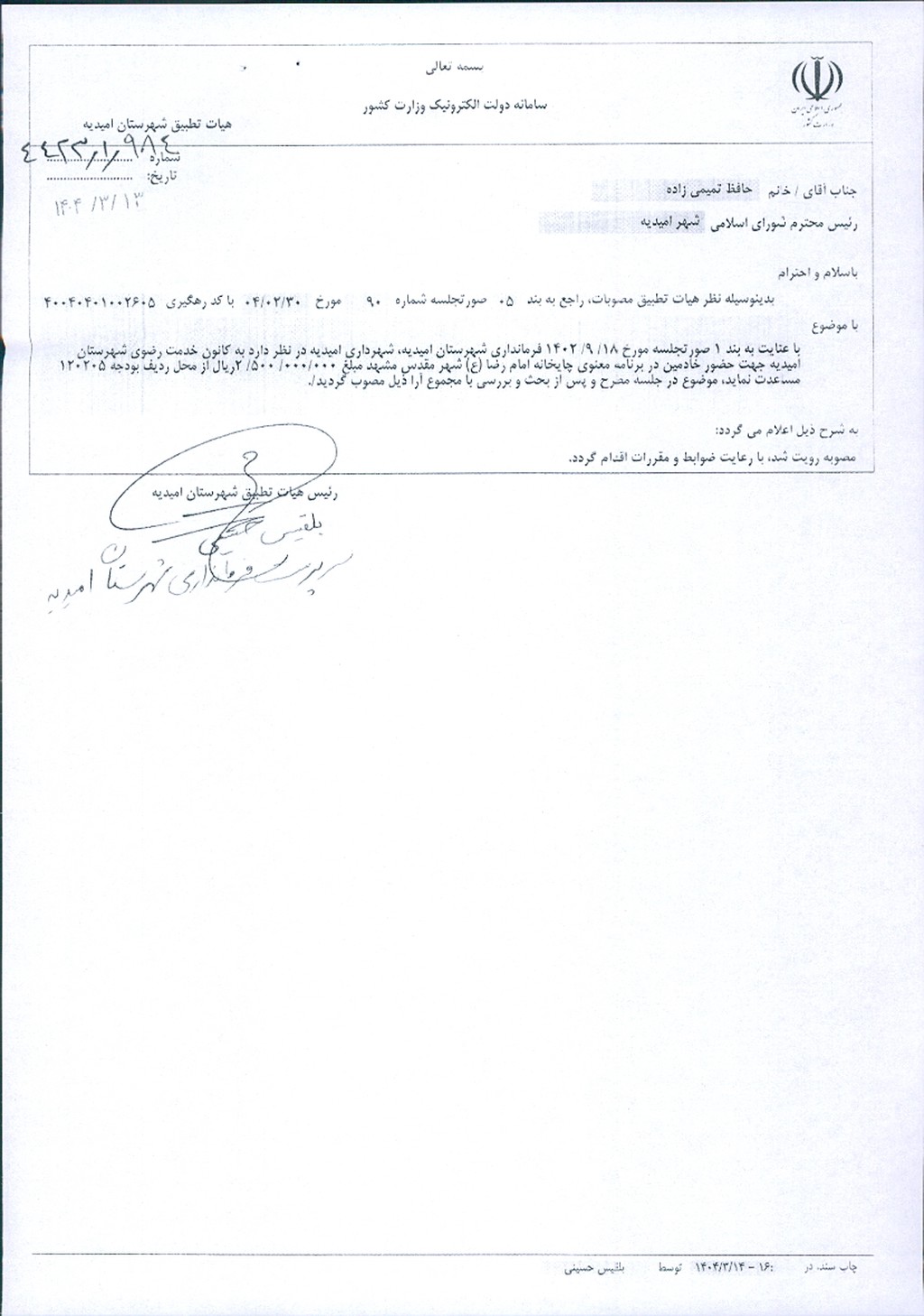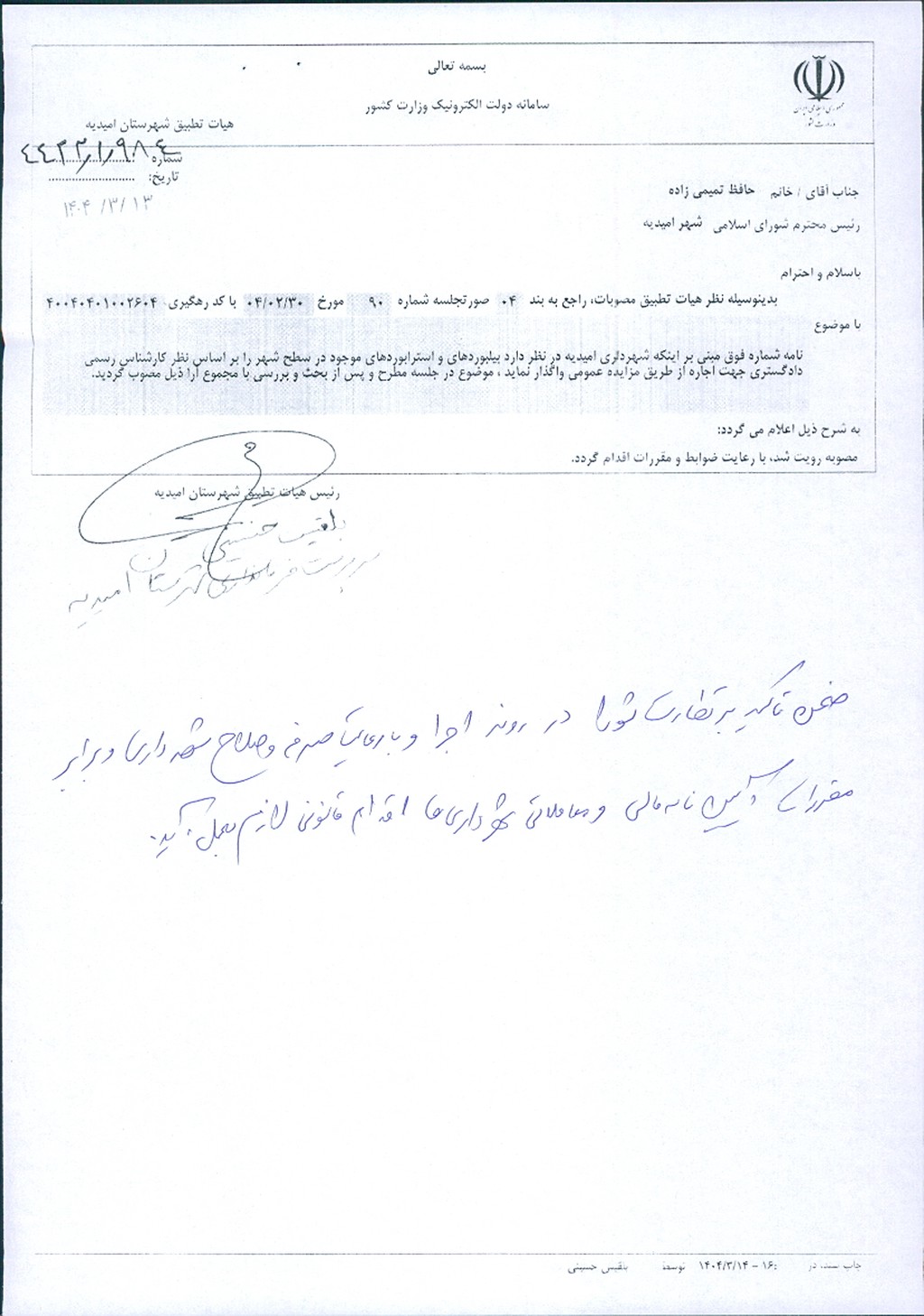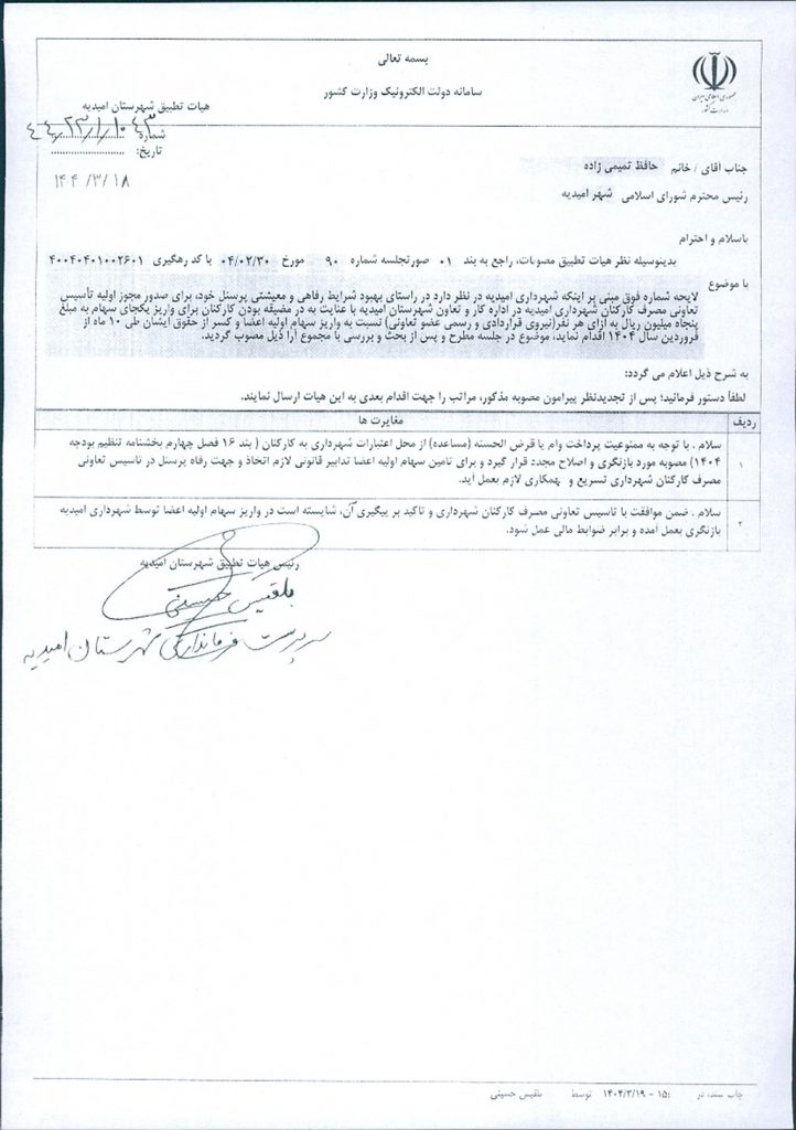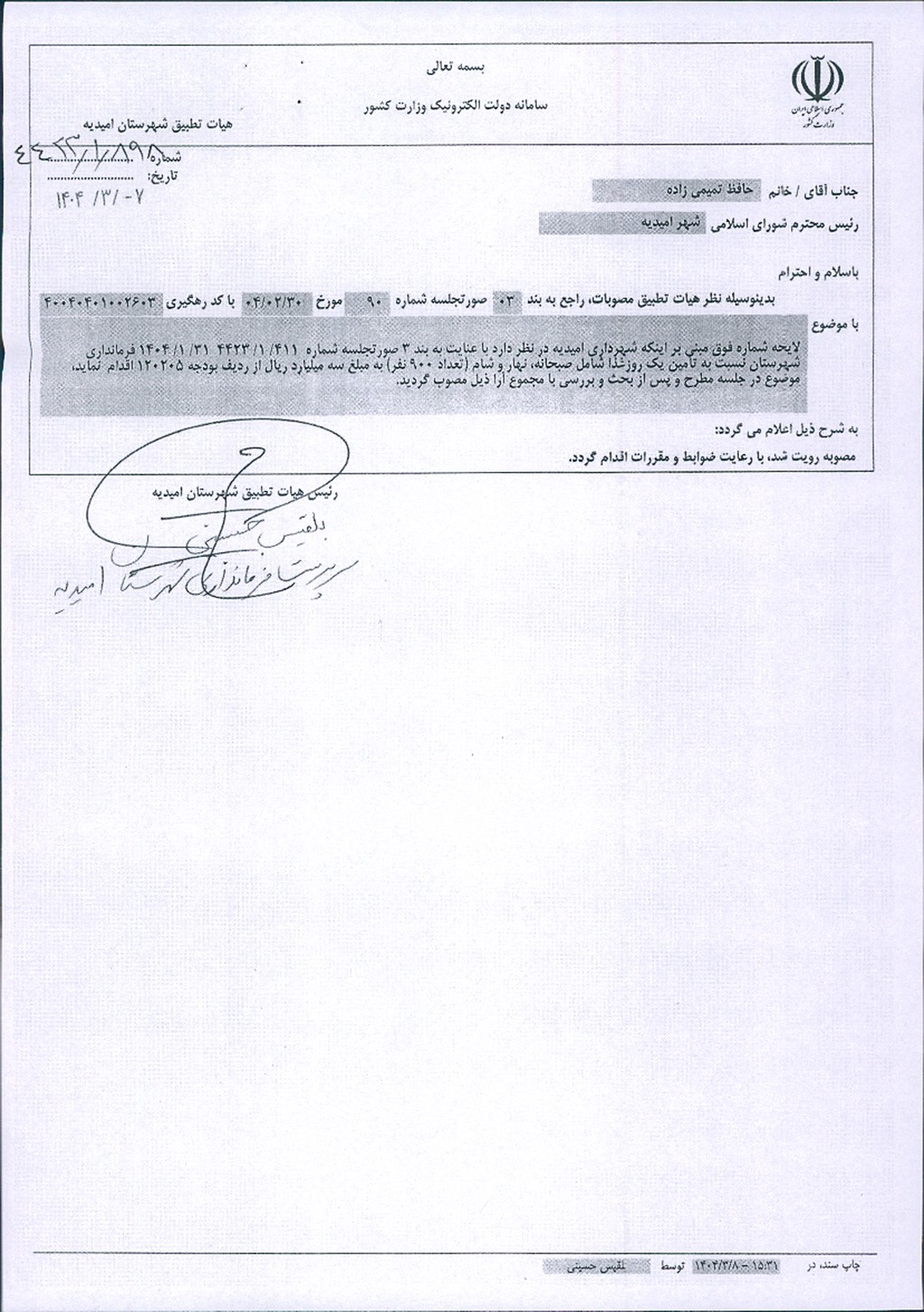 نظریه هیأت تطبیق جلسه شماره ۹۰ مورخ ۱۴۰۴/۲/۳۰ شورای اسلامی شهر امیدیه
