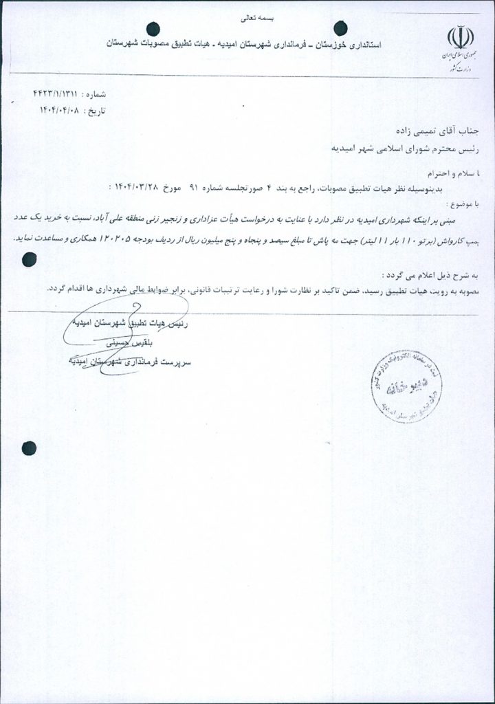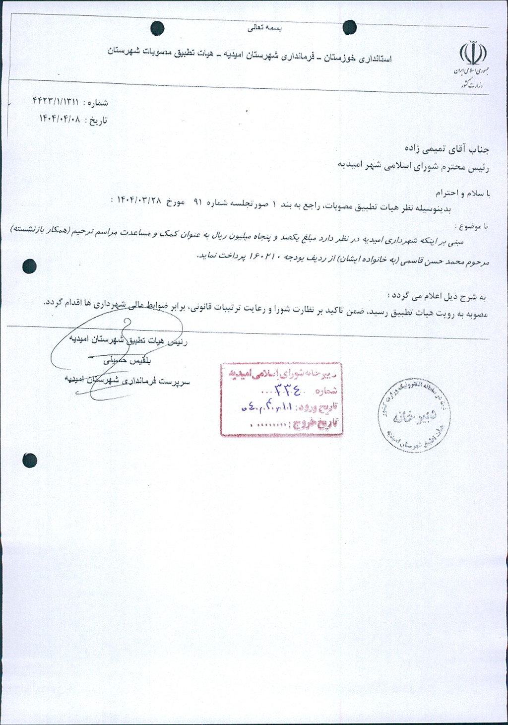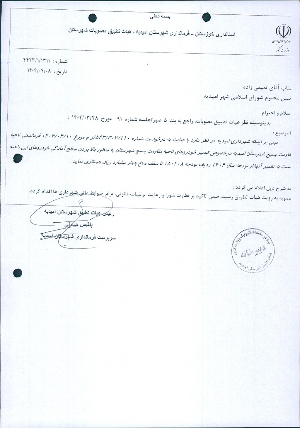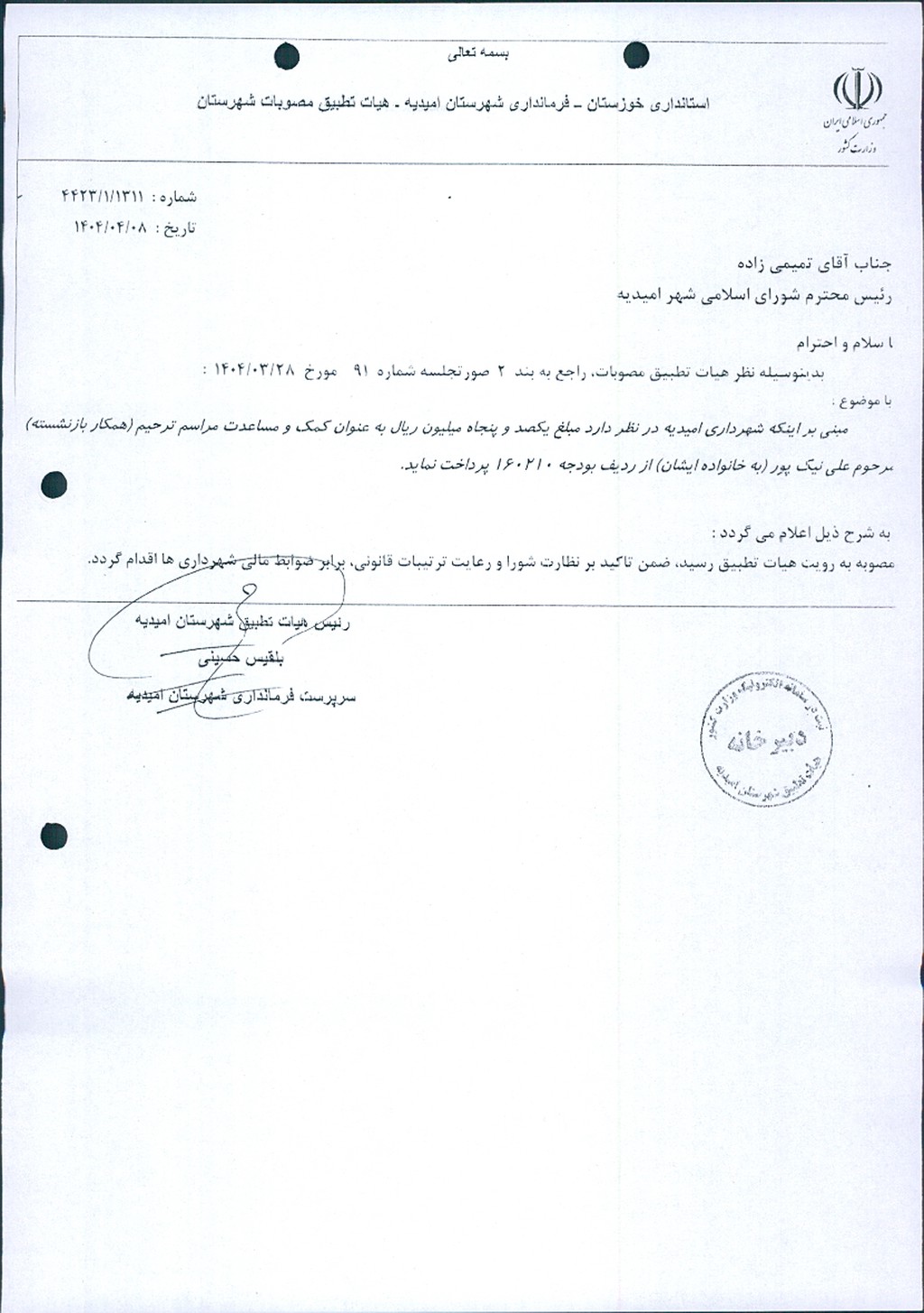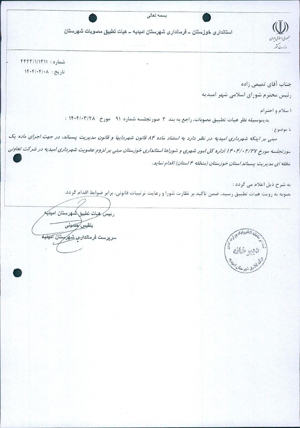 نظریه هیأت تطبیق جلسه شماره ۹۱ مورخ ۱۴۰۴/۳/۲۸ شورای اسلامی شهر امیدیه