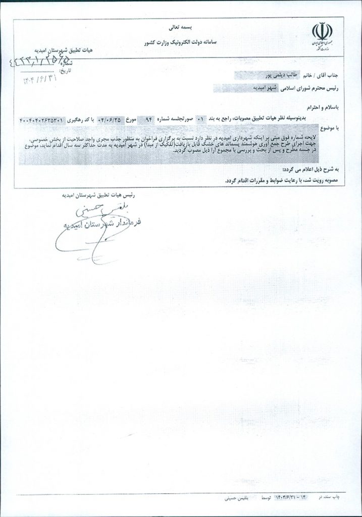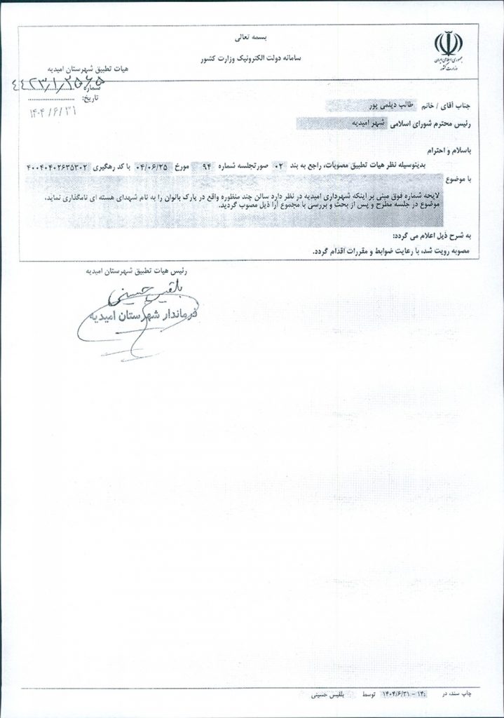 نظریه هیأت تطبیق جلسه شماره ۹۶ مورخ ۱۴۰۴/۷/۱۵ شورای اسلامی شهر امیدیه