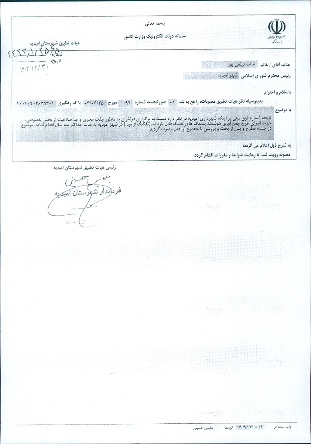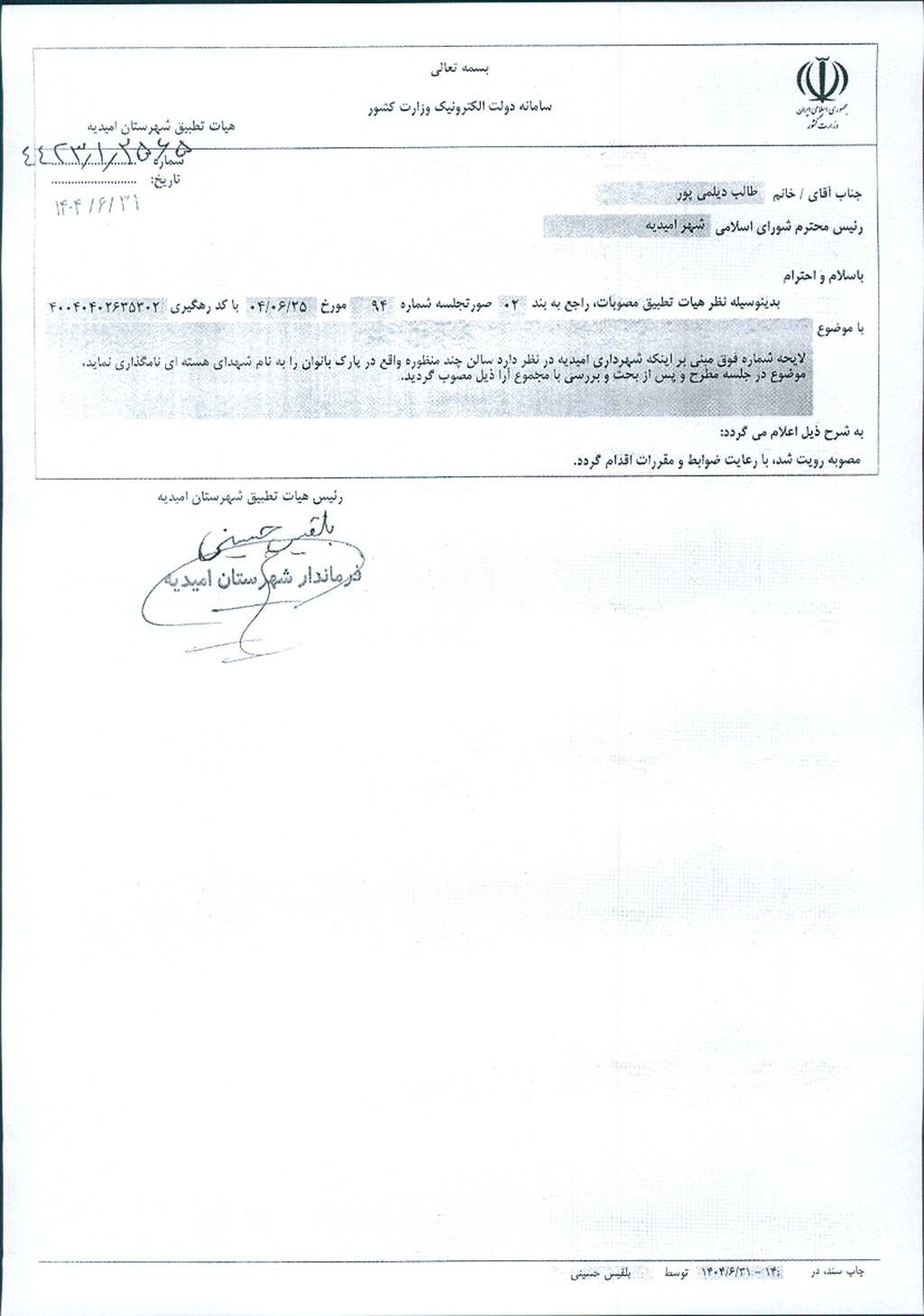 نظریه هیأت تطبیق جلسه شماره ۹۴ مورخ ۱۴۰۴/۶/۲۵ شورای اسلامی شهر امیدیه