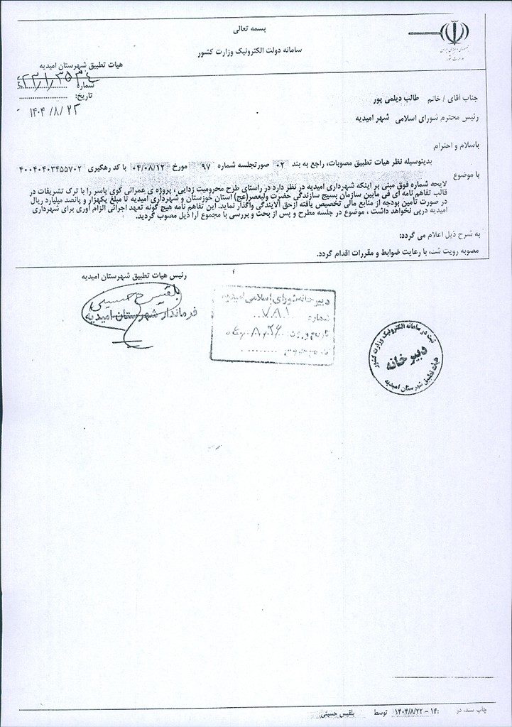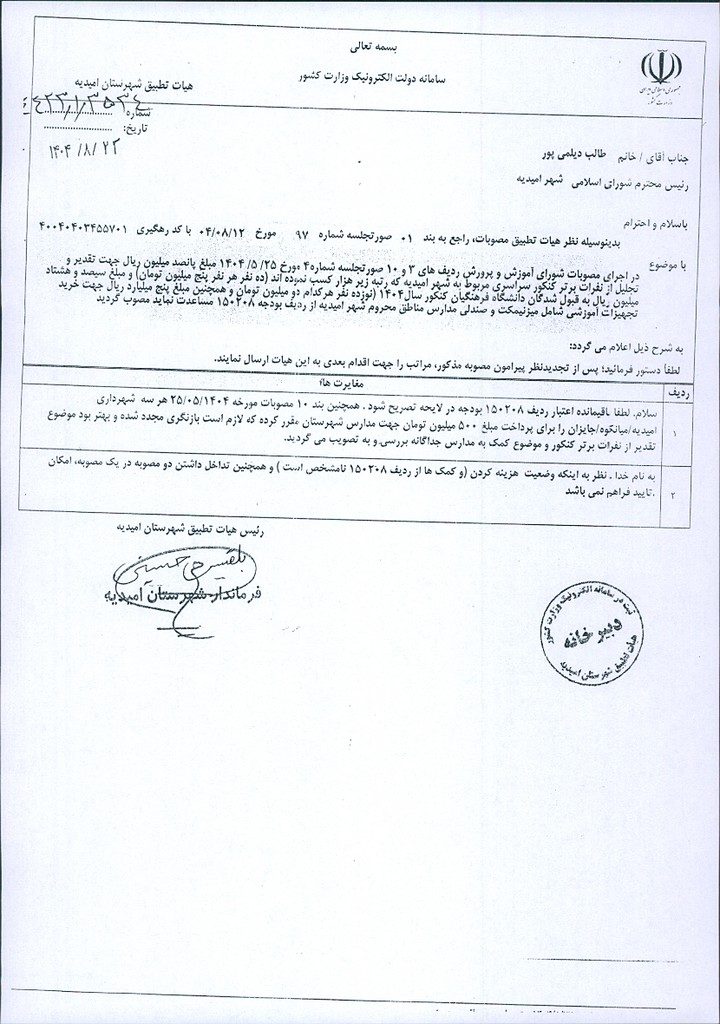 نظریه هیأت تطبیق جلسه شماره ۹۷ مورخ ۱۴۰۴/۸/۱۲ شورای اسلامی شهر امیدیه