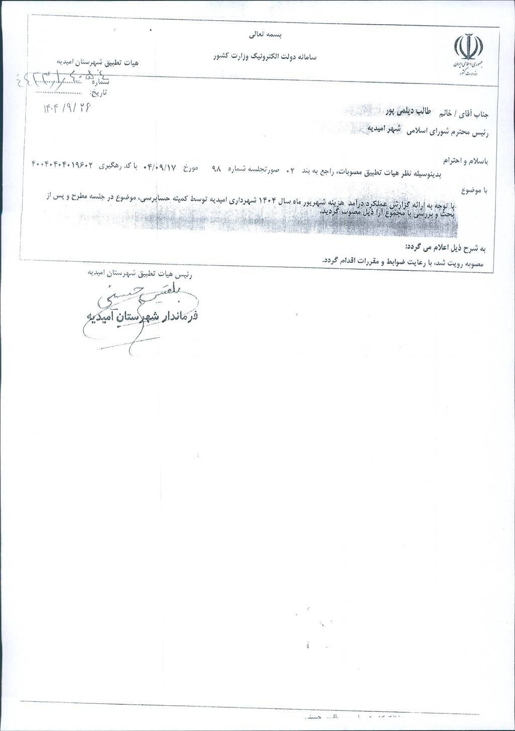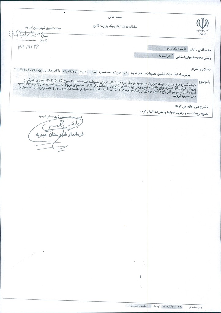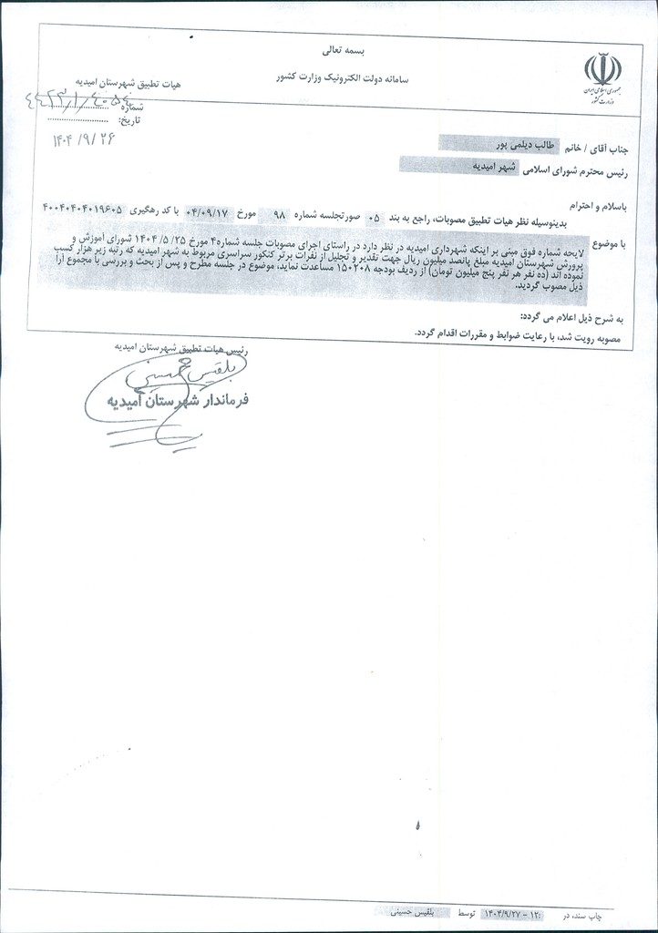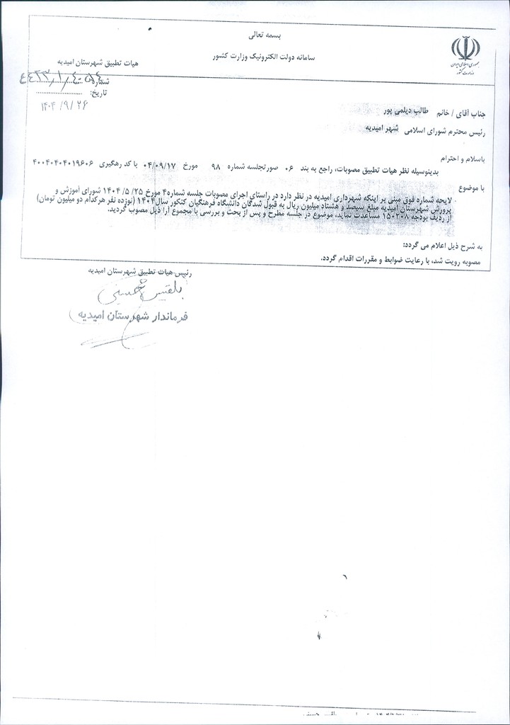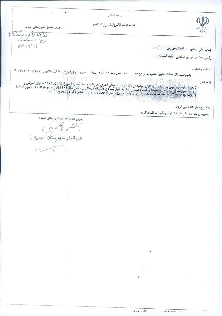 نظریه هیأت تطبیق جلسه شماره ۹۸ مورخ ۱۴۰۴/۹/۱۷ شورای اسلامی شهر امیدیه