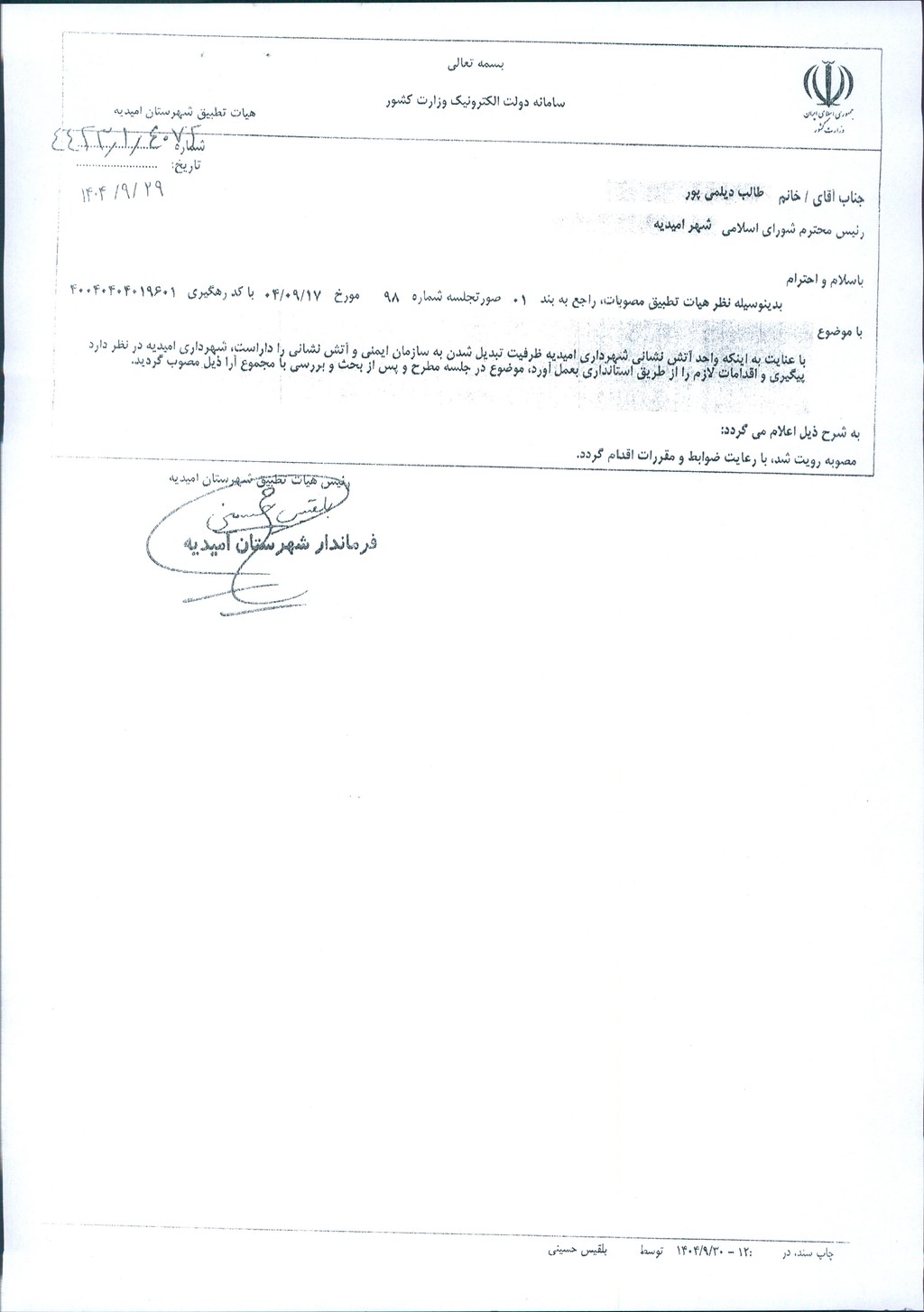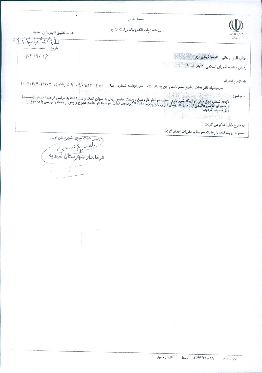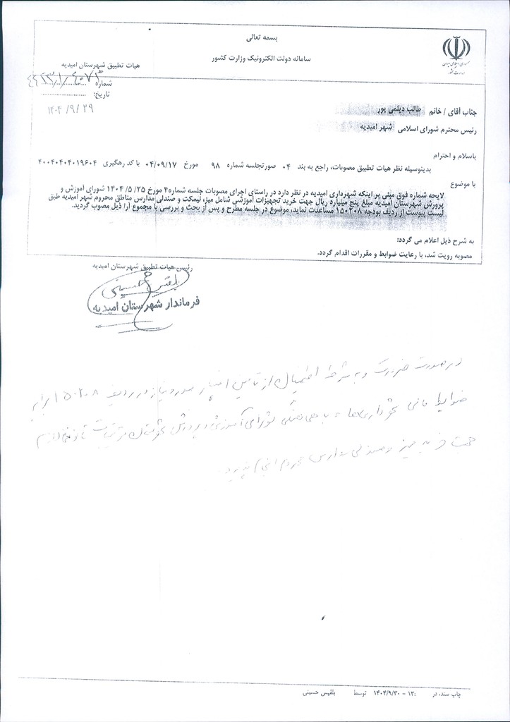 نظریه هیأت تطبیق جلسه شماره ۹۸ مورخ ۱۴۰۴/۹/۱۷ شورای اسلامی شهر امیدیه