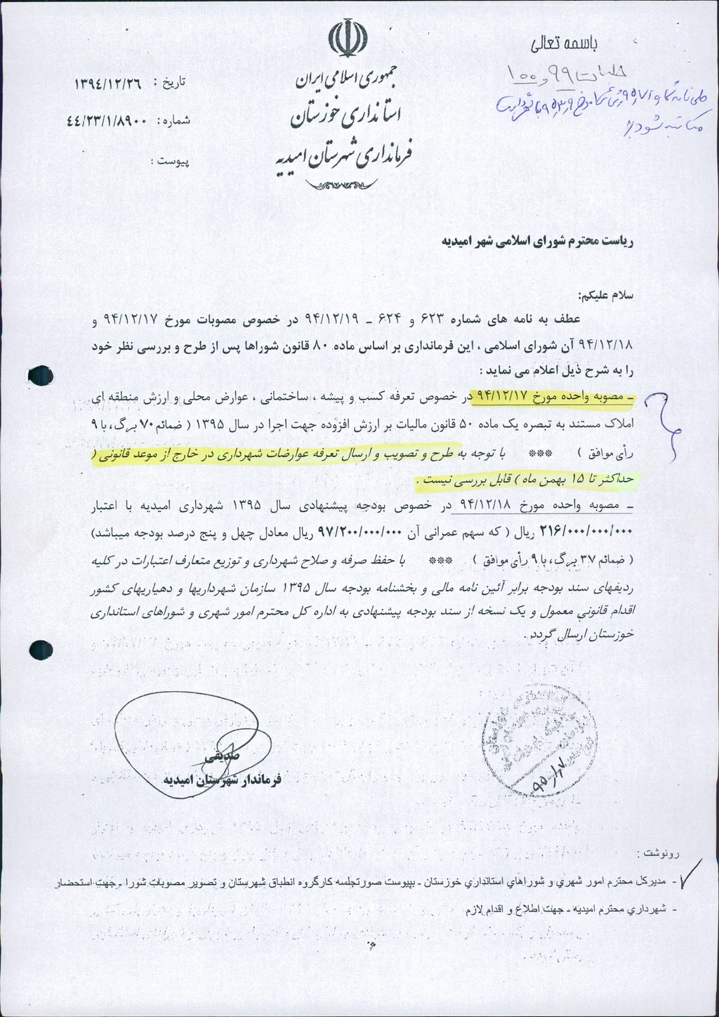 نظریه هیأت تطبیق جلسه ۱۰۰ مورخ ۹۴/۱۲/۱۸ شورای اسلامی شهر امیدیه