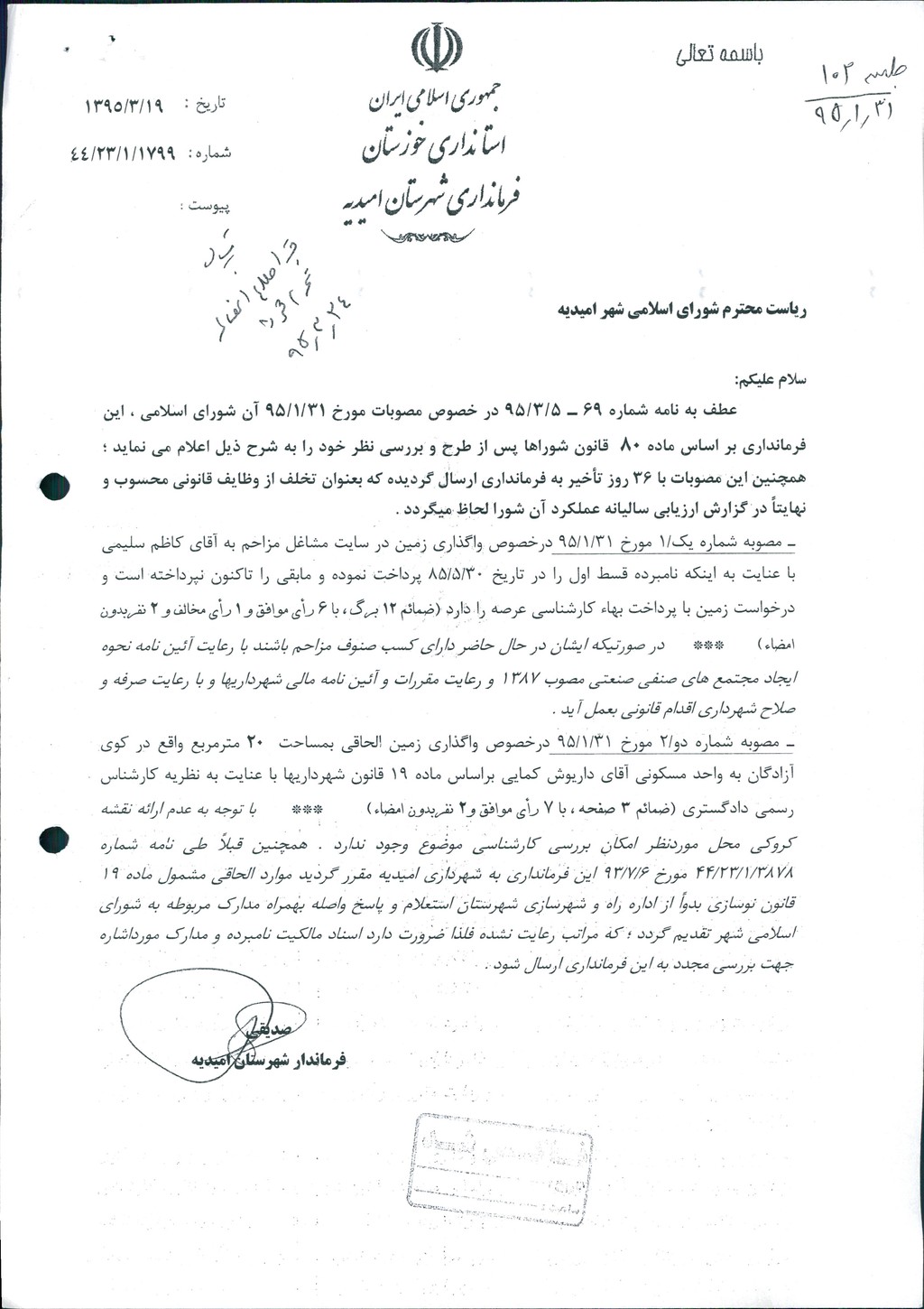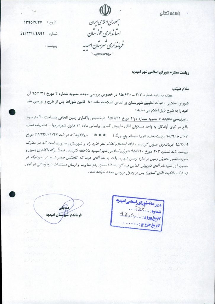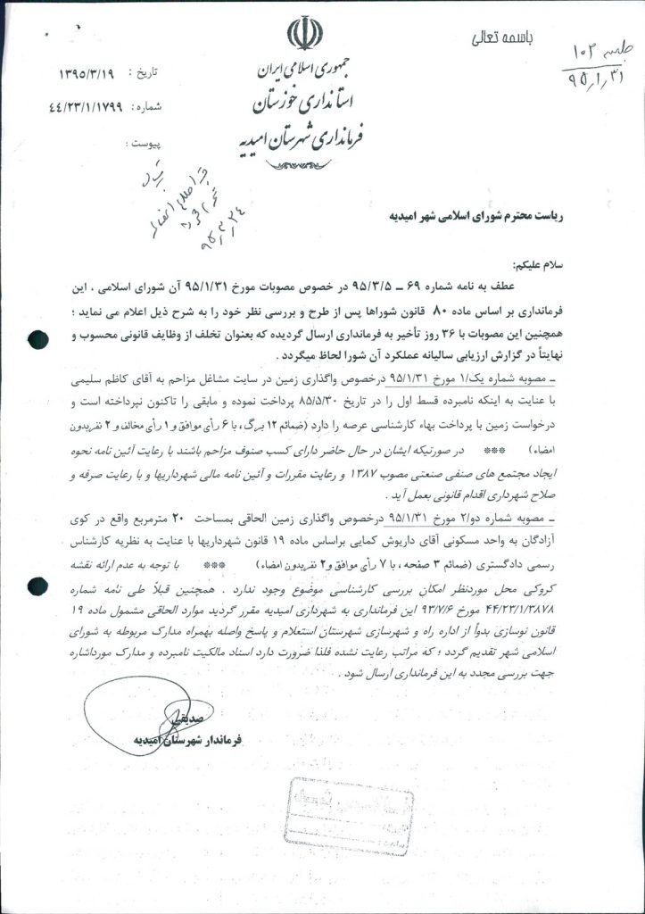 نظریه هیأت تطبیق جلسه ۱۰۲ مورخ ۹۵/۱/۳۱ شورای اسلامی شهر امیدیه