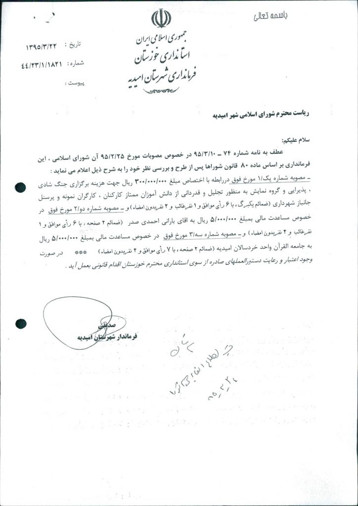 نظریه هیأت تطبیق جلسه ۱۰۳ مورخ ۹۵/۲/۲۵ شورای اسلامی شهر امیدیه