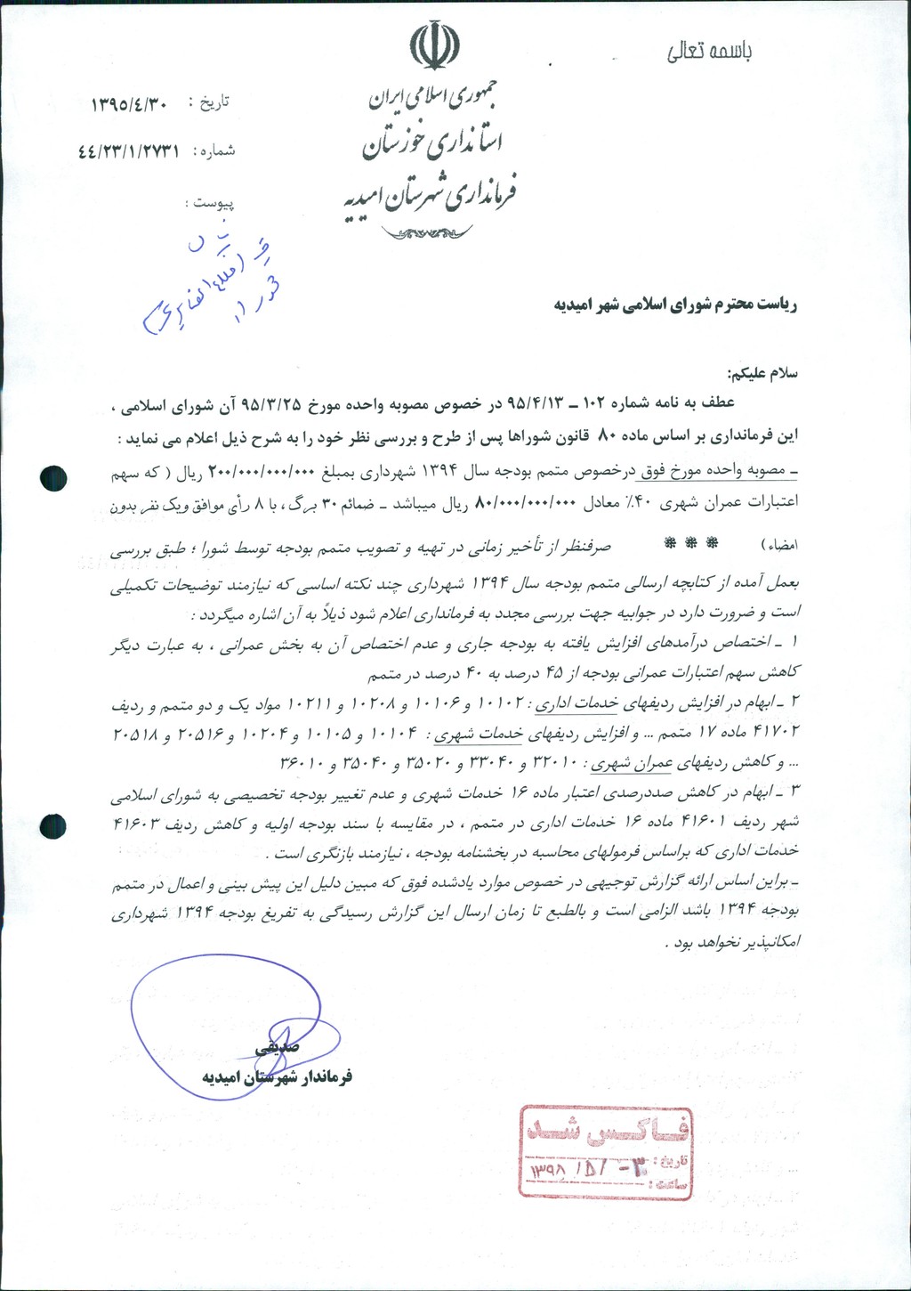 نظریه هیأت تطبیق جلسه ۱۰۵ مورخ ۹۵/۳/۲۵ شورای اسلامی شهر امیدیه