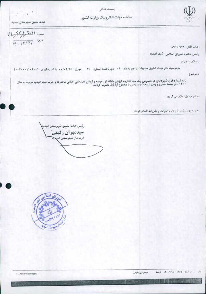 نظریه هیأت تطبیق جلسه ۱۱۳ مورخ ۱۴۰۰/۴/۱۶ شورای اسلامی شهر امیدیه