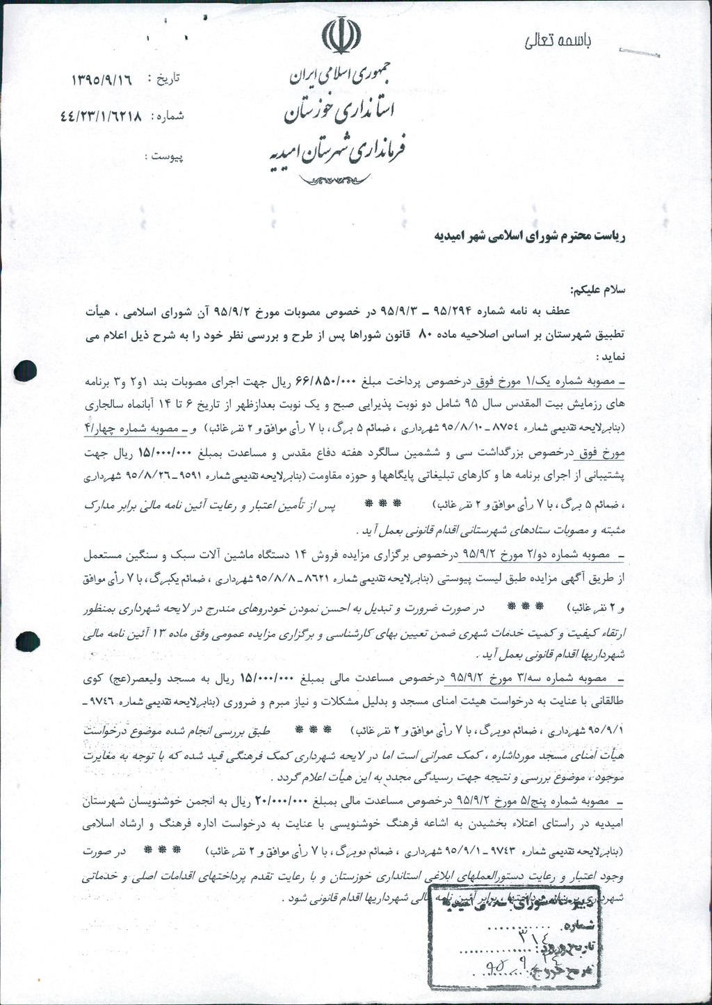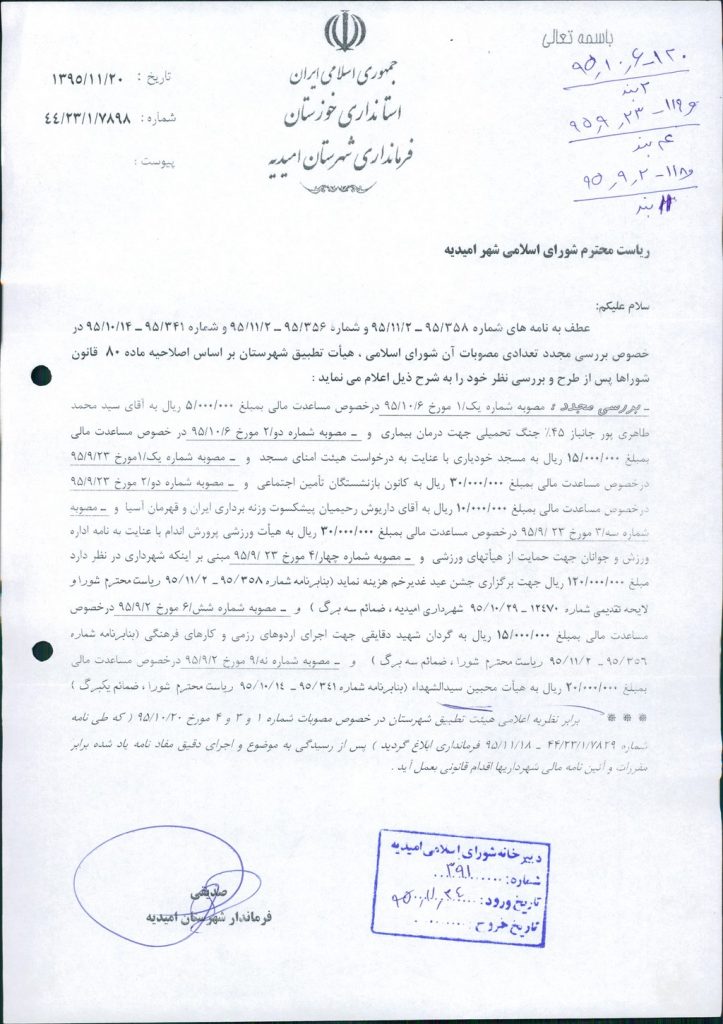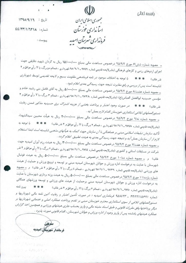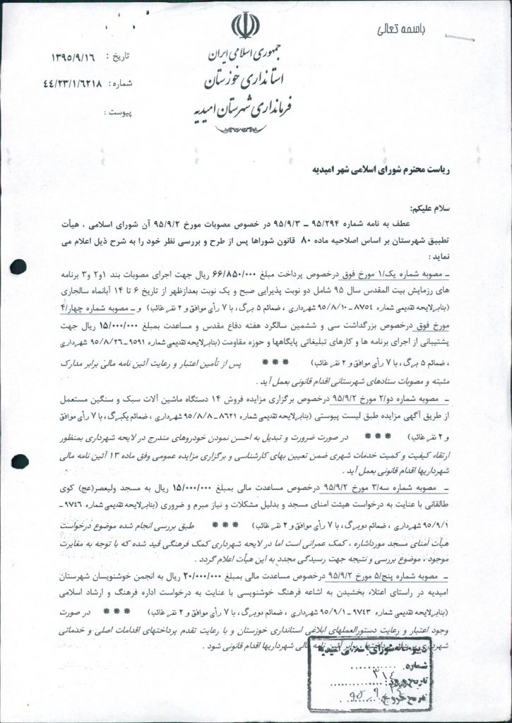 نظریه هیأت تطبیق جلسه ۱۱۸ مورخ ۹۵/۹/۲ شورای اسلامی شهر امیدیه