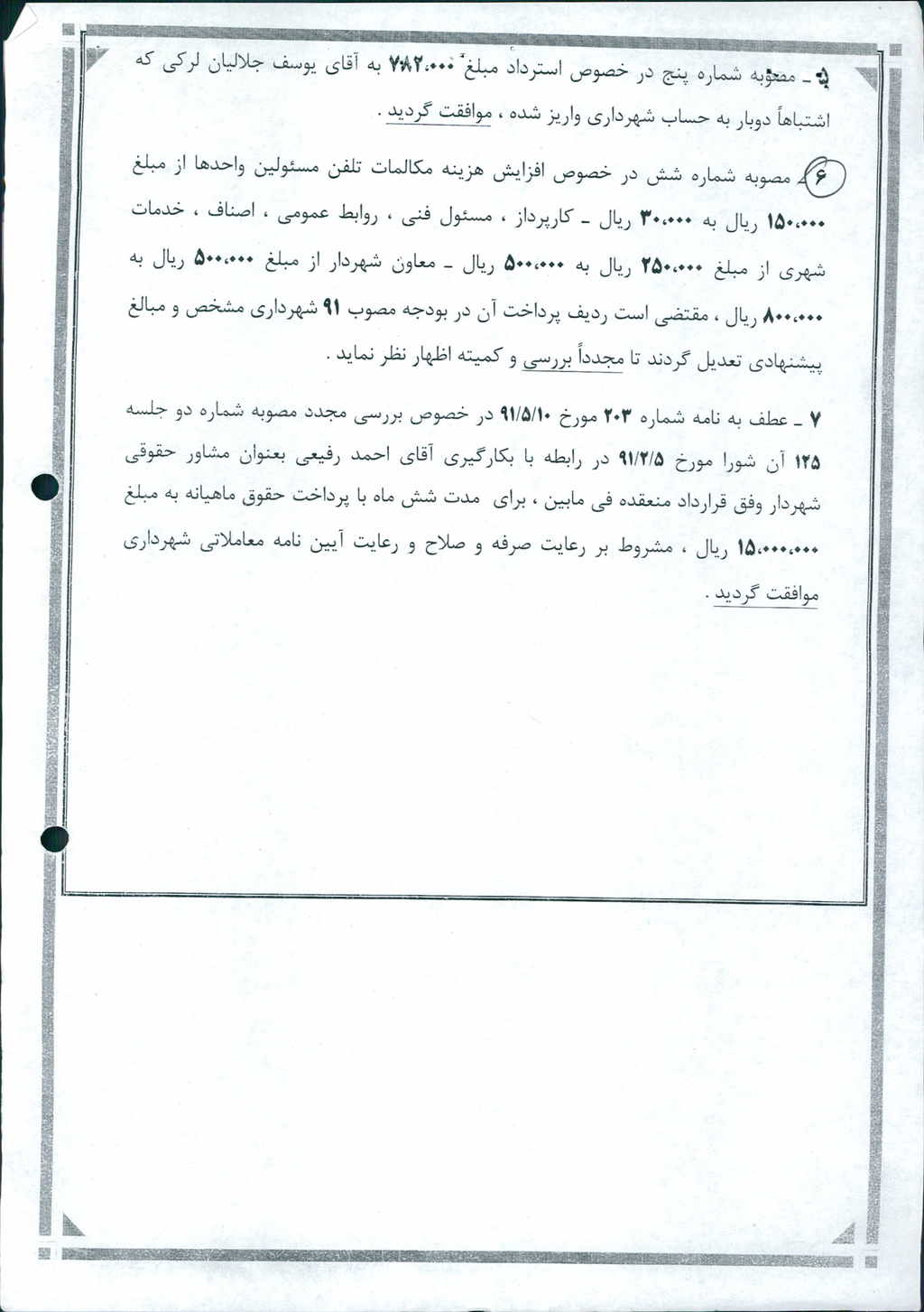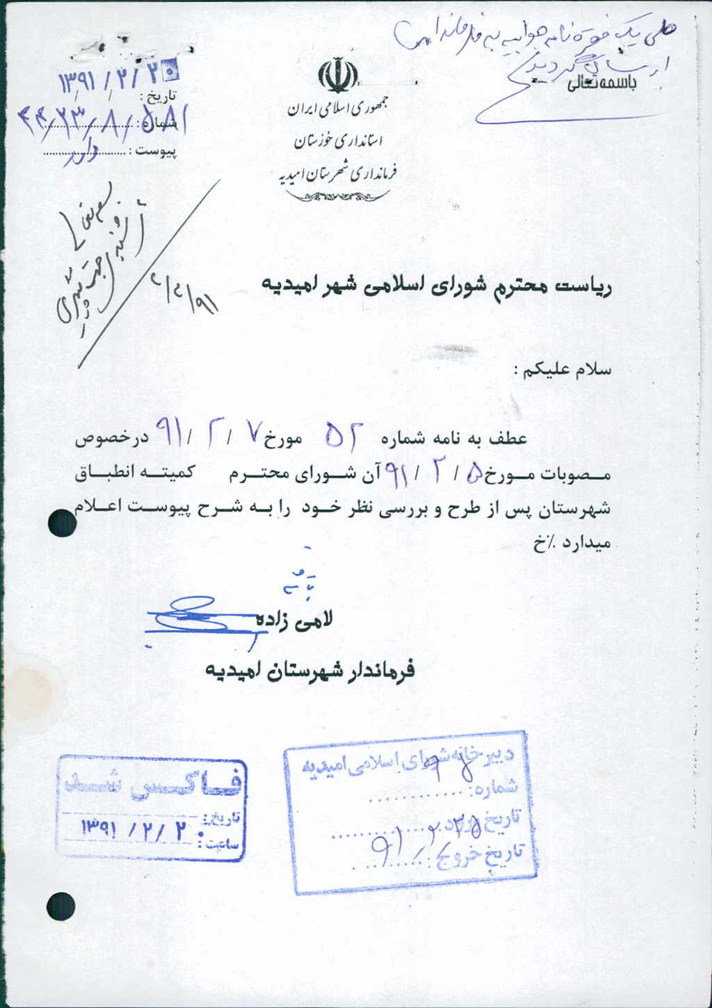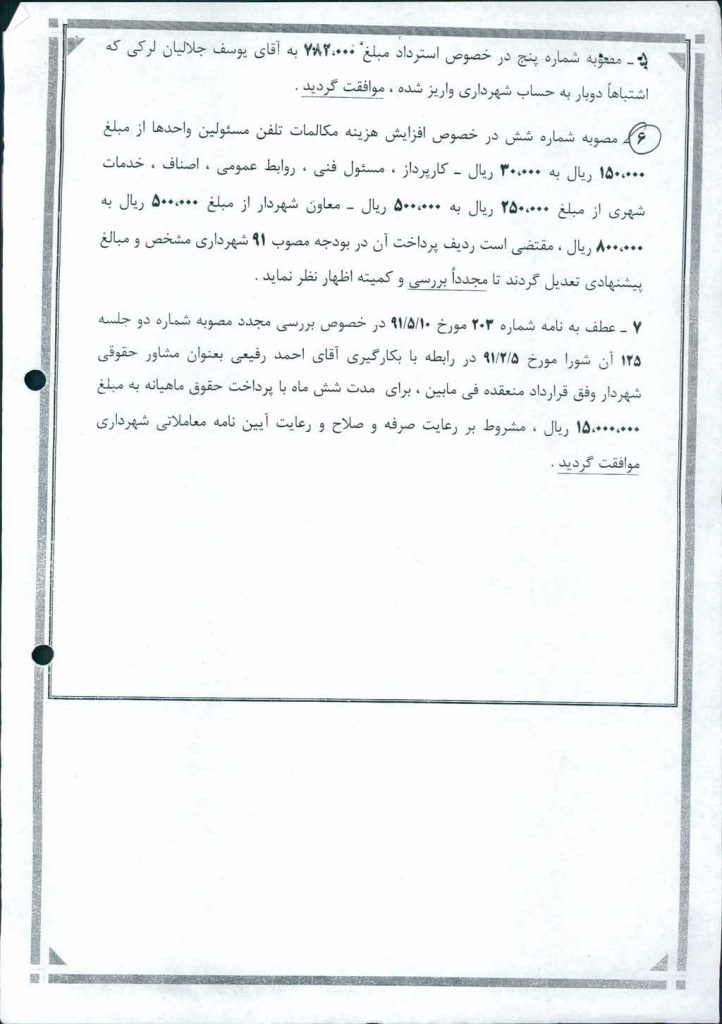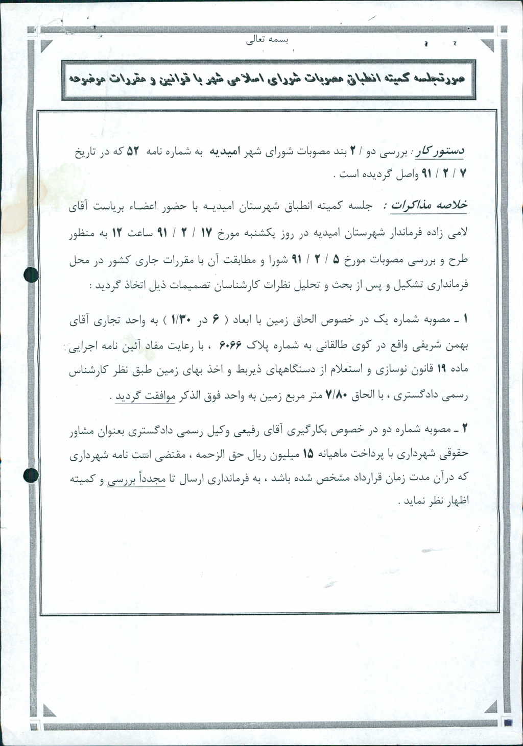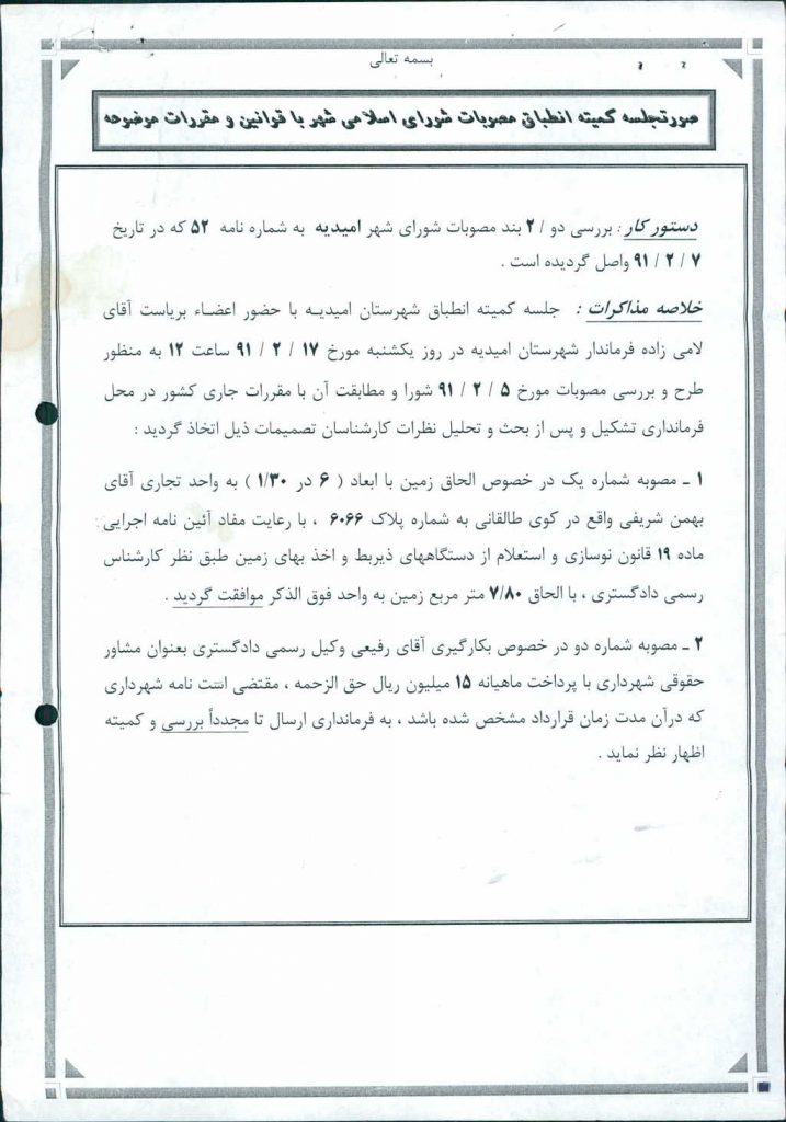 نظریه هیأت تطبیق جلسه ۱۲۵ مورخ ۹۱/۲/۵ شورای اسلامی شهر امیدیه