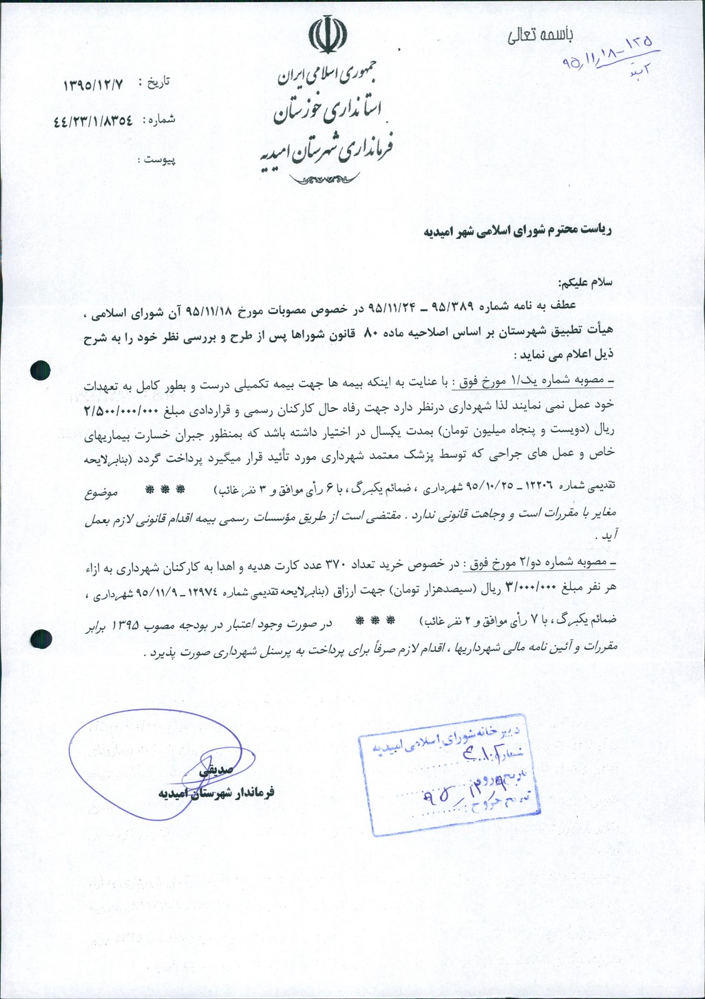 نظریه هیأت تطبیق جلسه ۱۲۵ مورخ ۹۵/۱۱/۱۸ شورای اسلامی شهر امیدیه