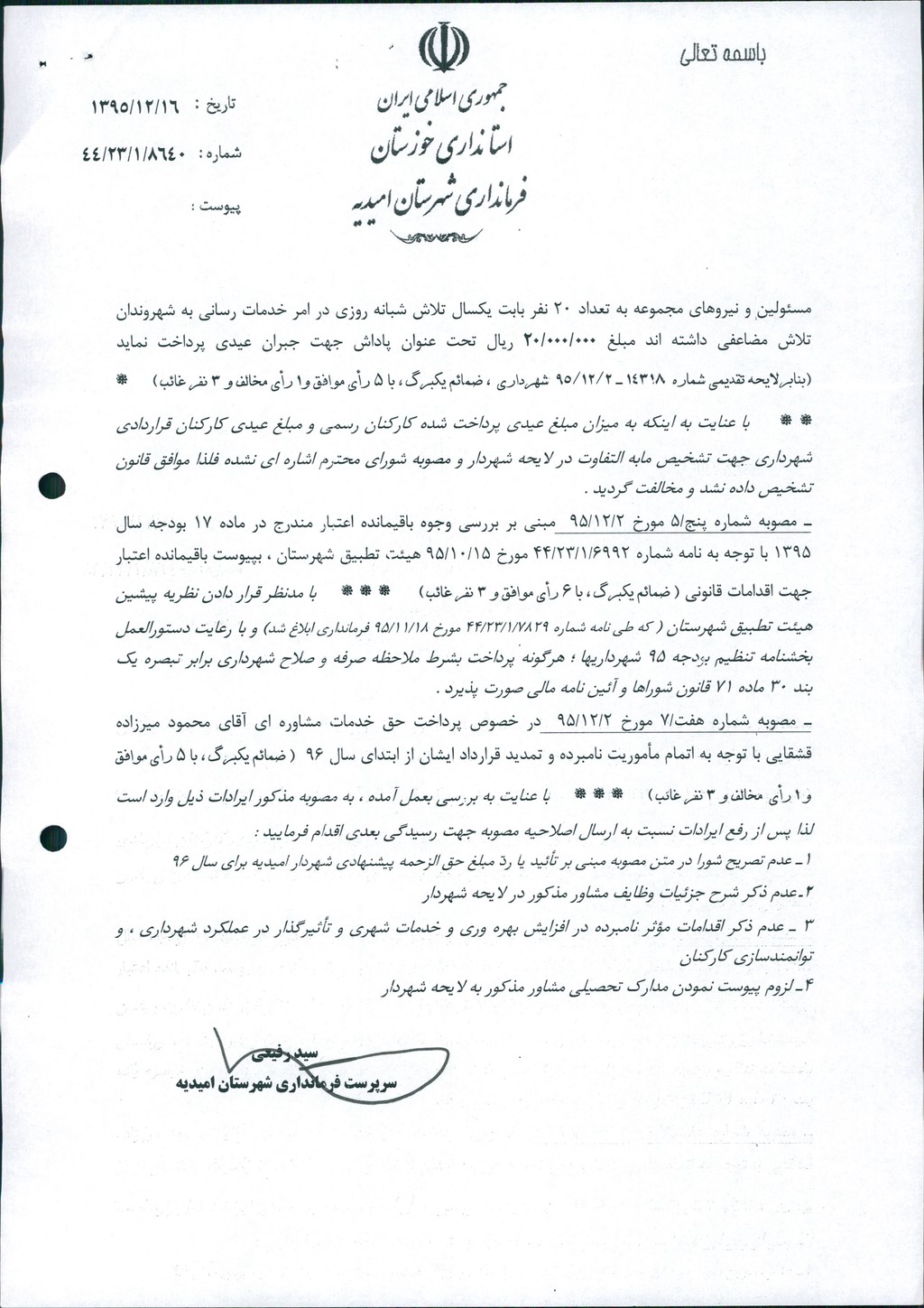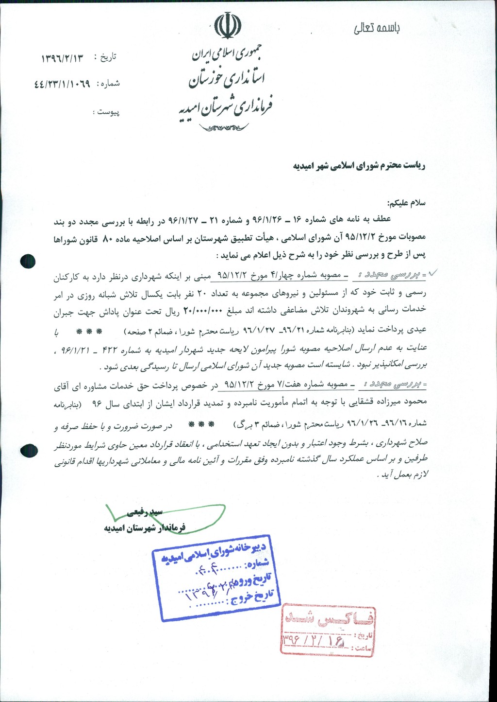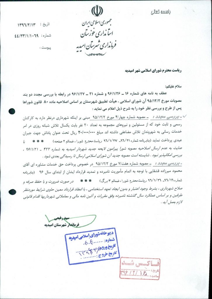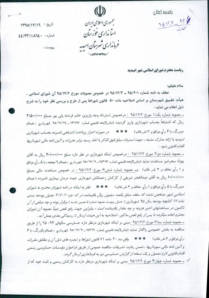 نظریه هیأت تطبیق جلسه ۱۲۶ مورخ ۹۵/۱۲/۲ شورای اسلامی شهر امیدیه