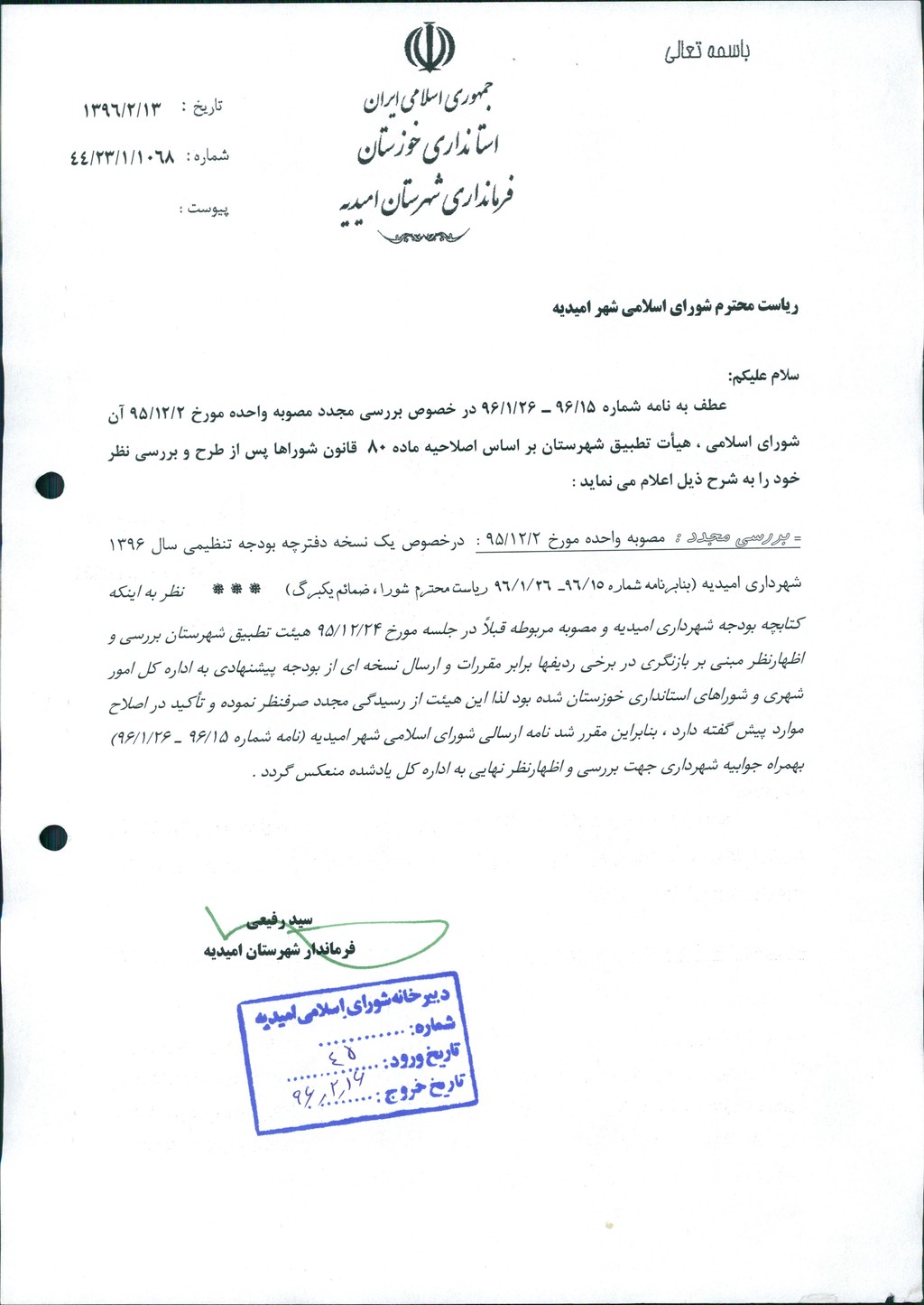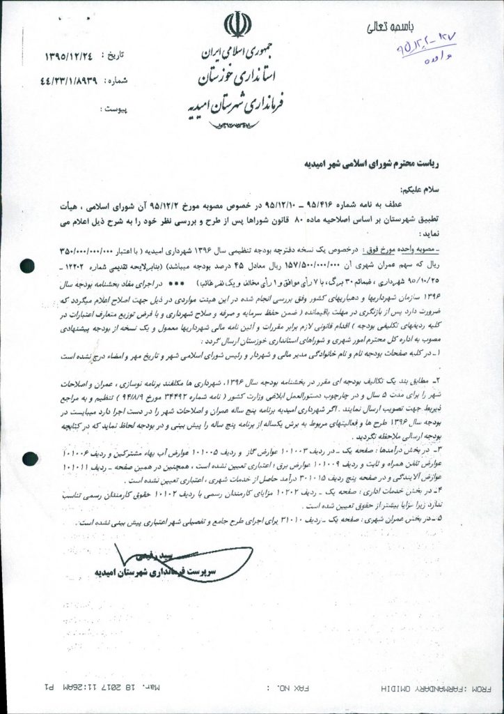 نظریه هیأت تطبیق جلسه ۱۲۷ مورخ ۹۵/۱۲/۲ شورای اسلامی شهر امیدیه