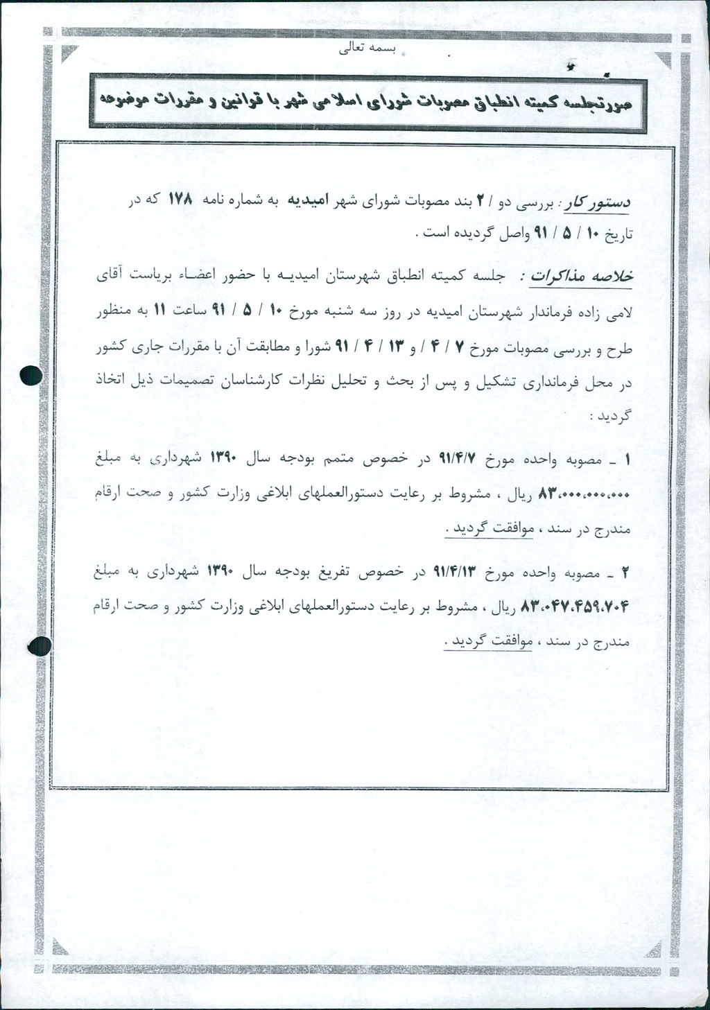 نظریه هیأت تطبیق جلسه ۱۳۰ مورخ ۹۱/۴/۷ شورای اسلامی شهر امیدیه
