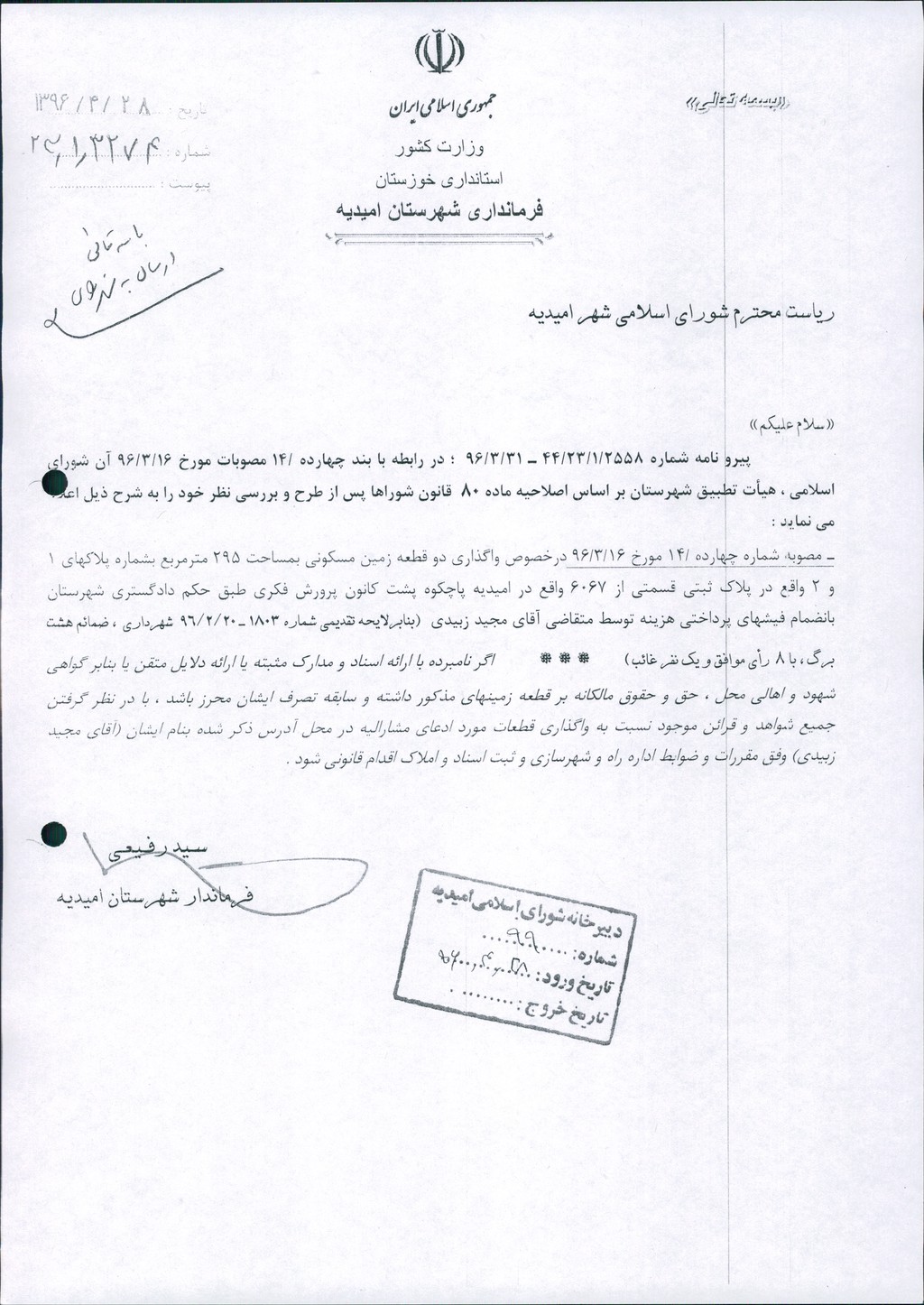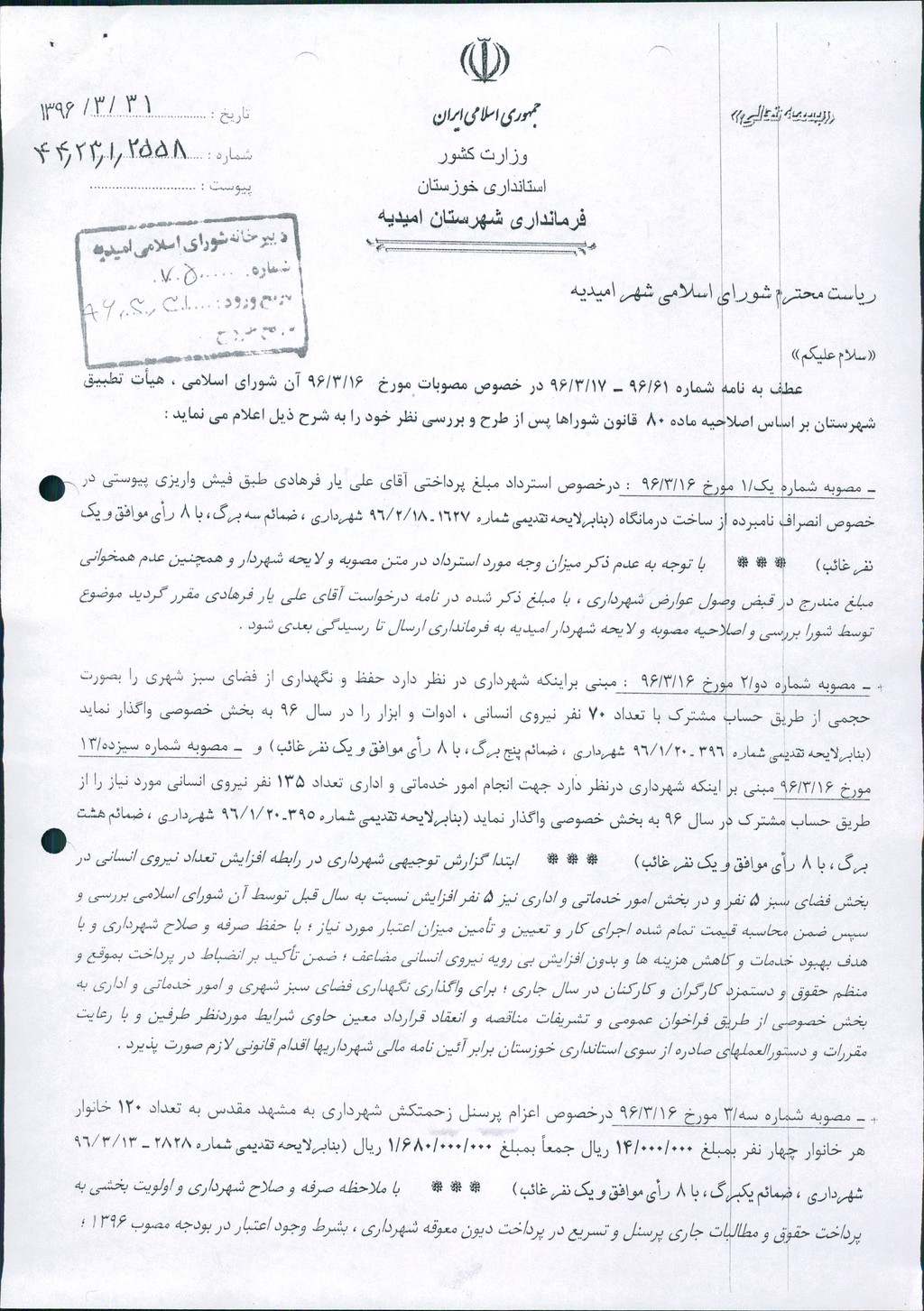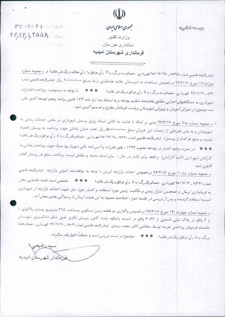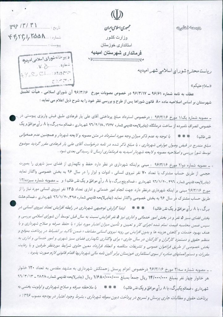 نظریه هیأت تطبیق جلسه ۱۳۱ مورخ ۹۶/۳/۱۶ شورای اسلامی شهر امیدیه
