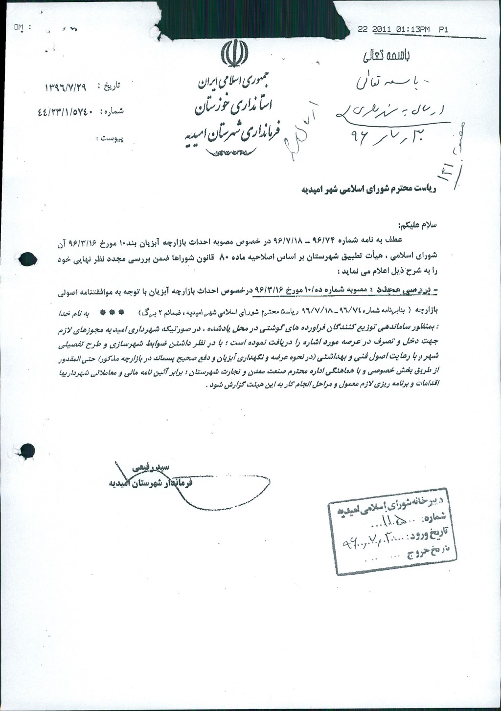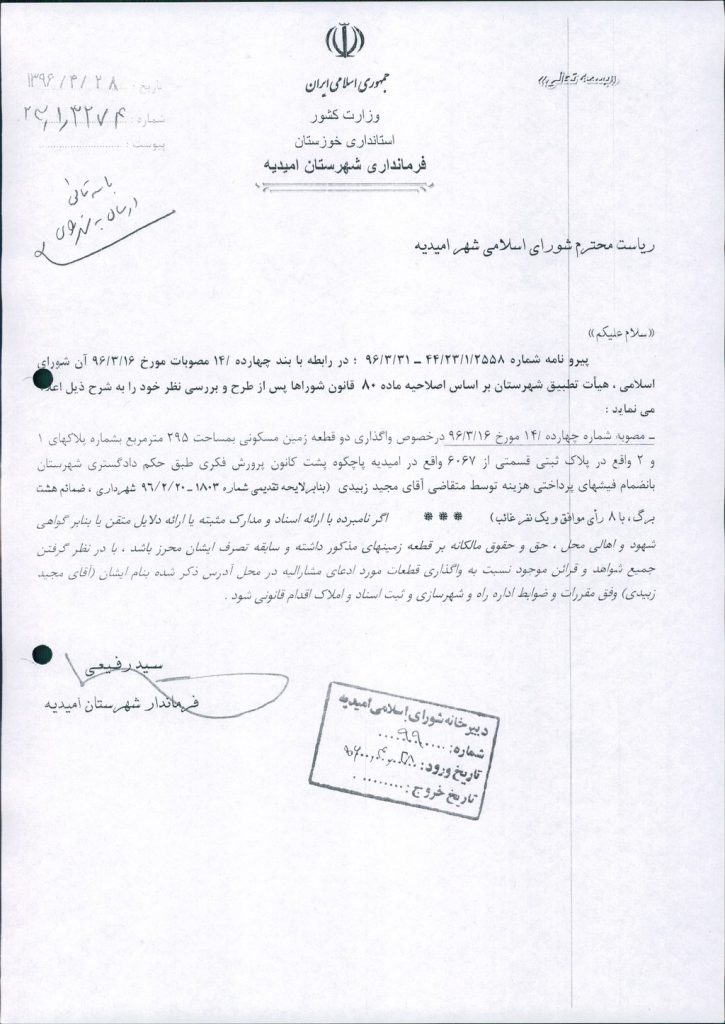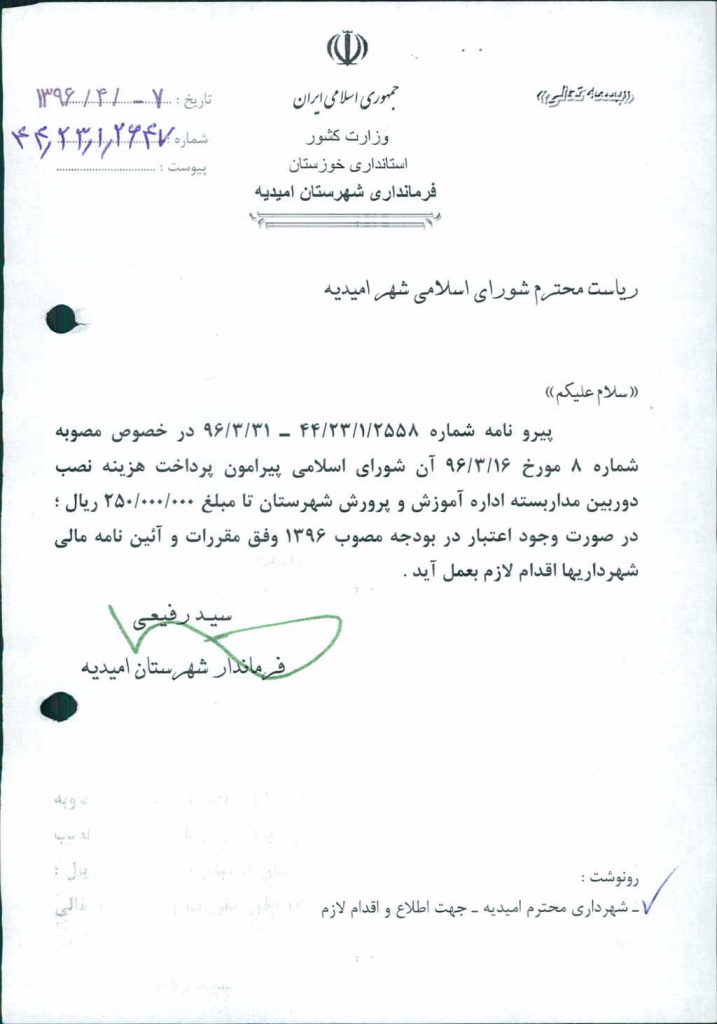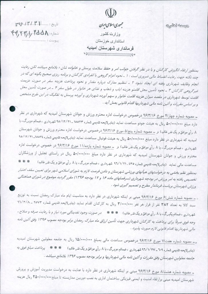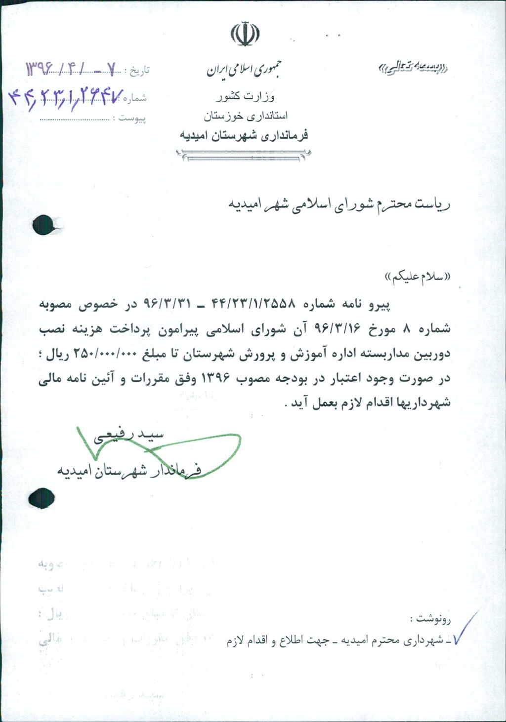 نظریه هیأت تطبیق جلسه ۱۳۱ مورخ ۹۶/۳/۱۶ شورای اسلامی شهر امیدیه