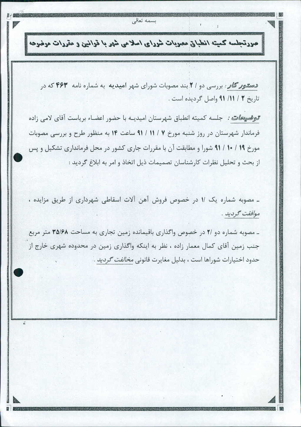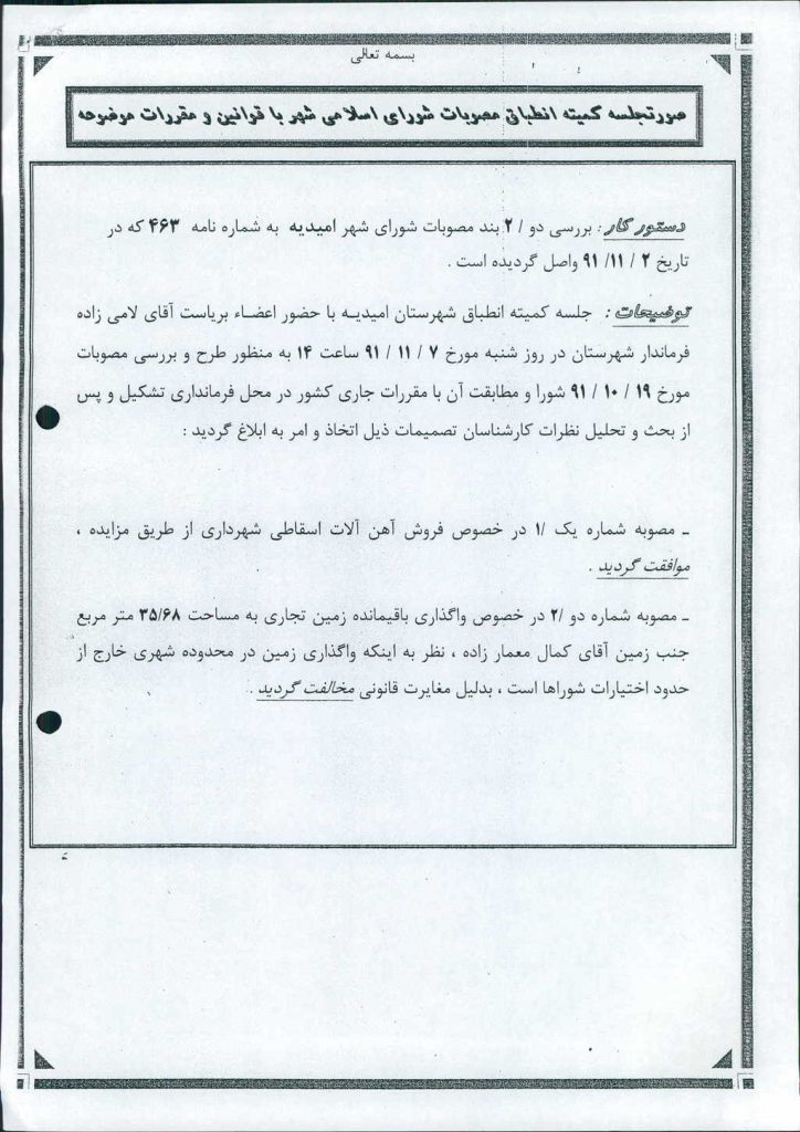 نظریه هیأت تطبیق جلسه ۱۴۵ مورخ ۹۱/۱۰/۱۹ شورای اسلامی شهر امیدیه
