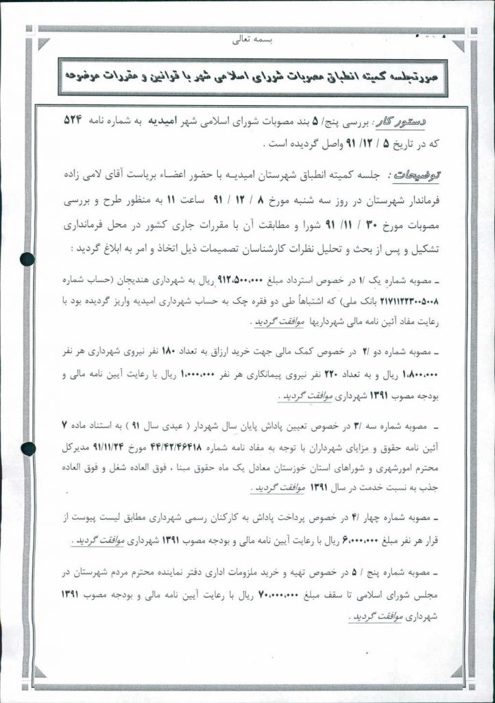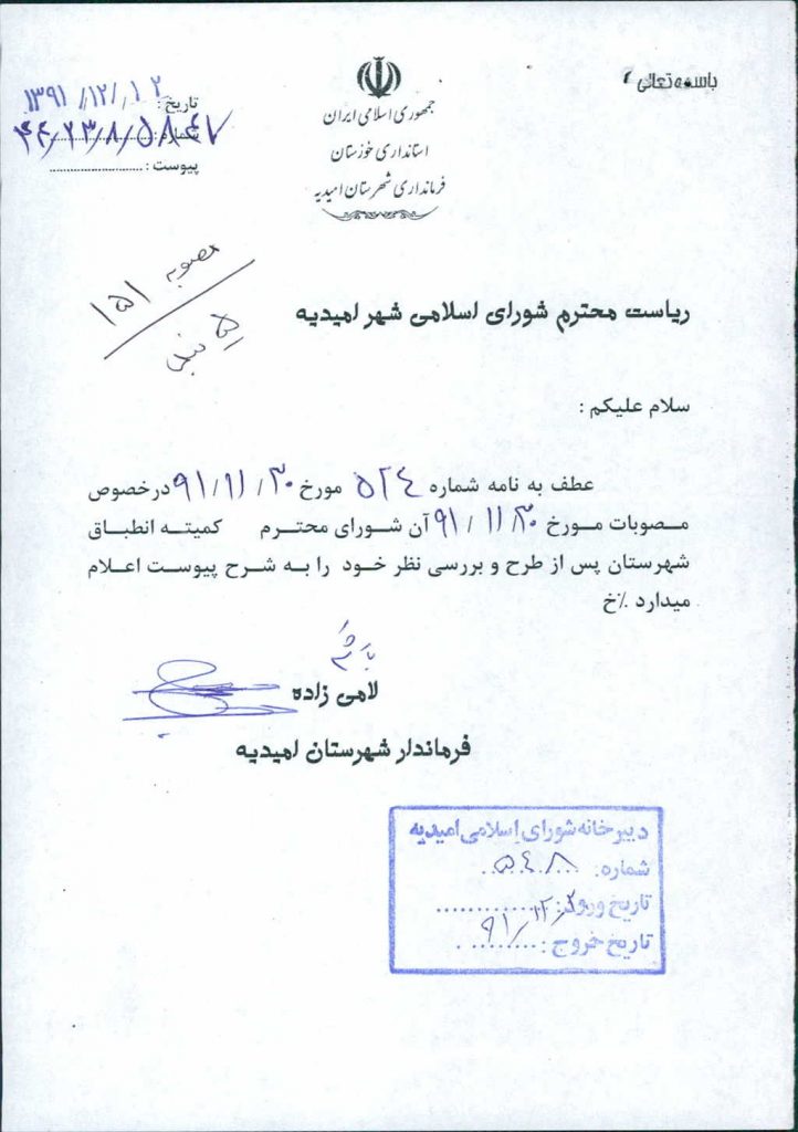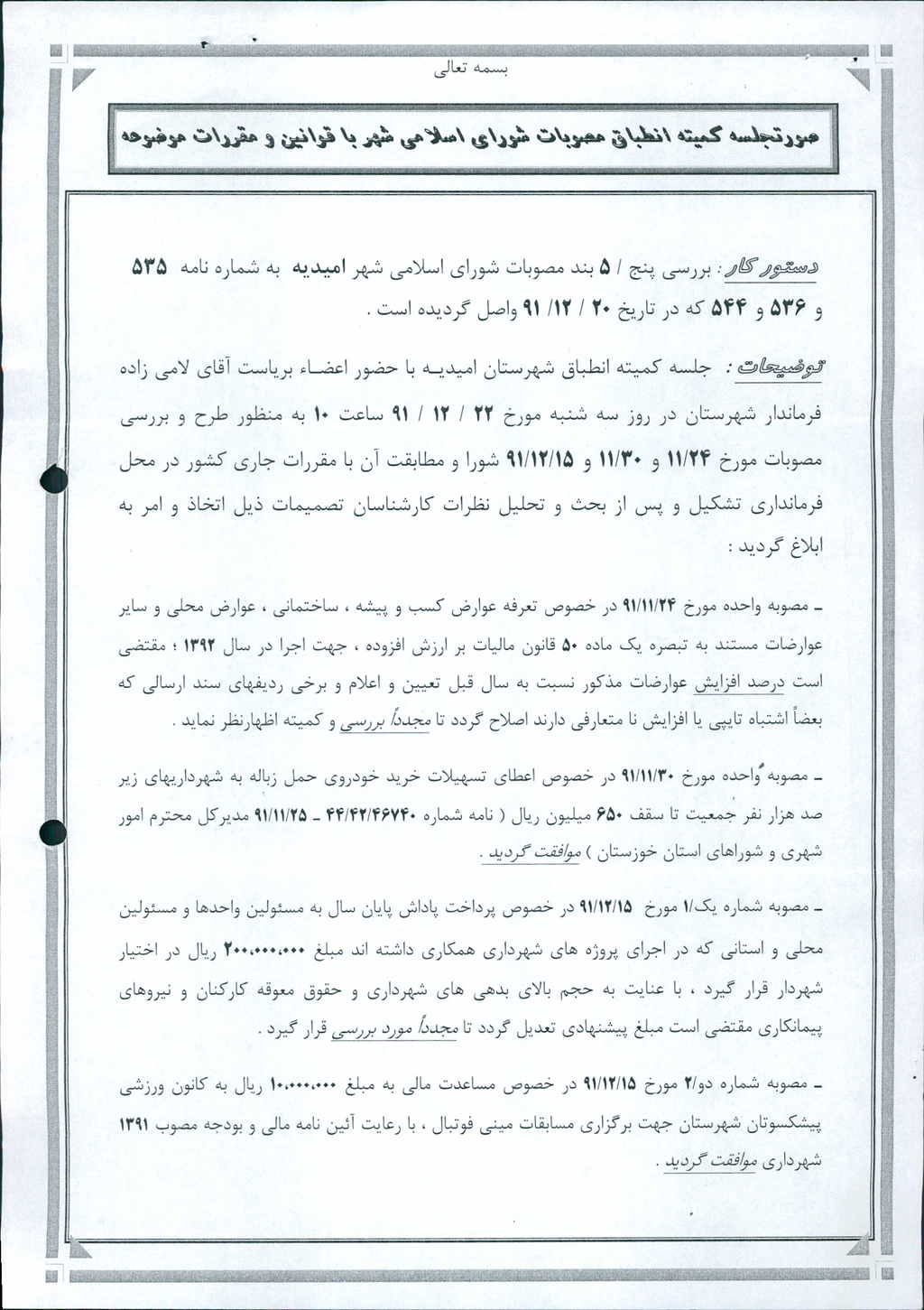 نظریه هیأت تطبیق جلسه ۱۵۱ مورخ ۹۱/۱۱/۳۰ شورای اسلامی شهر امیدیه