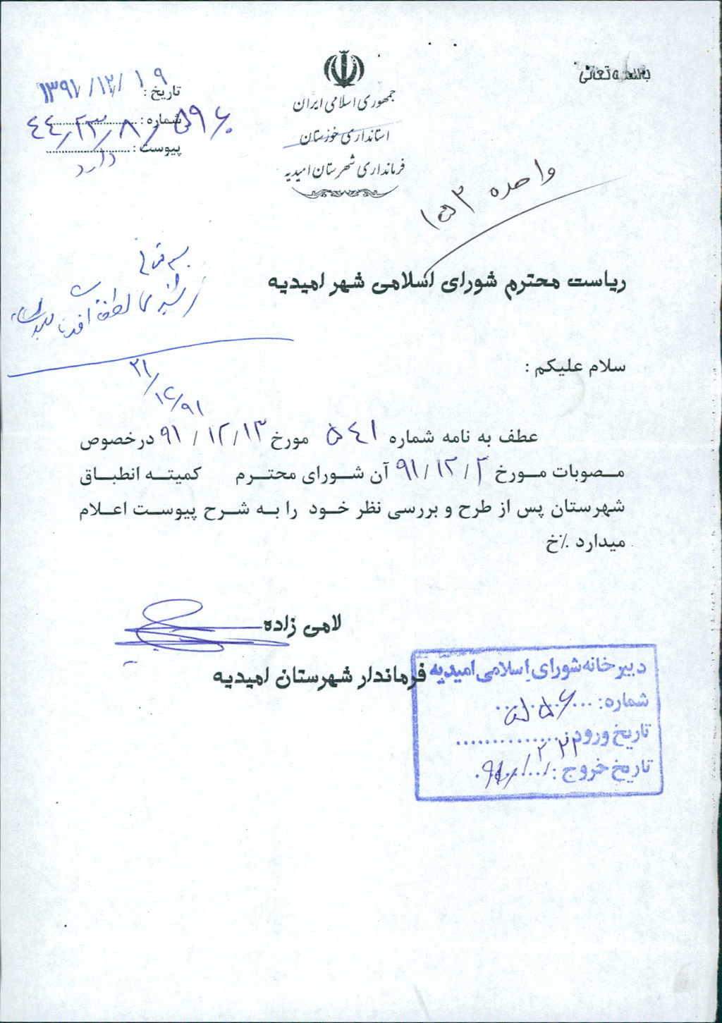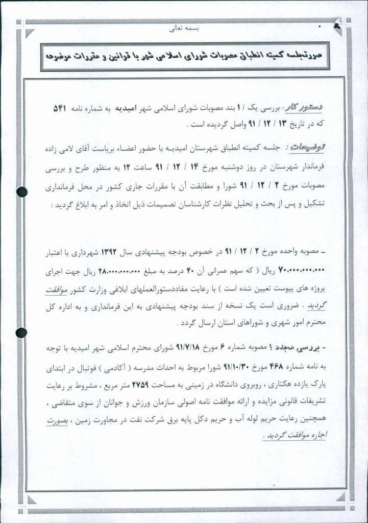 نظریه هیأت تطبیق جلسه ۱۵۲ مورخ ۹۱/۱۲/۲ شورای اسلامی شهر امیدیه