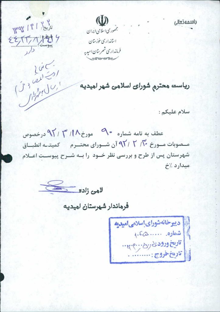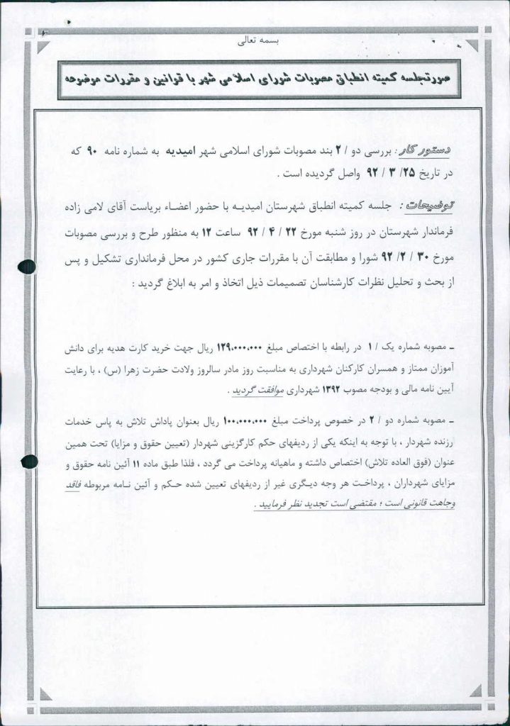 نظریه هیأت تطبیق جلسه ۱۵۶ مورخ ۹۲/۲/۱۰ شورای اسلامی شهر امیدیه