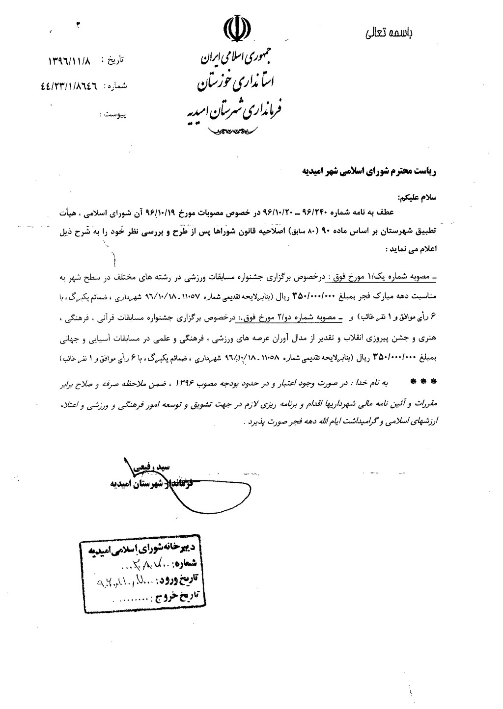 نظریه هیأت تطبیق جلسه ۱۸ مورخ ۹۶/۱۰/۱۹ شورای اسلامی شهر امیدیه