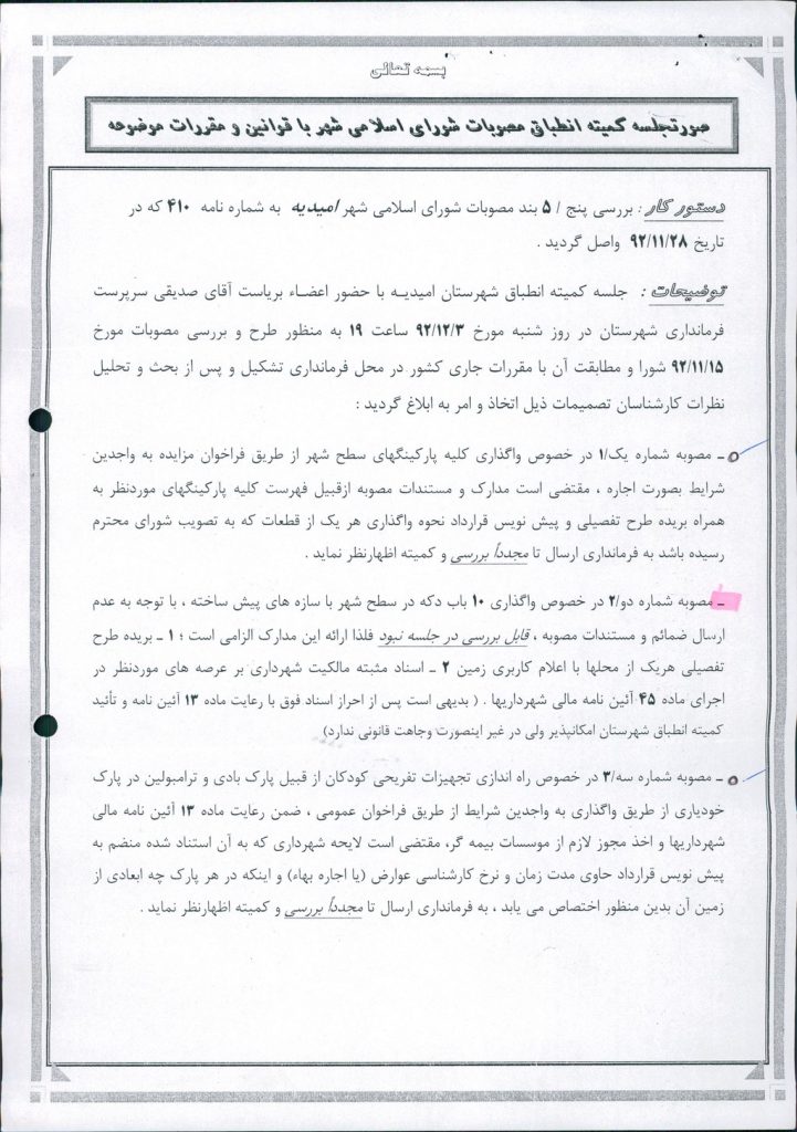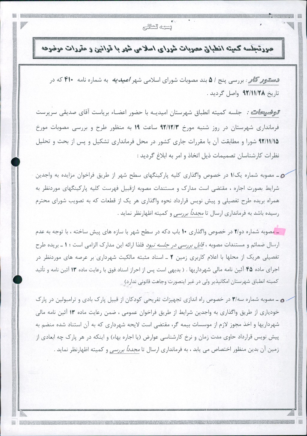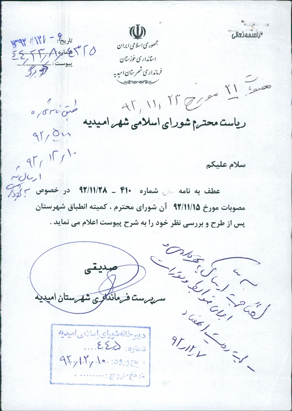 نظریه هیأت تطبیق جلسه ۲۱ مورخ ۹۲/۱۱/۱۵ شورای اسلامی شهر امیدیه