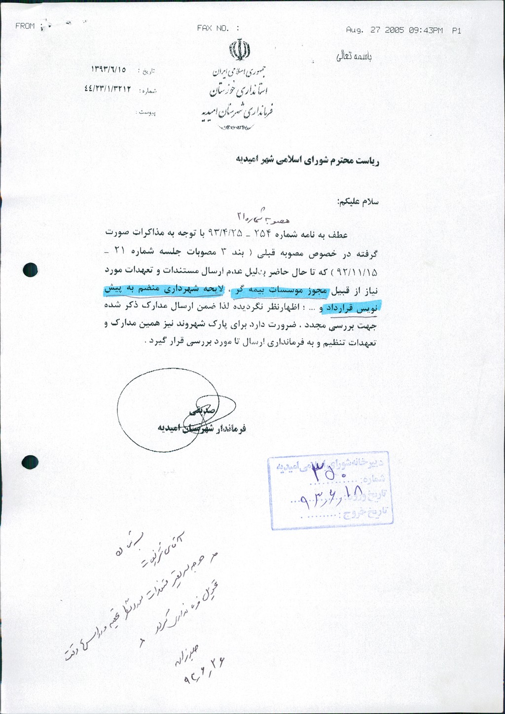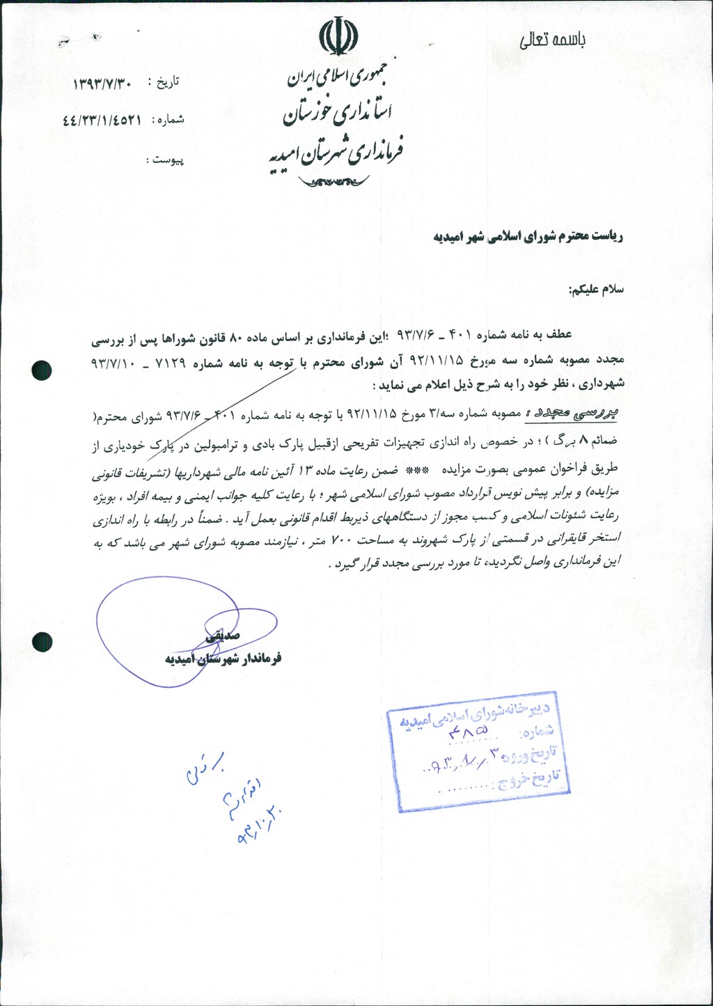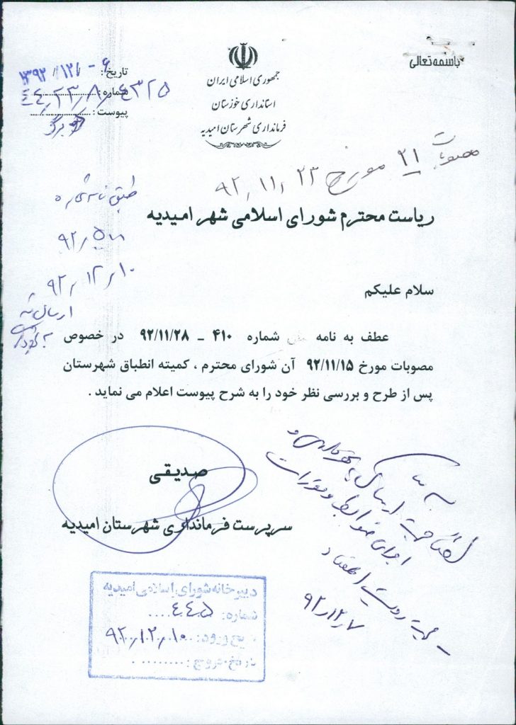 نظریه هیأت تطبیق جلسه ۲۱ مورخ ۹۲/۱۱/۱۵ شورای اسلامی شهر امیدیه