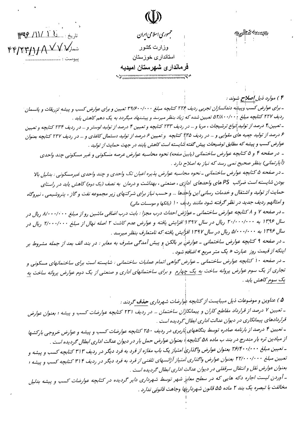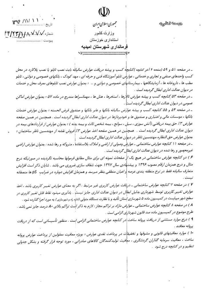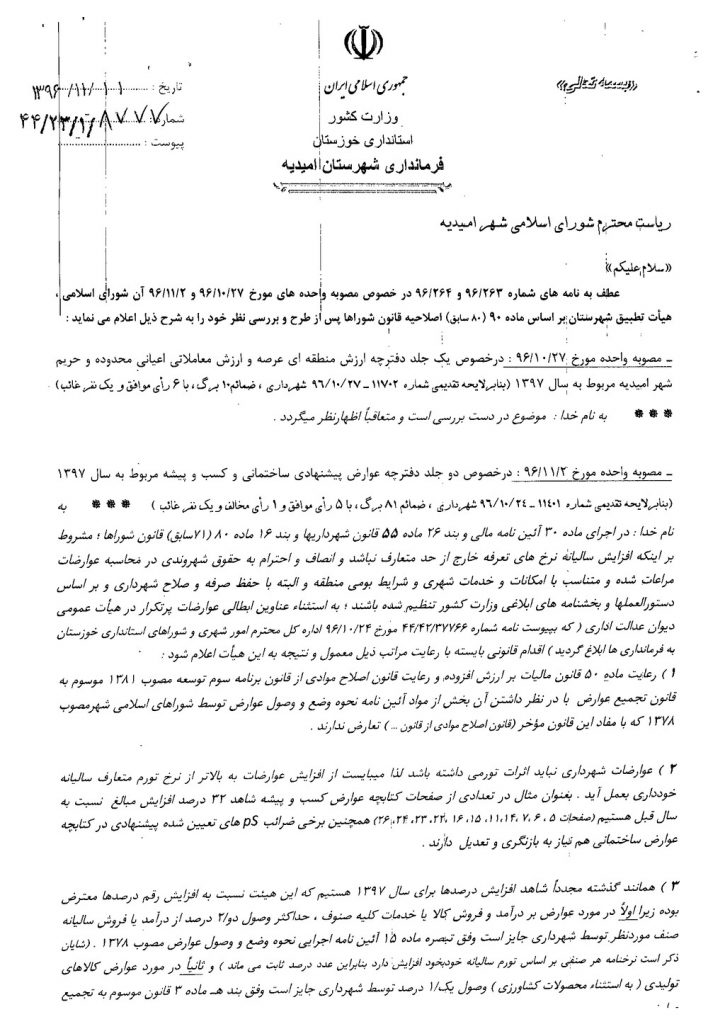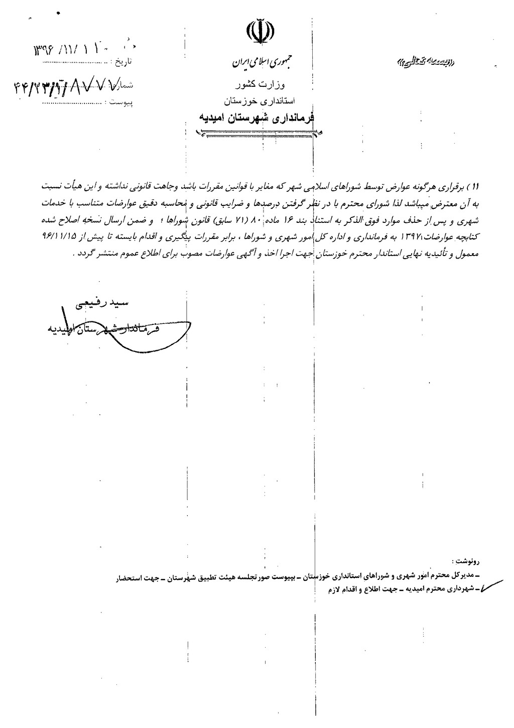 نظریه هیأت تطبیق جلسه ۲۱ مورخ ۹۶/۱۱/۲ شورای اسلامی شهر امیدیه