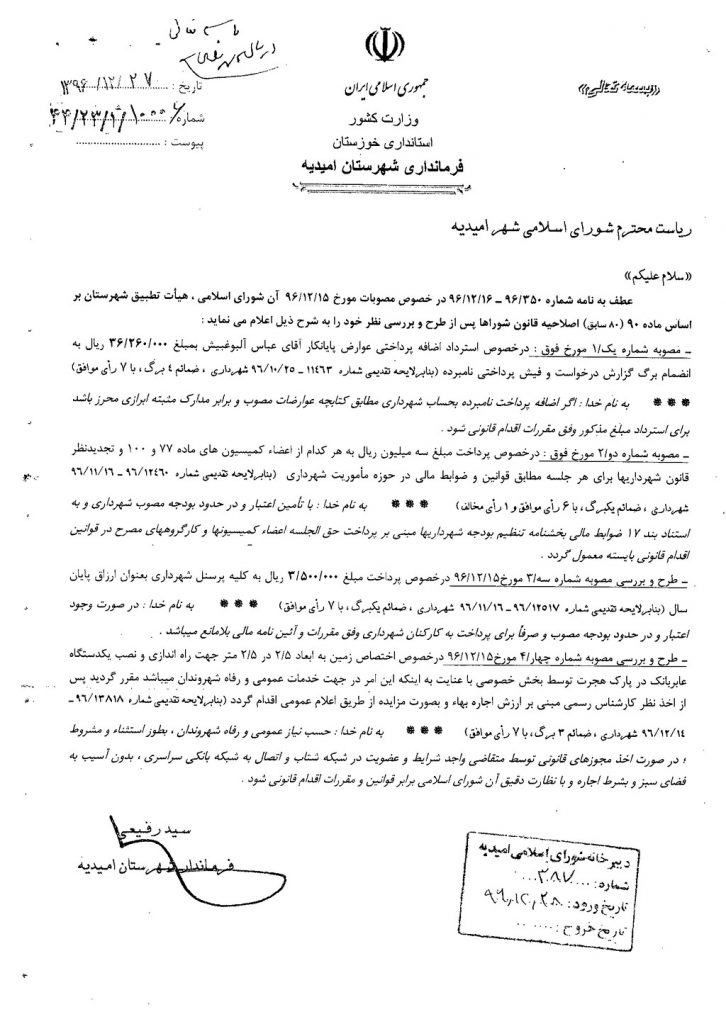 نظریه هیأت تطبیق جلسه ۲۵ مورخ ۹۶/۱۲/۱۵ شورای اسلامی شهر امیدیه