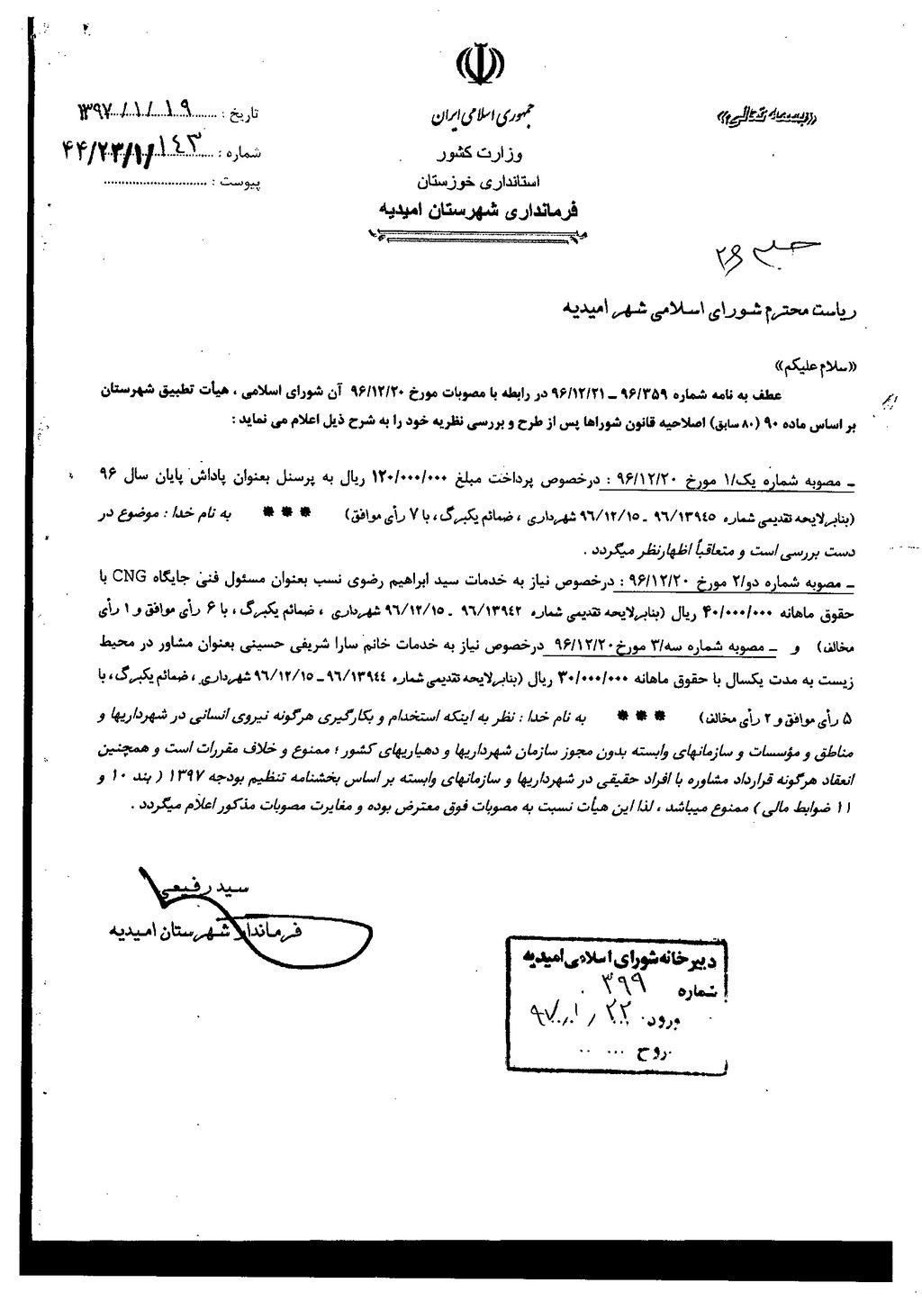نظریه هیأت تطبیق جلسه ۲۶ مورخ ۹۶/۱۲/۲۰ شورای اسلامی شهر امیدیه