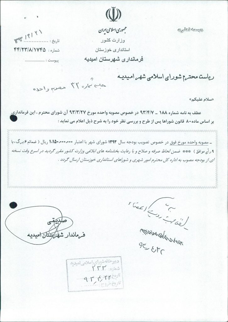 نظریه هیأت تطبیق جلسه ۳۲ مورخ ۹۳/۳/۲۷ شورای اسلامی شهر امیدیه