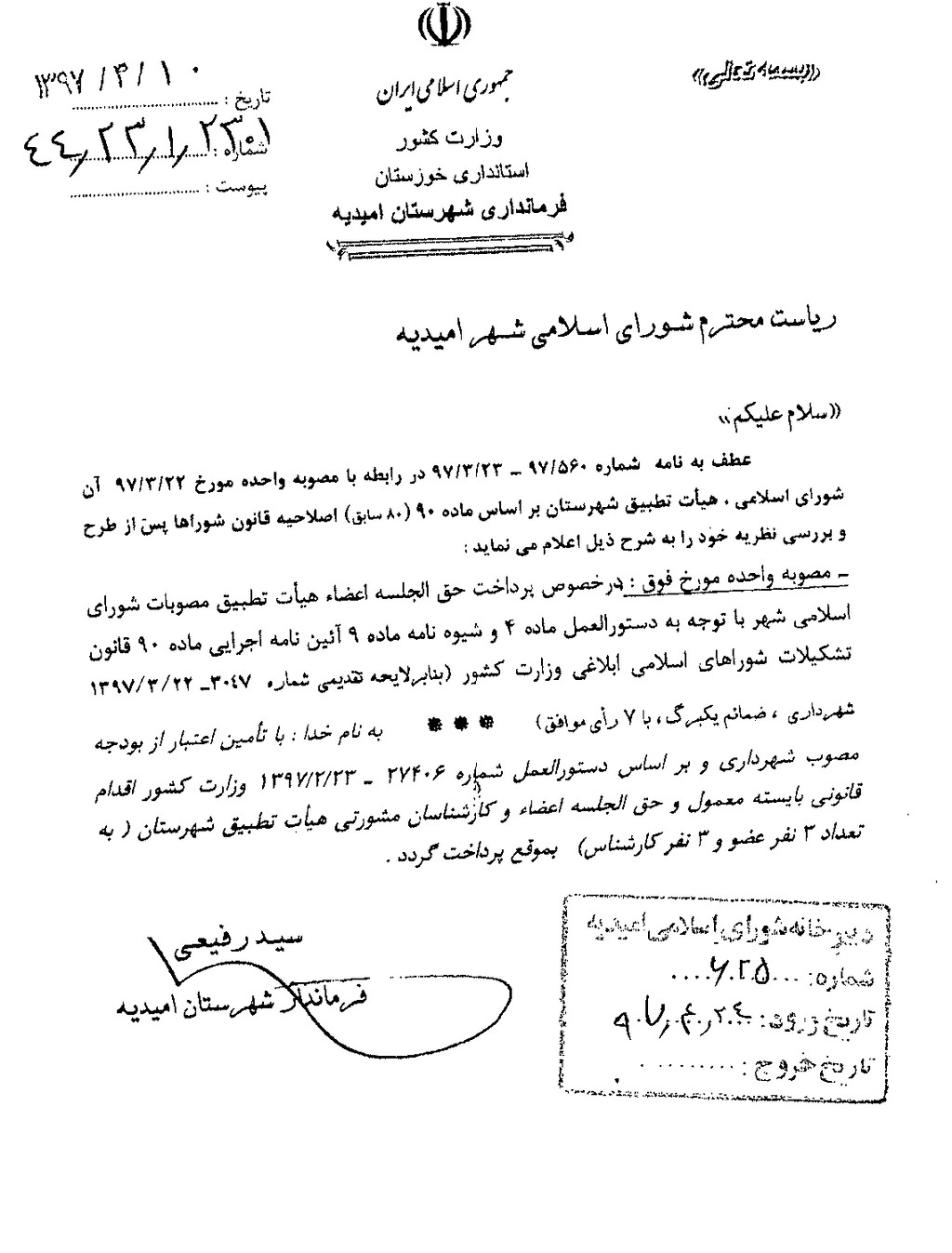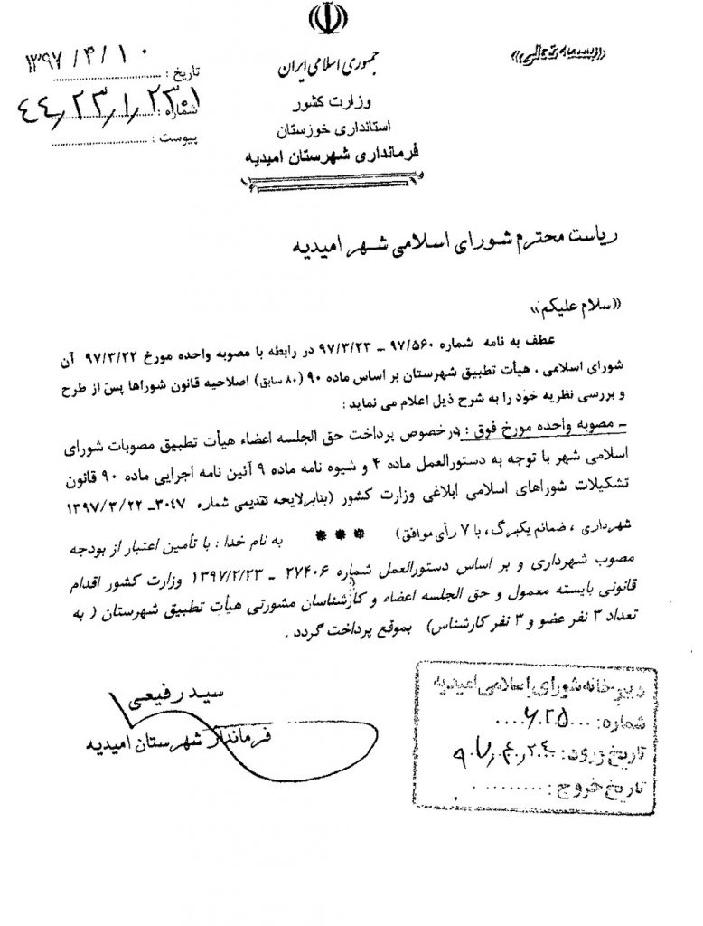 نظریه هیأت تطبیق جلسه ۳۳ مورخ ۹۷/۴/۱۰ شورای اسلامی شهر امیدیه