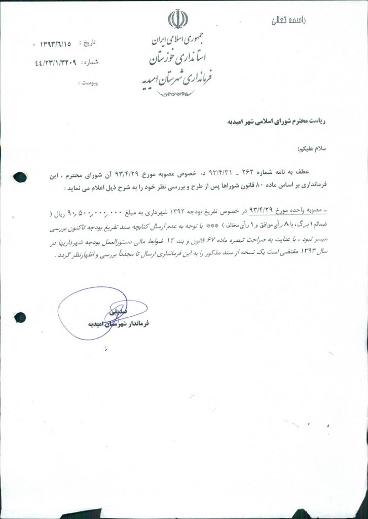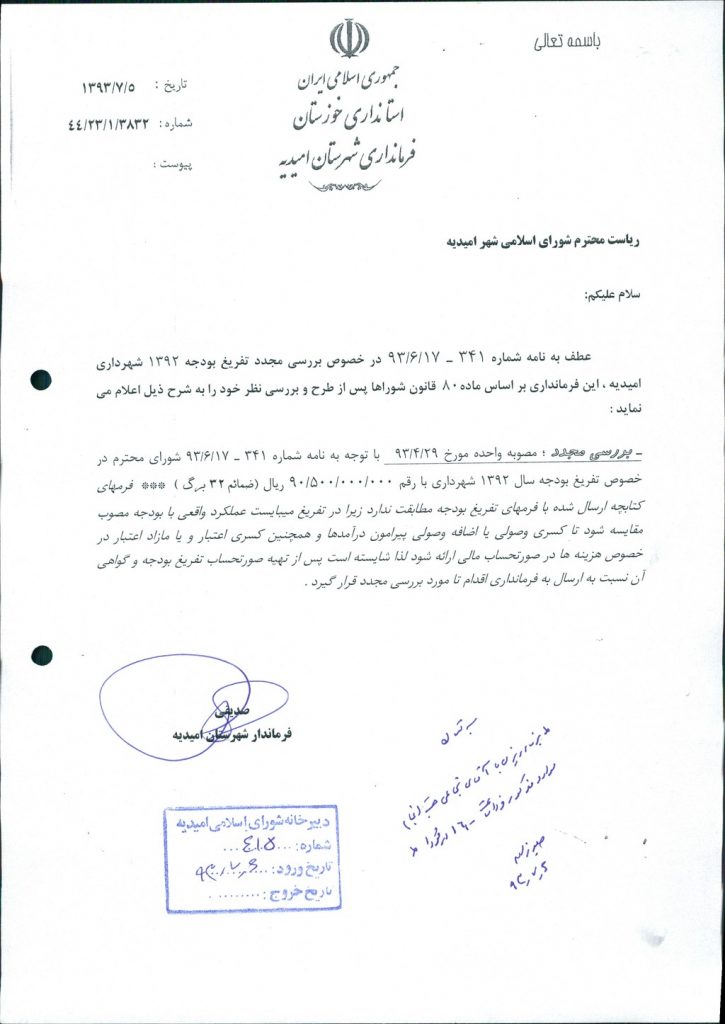نظریه هیأت تطبیق جلسه ۳۵ مورخ ۹۳/۴/۲۹ شورای اسلامی شهر امیدیه
