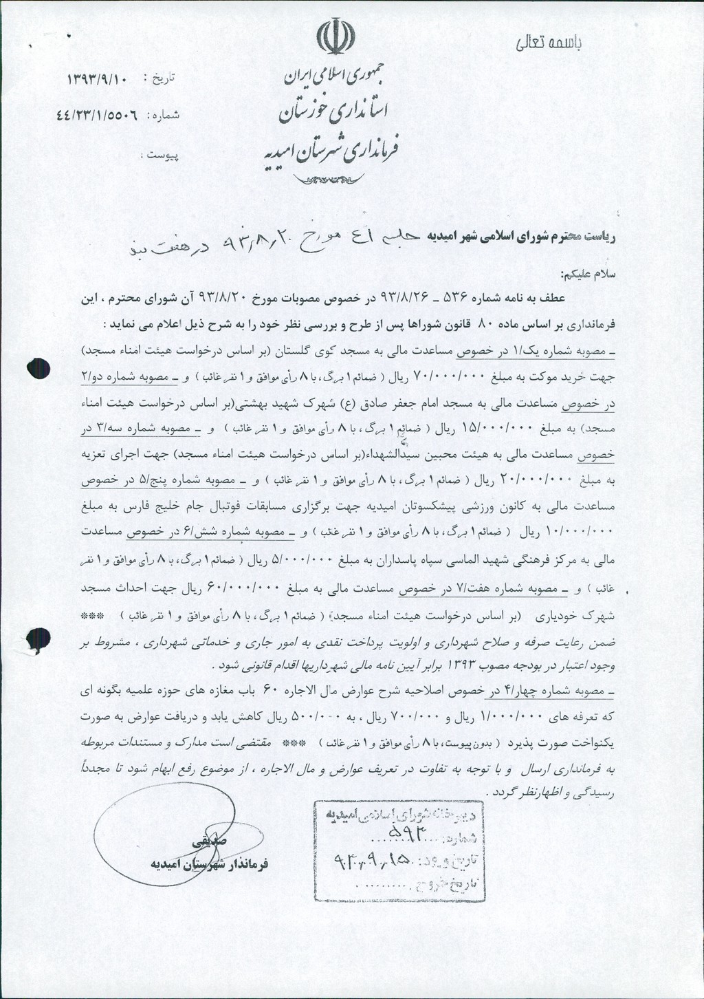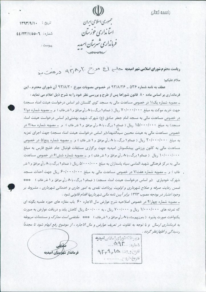 نظریه هیأت تطبیق جلسه ۴۱ مورخ ۹۳/۸/۲۰ شورای اسلامی شهر امیدیه