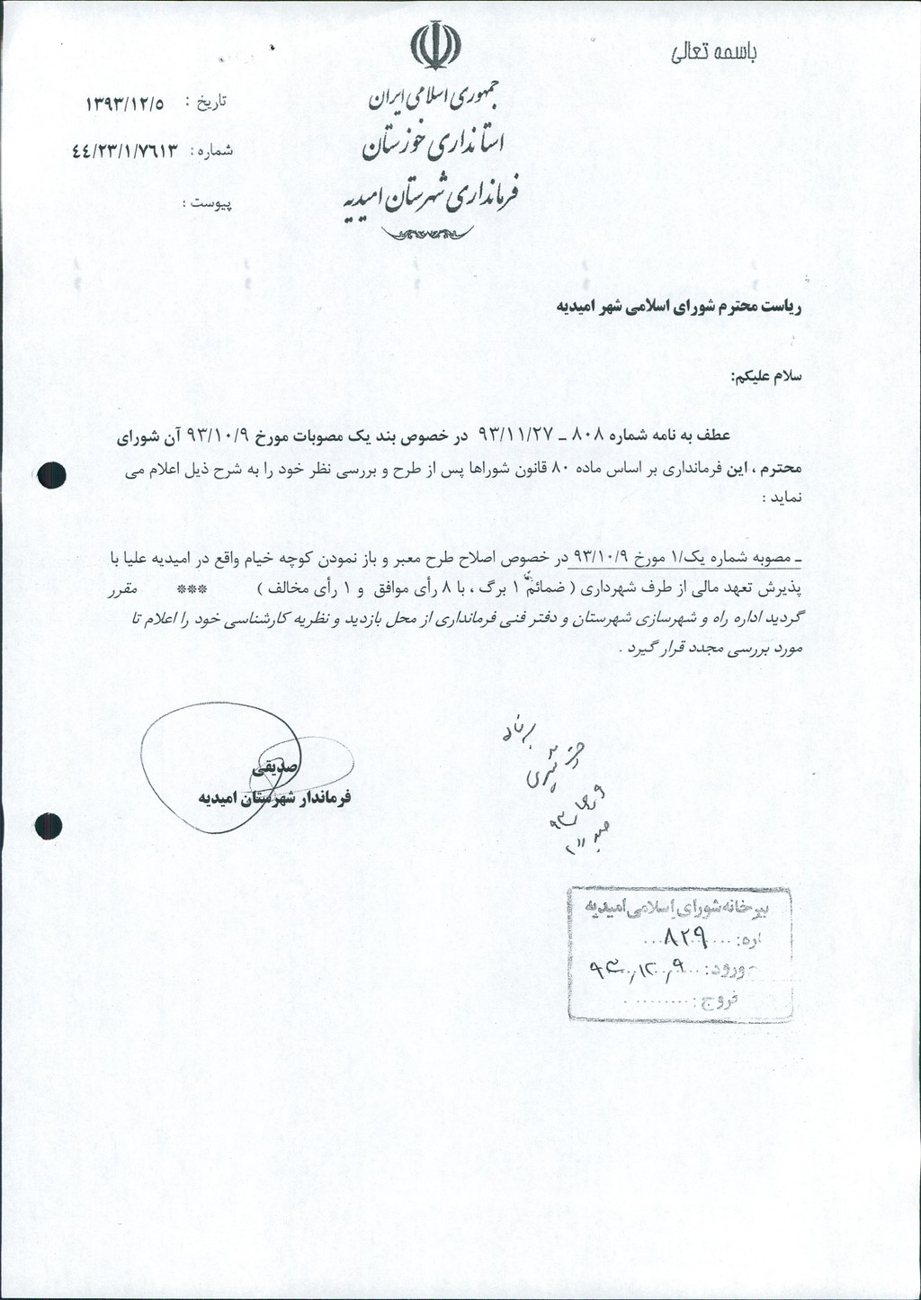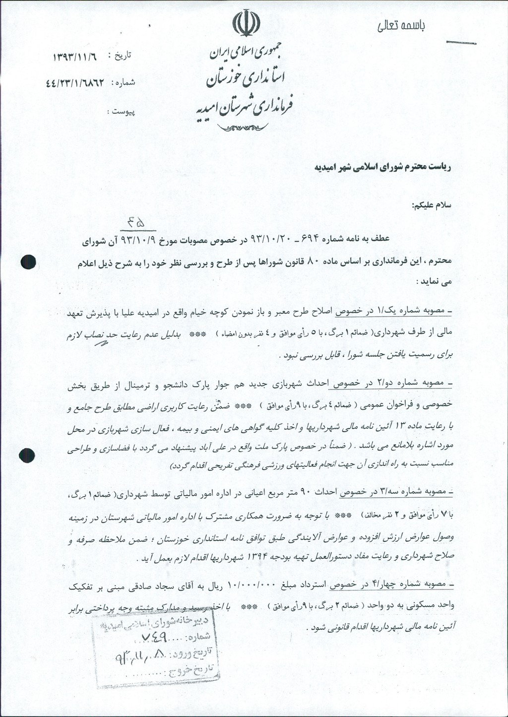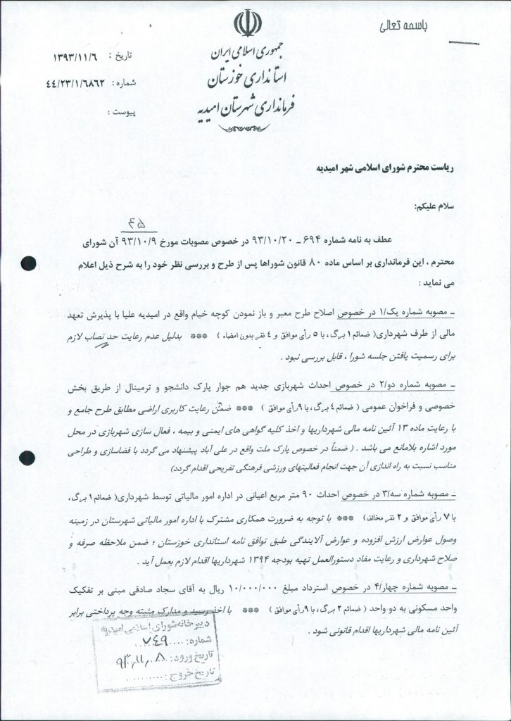 نظریه هیأت تطبیق جلسه ۴۵ مورخ ۹۳/۱۰/۹ شورای اسلامی شهر امیدیه