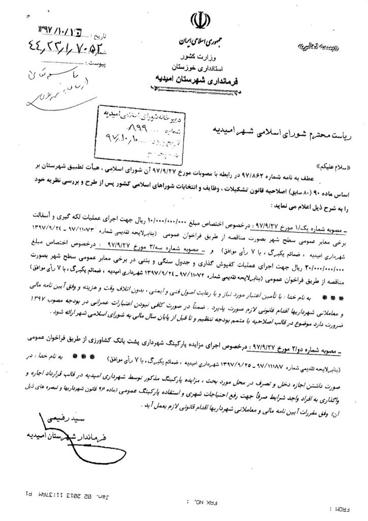 نظریه هیأت تطبیق جلسه ۴۸ مورخ۹۷/۹/۲۷ شورای اسلامی شهر امیدیه