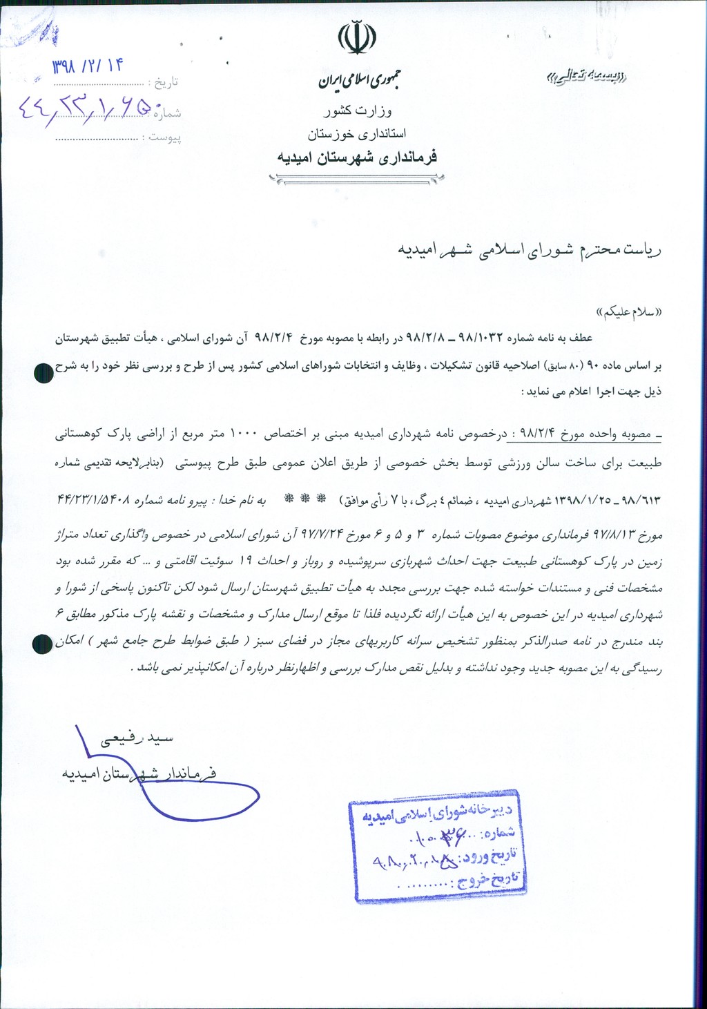نظریه هیأت تطبیق جلسه ۶۲ مورخ ۹۸/۲/۱۴ شورای اسلامی شهر امیدیه